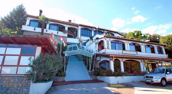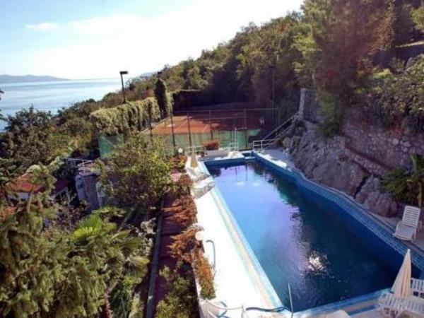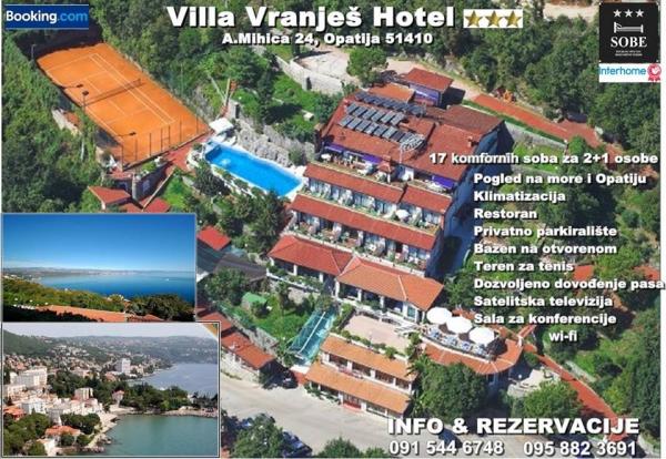 VILLA VRANJEŠ smještena je u mirnom je dijelu znamenite Opatije, kraljice hrvatskog turizma, sa savršenim pogledom na cijeli Kvarnerski zaljev. Od samih plaža dijeli je tek stotinjak metara, a u blizini je i sam centar Opatije, kao i svi potrebni sadržaji. Villa ima 10 soba - dvokrevetne s pomocnim lezajem (kauc na razvlacenje). Sobe su prostrane, suvremeno uređene i klimatizirane, s TV-om, kupaonicom i terasom. Gosti imaju na raspolaganju jedinstvenu ponudu: korištenje raskošnog vanjskog bazena, tenisko igralište, wi fi, besplatna parkirna mjesta, sve uključeno u cijenu. Parkirlište može primiti i autobuse. Najbliža autobusna u neposrednoj je blizini objekta. U cijenu noćenja uključen je i buffet doručak. Villa Vranjes is situated in a quiet part of Opatija, famous Croatian tourist center, with a breathtaking view on the Kvarner Bay. First beaches are about hundred meters away and the Opatija very center is also nearby. From here guests can easyily access to all interesting destinations that Opatija has to offer. It has 10 rooms (double with extra bed - sofa). Each room has air conditioner, TV, own bathroom and terrace. Villa has an unique offer: XXL outdoor swimming pool, tennis court, Wi-Fi, free parking spaces, all included in the price. Parking can accommodate even buses. Price includes buffet breakfast also. For further questions and reservations please contact us
