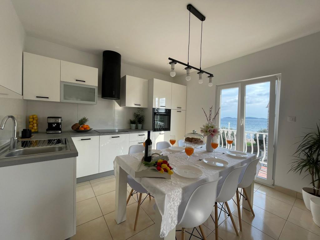 Apartman je smješten prvi red uz more,sadrži se od tri dvokrevetne sobe,dvije kupaone i dvije kuhinje,na prvom katu kuće je. Kuhinja i dvije sobe imaju balkon i pogled na more. Kuhinje su opremljene. Isprd kuće je terasa. Pokretni roštilj gosti imaju na korištenje.