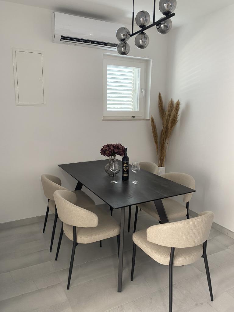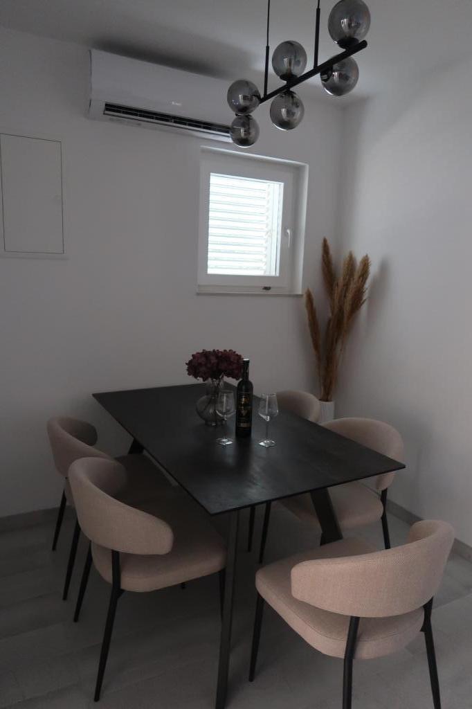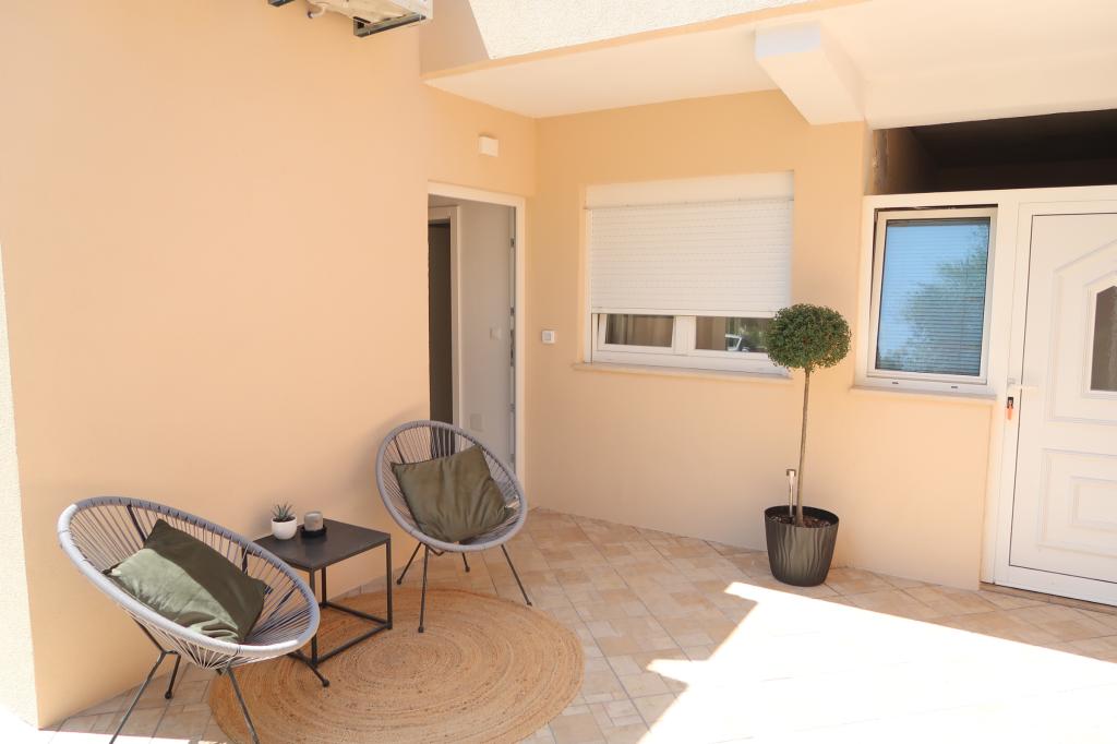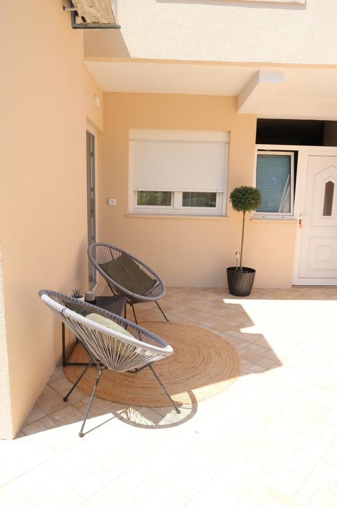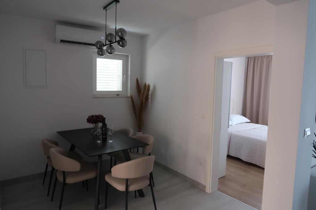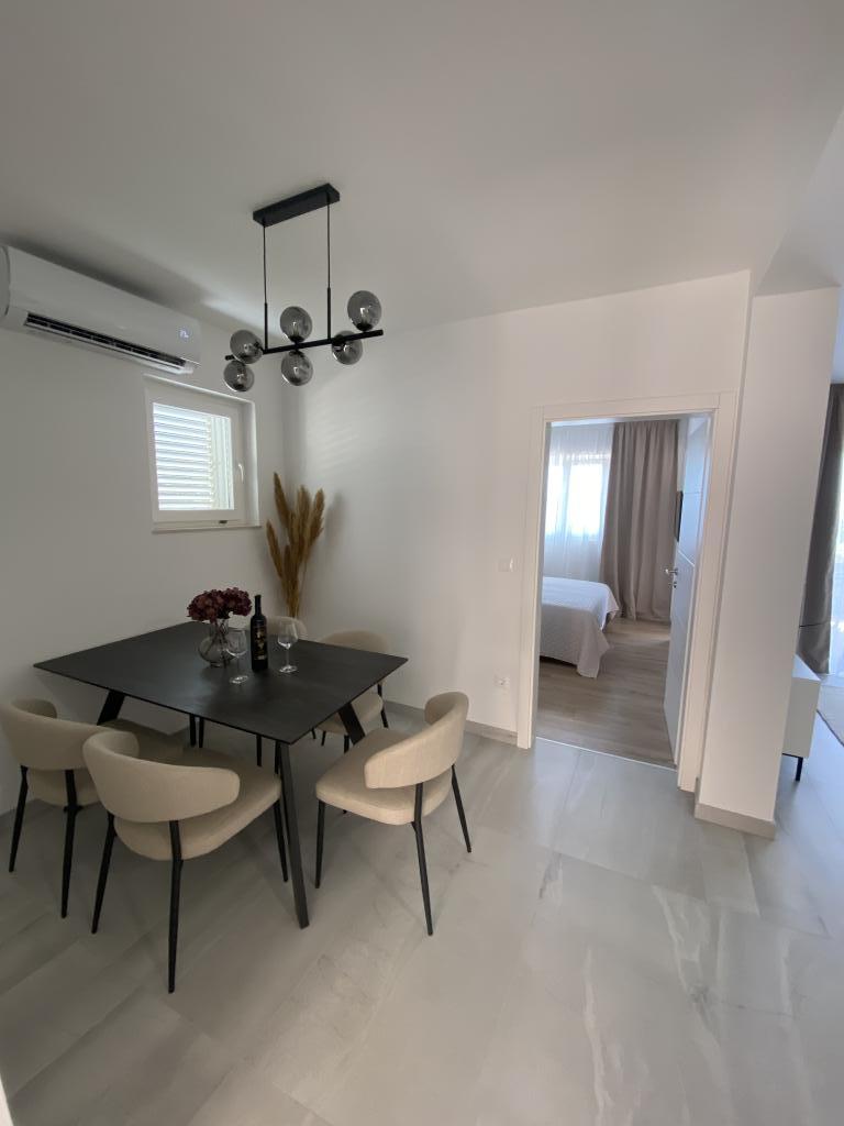Kompletno opremljen i novouređen apartman. Smješten je 2 minute hoda od plaže i 5 minuta hoda od centra. Prva trgovina se nalazi 30m od objekta. U centru se nalazi restoran, kafić, ribarnica, tržnica, banka, pekara,... Smještaj uključuje besplatan parking i WI-FI. U sklopu objekta se nalazi komin na kojem je moguće ispeći roštilj. Apartman ima 2 terase, jedna ispred ulaznih vrata s dvije fotelje za odmor, a druga na južnoj strani s pogledom na more.