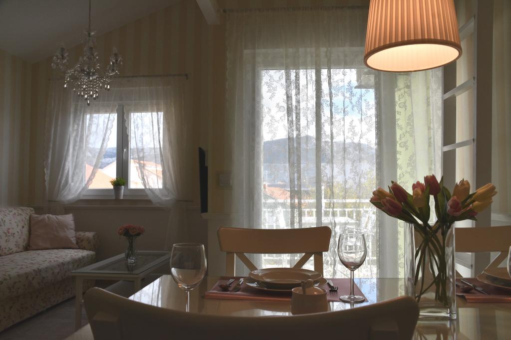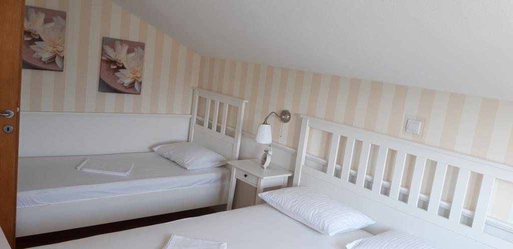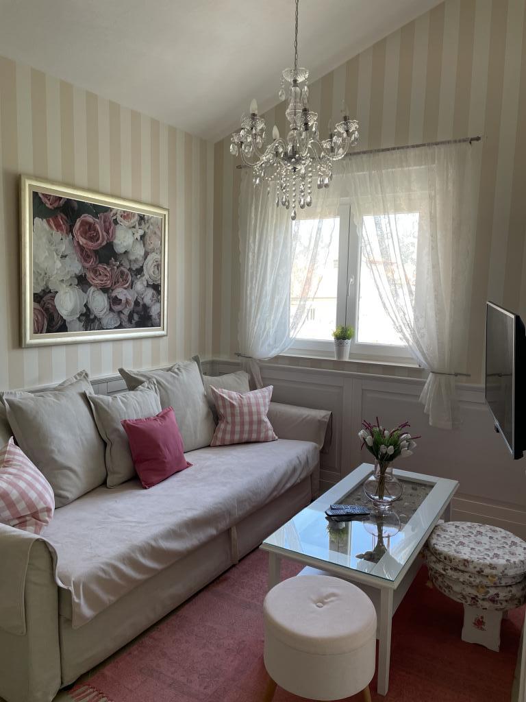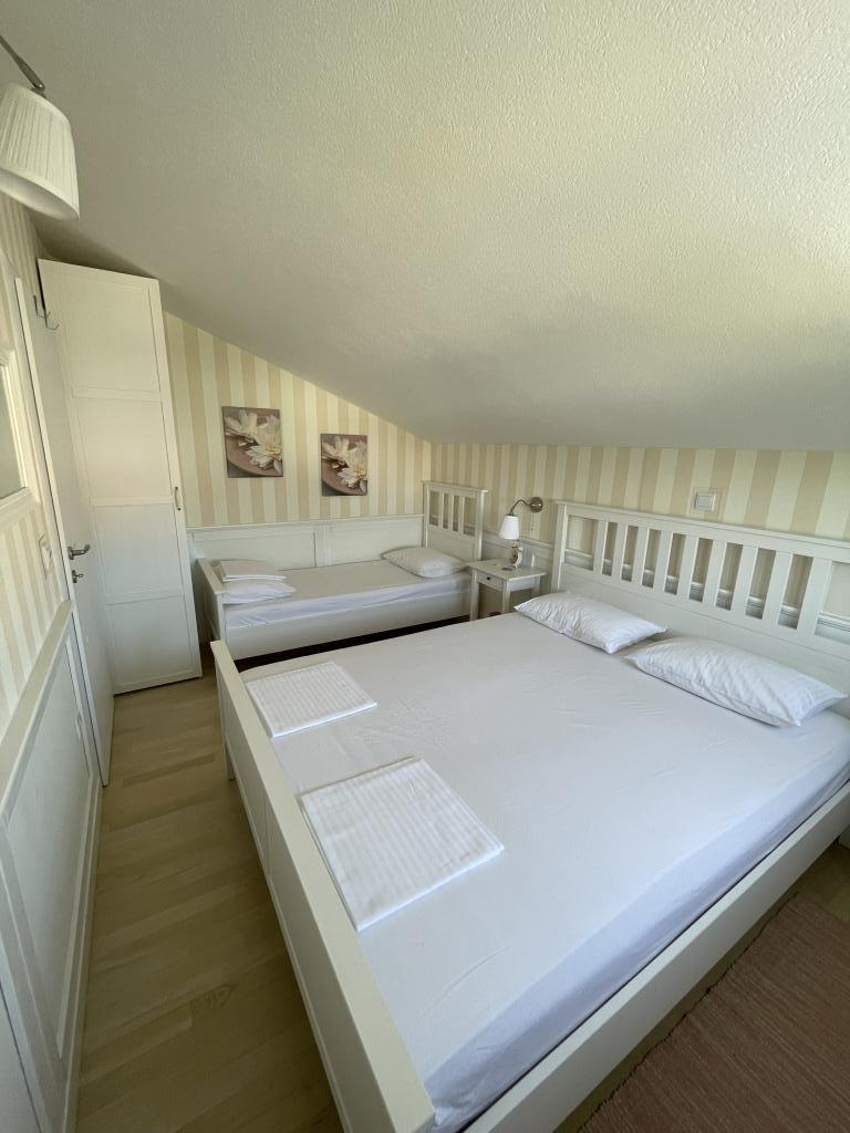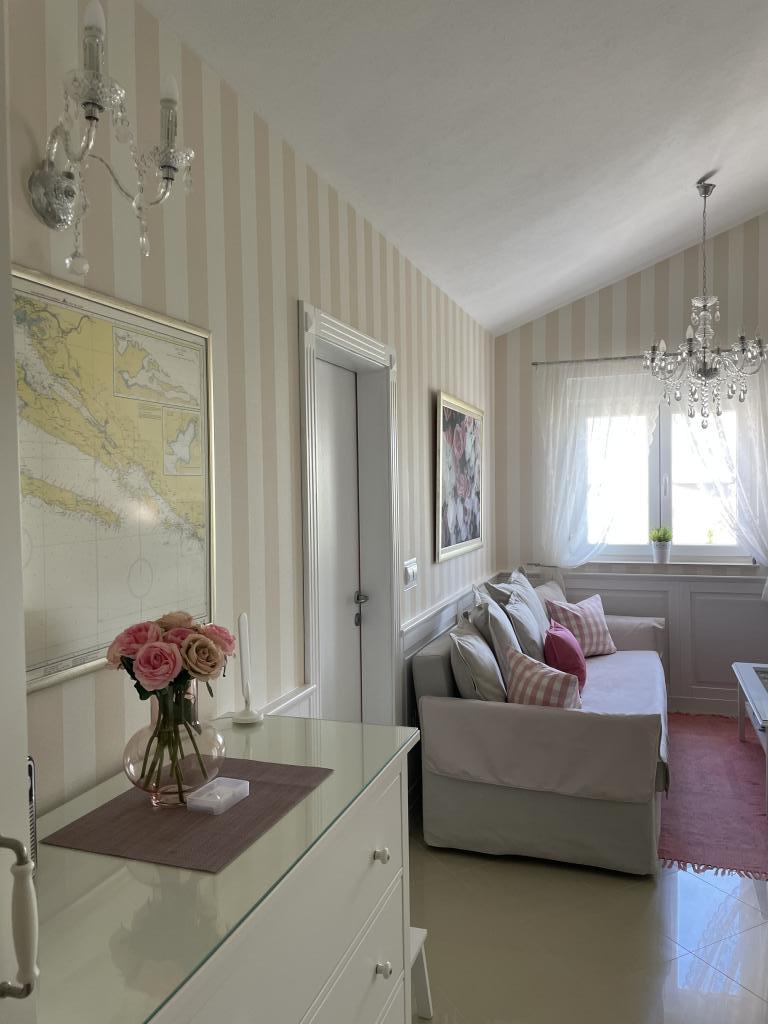 U apartmanu se nalazi jedna spavaća soba sa bračnim krevetom, a dodatno uz to ima i kauč na razvlačenje koji je pogodan za spavanje. U potpuno novoj ugradbenoj kuhinji nalazi se ceranska ploča, perilica posuđa, kuhalo, aparat za kavu i mikrovalna pećnica. U apartmanu se također nalazi stol sa četiri udobne stolice. U toaletu se nalazi tuš kabina, wc školjka, sušilo za kosu i perilica rublja. U cijelom apartmanu postavljene su visoko kvalitetne pločice, dok je u spavaćoj sobi postavljen parket koji je bajcan bijelom pojom. Završno čišćenje, boravišna pristojba, struja, voda, klima i grijanje su uključeni u cijenu. U vremenu koje provedete kod nas, pored apartmana imate slobodan pristup Internetu (wi-fi) i besplatno parking mjesto (br. 4). Radujemo se Vašoj poruci!