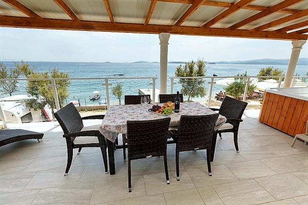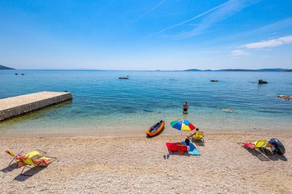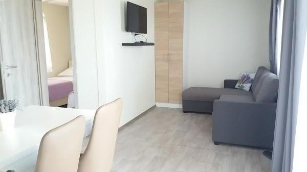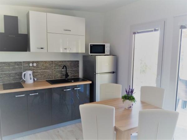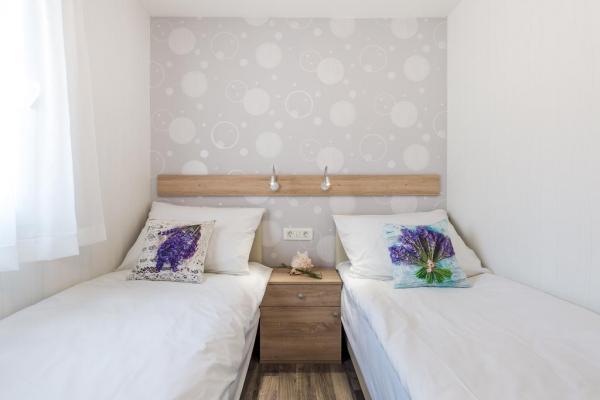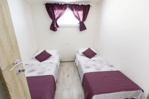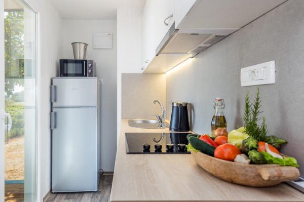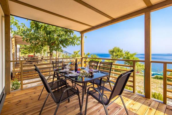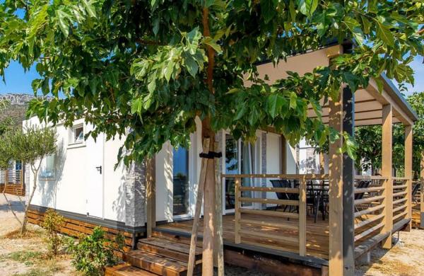 Nove moderne Mobilne kućice kompletno opremljene. Svaka ima pogled na more, Deluxe kućice (4 1) imaju i masažni bazen na terasi kućice. Udaljenost od pješčane plaže je svega 20 m. U objektu je na raspolaganju praonica rublja, restoran, recepcija, dječje igralište, bankomat... Karakteristike kućica: površina: 40 m² natkrivena terasa površine 18 m² (stol sa šest stolica, 2 ležaljke)- TV / SAT - besplatan Wi-Fi - klima uređaj - prostrana bračna soba sa krevetom (150x200cm) - prostrana soba sa dva kreveta (80x200 cm) - dvije kupaonice sa kupaonskim blokom, tuš kabinom i WC školjkom - prostrani dnevni boravak sa trosjedom za sjedenje uz mogućnost rastezanja u pomoćni ležaj, stol sa četiri stolice - opremljena kuhinja u sklopu dnevnog boravka, s pločom za kuhanje (struja), hladnjak sa zamrzivačem, kava aparatom, mikrovalnom pećnicom, perilicom suđa i kuhalom za vodu - Posteljina i ručnici - Parkiralište - Kućni ljubimci nisu dozvoljeni - Mogućnost doručka, ručka i večere.