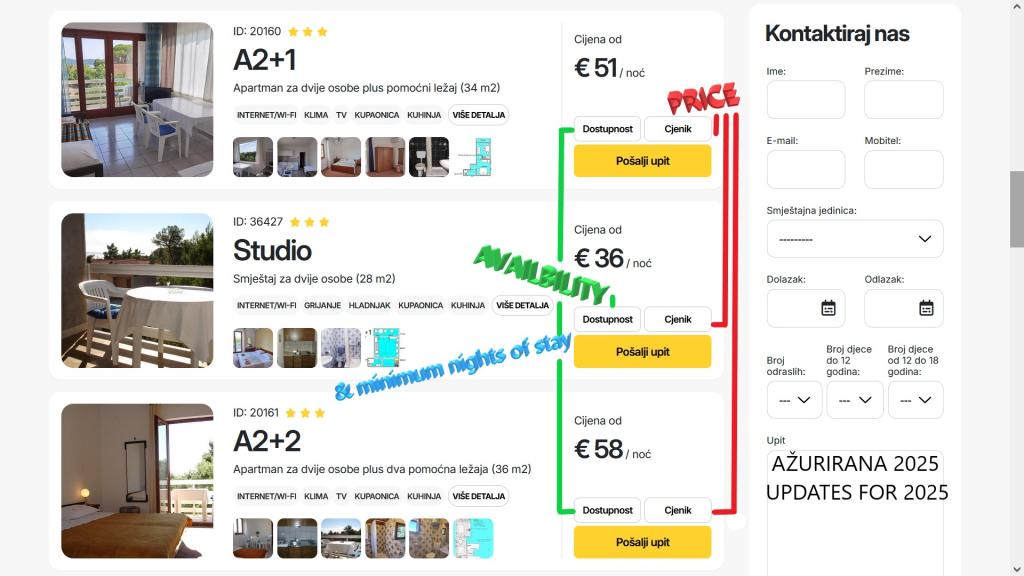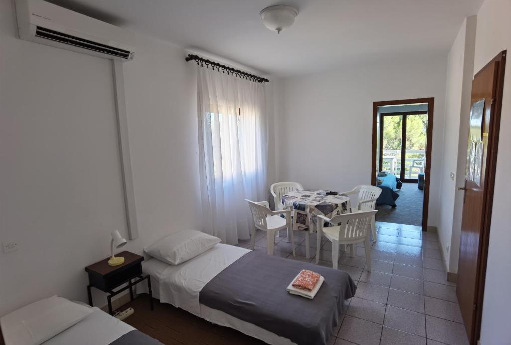 DOSTUPNOST, MINIMALNI OSTANAK I CIJENIK ZA 2025 SU VIDLJIVI Smještajni objekt nalazi se u posljednjoj ulici na zapadnoj strani Orebića. U blizini hotelskog naselja, neposredno uz borovu šumu. Do mora i javnih plaža udaljeni smo oko 2,5 minuta hoda. Obala sa plažama obiluje hladovinom Borova i Česmina a tu su i barovi te restorani. Javna plaža pod Grand hotelom sa uvalom i plitkim morem na čijem se dnu nalazi pijesak posebno je atraktivana. Svi apartmani imaju balkon - lođu na kojoj za vrijeme vručina i potpunih tišina bez vjetra snažno i ugodno cirkulira zrak. Apartmani sa pomoćnim ležajevima "2+2" i "2+1", adekvatni su za obitelji sa dvoje odnosno jednim djetetom. Apartman "2+2" opremljen je sa dva a apartman "2+1" sa jednim klima uređajem. DOBRODOŠLI