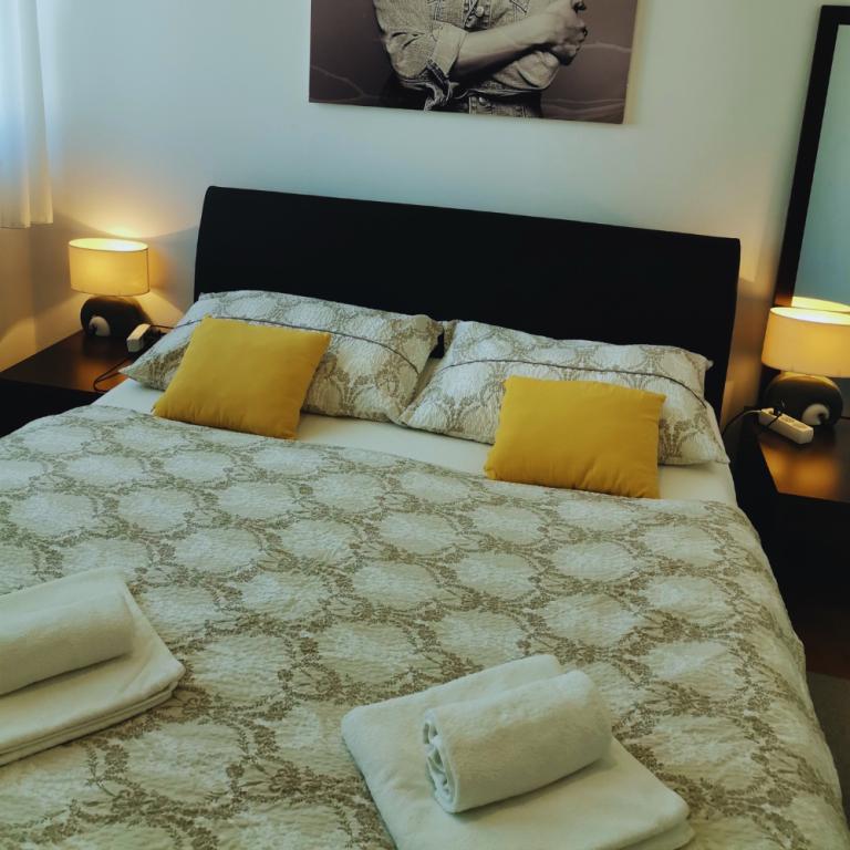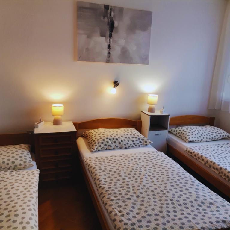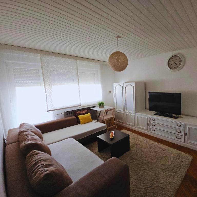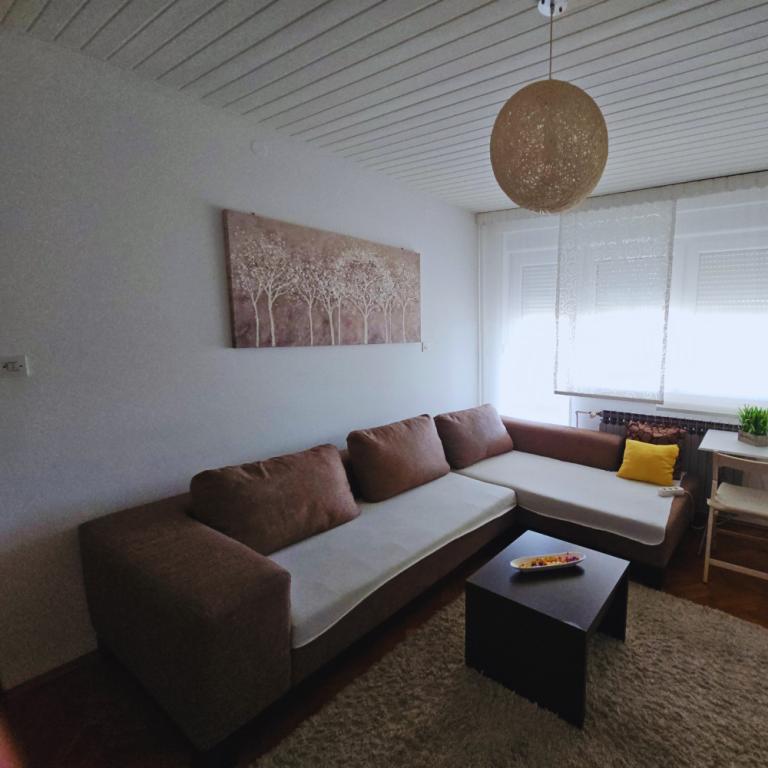 Nudimo novouređeni apartman u mirnom djelu grada. Ugodan boravak za djelatnike firmi i obitelji. Površine od 95m2, prostran i komforan. Sastoji se od dvije spavaće sobe, dnevnog boravka, kuhinje sa trpezarijom iz koje se izlazi na veliku prostranu terasu. Sobe za spavanje sadrže 1 bračni krevet, 3 pojedinačna ležaja za jednu osobu i u dnevnoj boravku ima dodatni ležaj. Apartman ima klimu, internet i privatno parkiralište te potpuno opremljenu kuhinju. U blizini objekta nalazi se dvorana Gradski vrt i svi potrebni sadržaji za ugodan boravak. Za sve dodatne informacije nazvati.