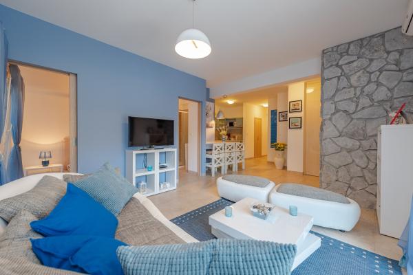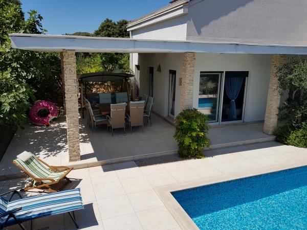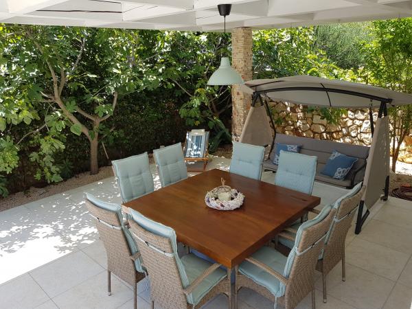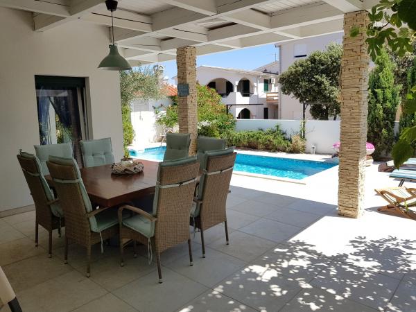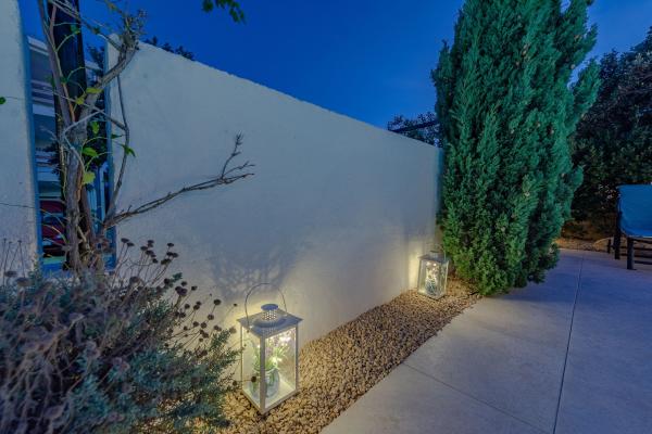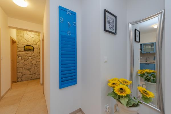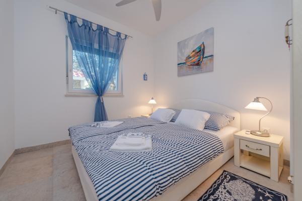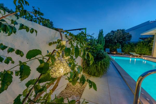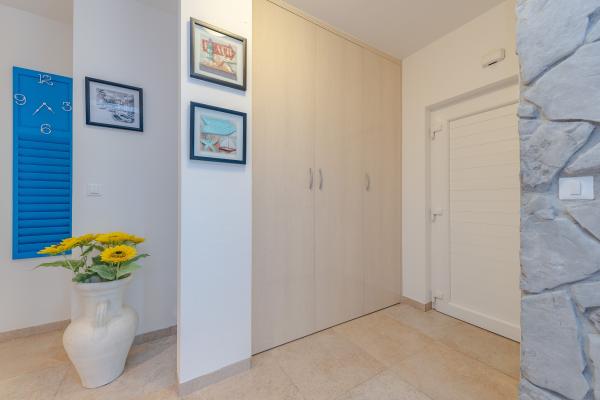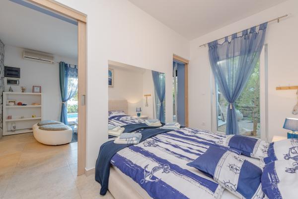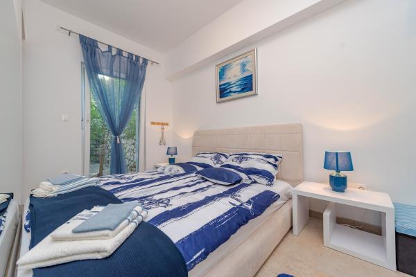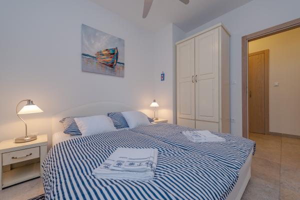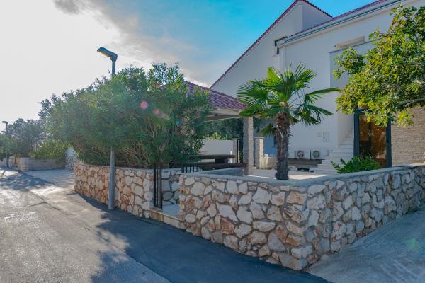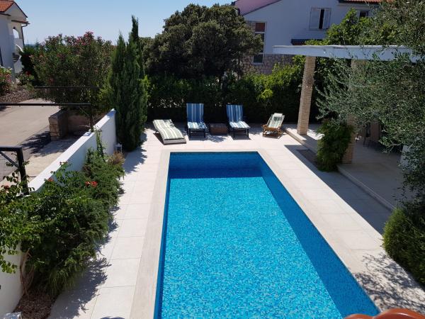 Apartman se nalazi u novijoj zgradi, kompletno je i suvremeno opremljen, novo uređen za ugodan i opuštajući boravak, udaljen od mora cca 250 m. Smješten je u prizemlju objekta. Ima zaseban ulaz, okućnicu koja je podijeljena na sunčalište koje okružuje bazen, te na vrt i natkrivenu terasu na kojima se odvijaju dnevna i večernja druženja. Na terasi je veliki stol a pokraj se nalazi njihajuća ležaljka za odmor. Bazen kvadrature 26 m2 mogu koristiti samo gosti ovog apartmana. U vrtu su zasađene smokve u čijim plodovima gosti mogu uživati, te je uređena hortikultura ( lovor višnja, čempresi, ružmarin, lavanda i oleanderi). Gosti imaju privatnost i mir. Unutarnji raspored - dnevni boravak i tri spavaće sobe, 2 tuš kabine, 1 WC, ostava. Ukupna korisna površina apartmana je 112 m2, od čega 70 m2 zatvorenog dijela. Također, apartmanu pripadaju i dva parkirna mjesta. Na par minuta hoda od apartmana nalazi se prodavaonica, ljekarna, ribarnica, frizer, domaći proizvođači voća i povrća...