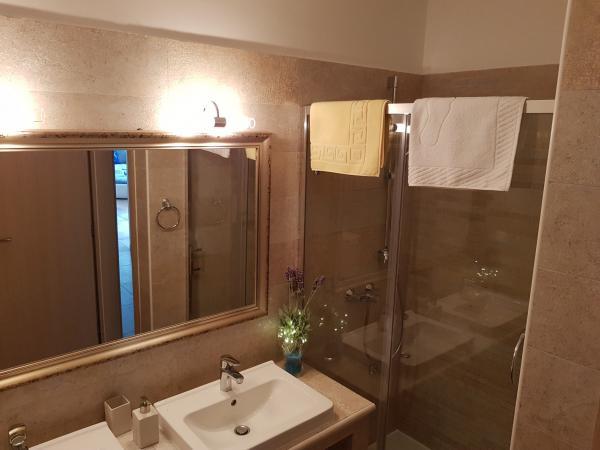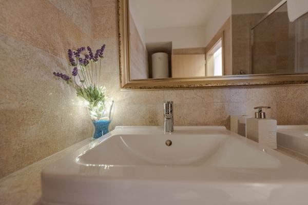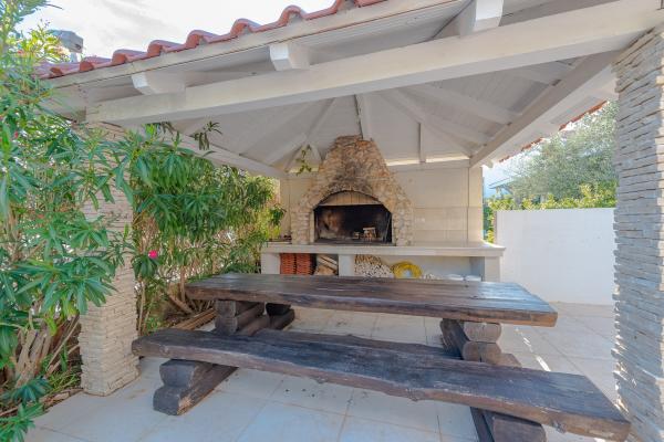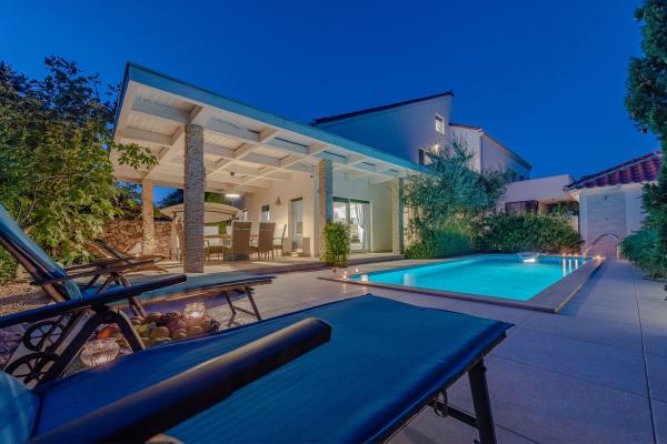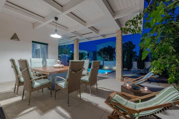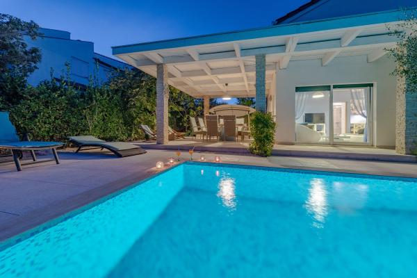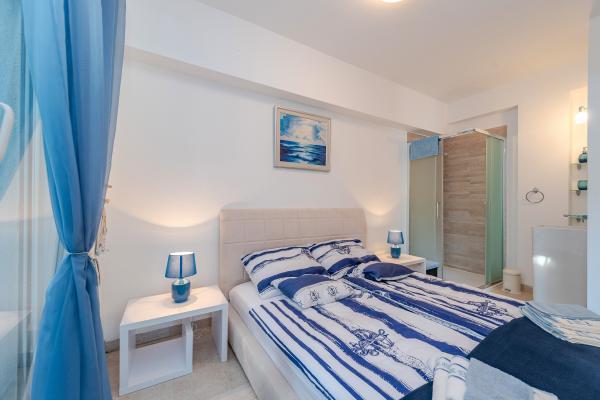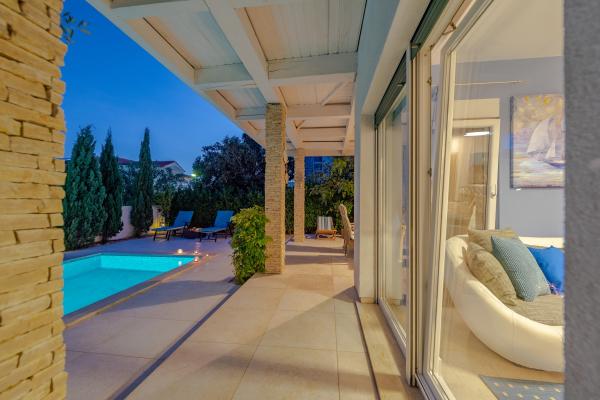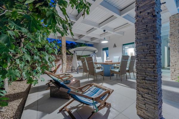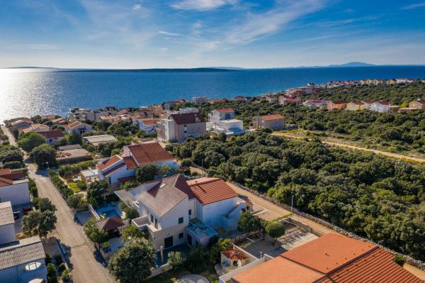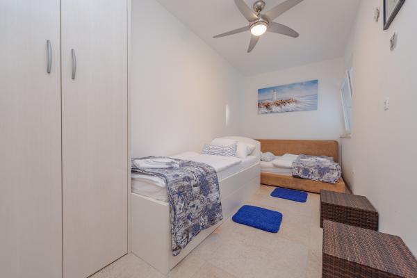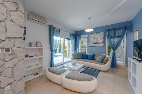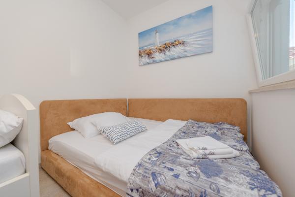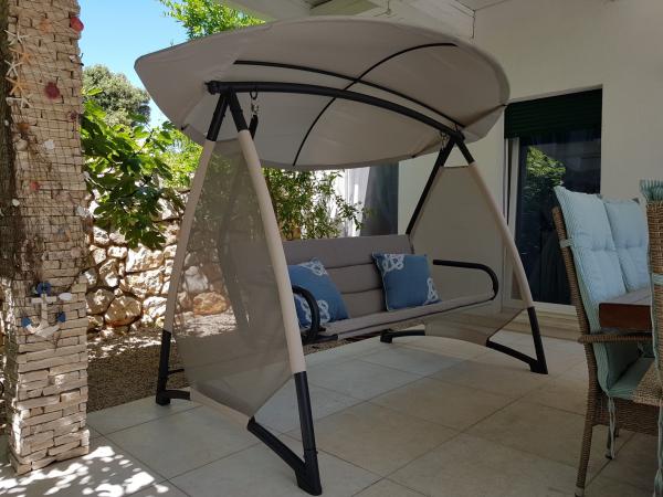 Apartman se nalazi u novijoj zgradi, kompletno je i suvremeno opremljen, novo uređen za ugodan i opuštajući boravak, udaljen od mora cca 250 m. Smješten je u prizemlju objekta. Ima zaseban ulaz, okućnicu koja je podijeljena na sunčalište koje okružuje bazen, te na vrt i natkrivenu terasu na kojima se odvijaju dnevna i večernja druženja. Na terasi je veliki stol a pokraj se nalazi njihajuća ležaljka za odmor. Bazen kvadrature 26 m2 mogu koristiti samo gosti ovog apartmana. U vrtu su zasađene smokve u čijim plodovima gosti mogu uživati, te je uređena hortikultura ( lovor višnja, čempresi, ružmarin, lavanda i oleanderi). Gosti imaju privatnost i mir. Unutarnji raspored - dnevni boravak i tri spavaće sobe, 2 tuš kabine, 1 WC, ostava. Ukupna korisna površina apartmana je 112 m2, od čega 70 m2 zatvorenog dijela. Također, apartmanu pripadaju i dva parkirna mjesta. Na par minuta hoda od apartmana nalazi se prodavaonica, ljekarna, ribarnica, frizer, domaći proizvođači voća i povrća...