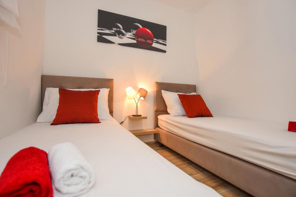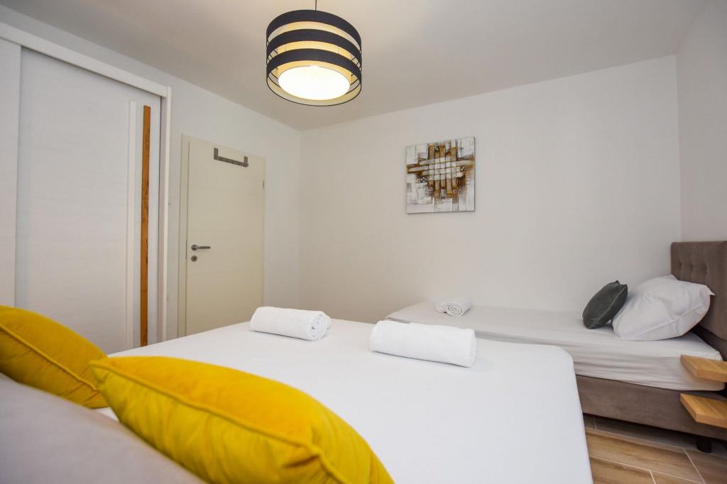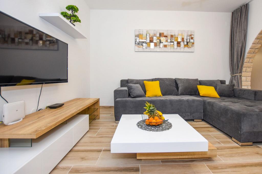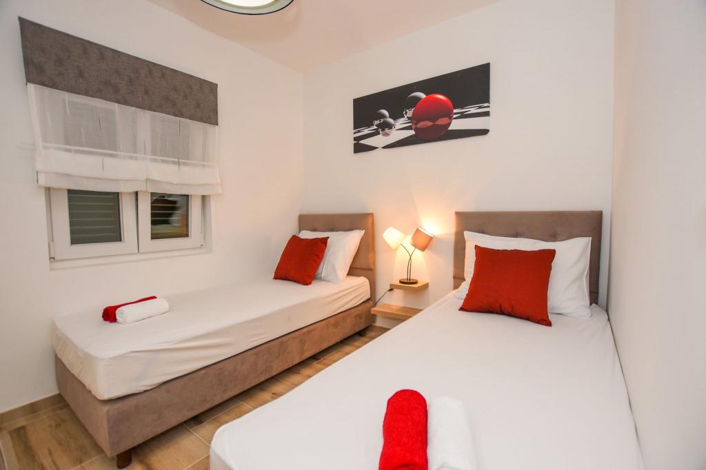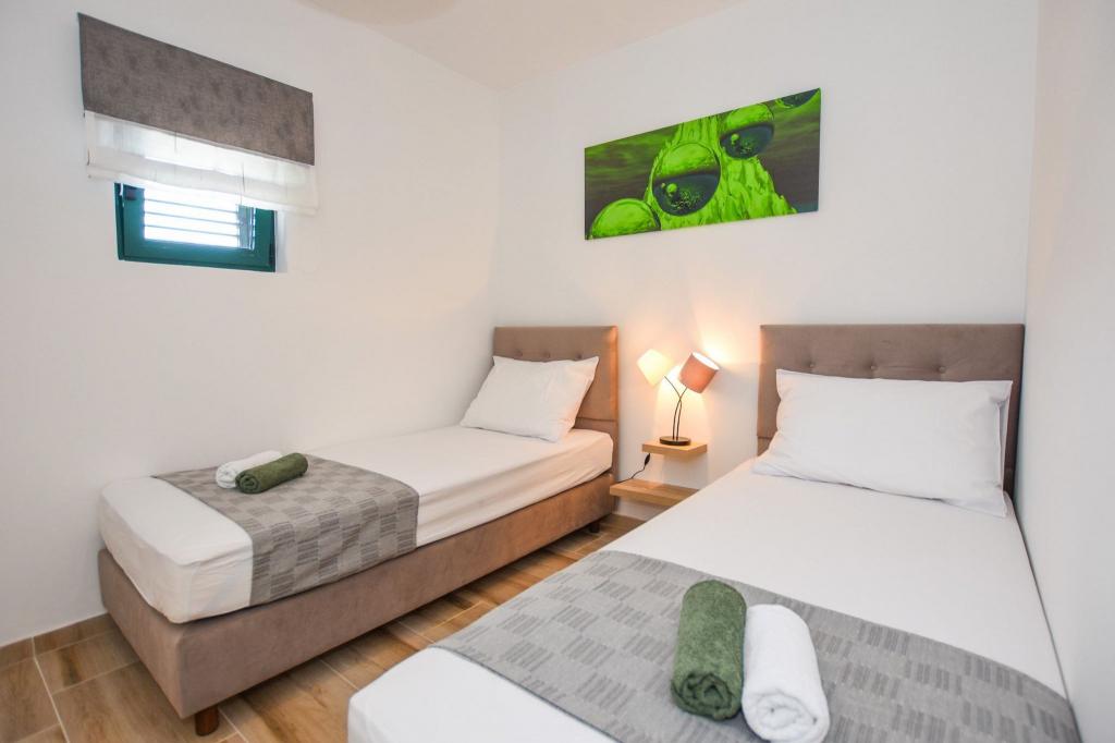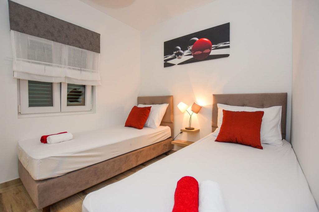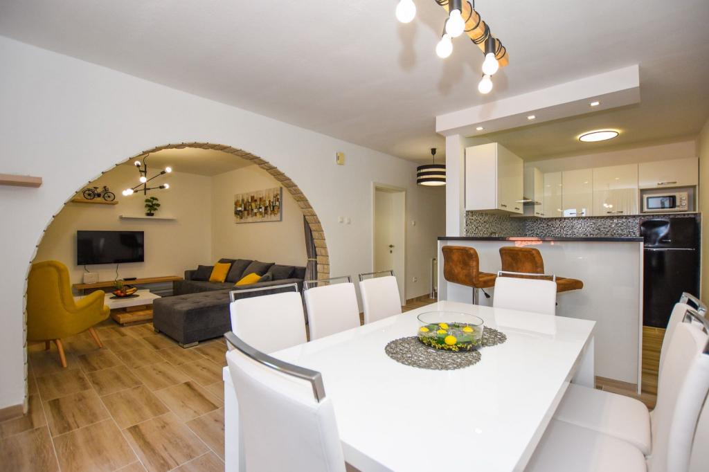 6 NOVO MODERNO UREDENA apartmana, sve jedinice uključuju klima-uređaj, vlastitu kupaonicu s tušem i kuhinju s perilicom suđa, hladnjakom, tosterom i kuhalom za vodu te zajednička prostorija za potrebe pranja, sušenja i peglanja robe, besplatan Wi-Fi, led TV, aparat za kavu, krevetić za djecu. Privatan besplatan parking u krugu od 50 metara. Gostima je na raspolaganju terasa za pojedine jedinice. U krugu od 20 metara nalaze se predivne plaže, kafići, dječje igralište, restorani, trgovina te igraonica.