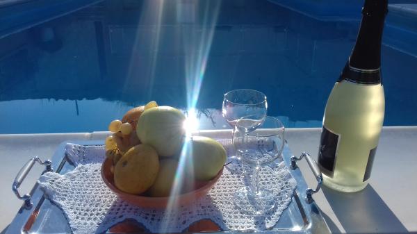 Piće dobrodošlice uključeno u cijenu, mogućnost najma barke i bicikla. Bazen 10 x 5 m sa ležaljkama za opuštanje i uživanje, natkrivena sjenica sa vrtnim stolovima, prostor za djećiju igru