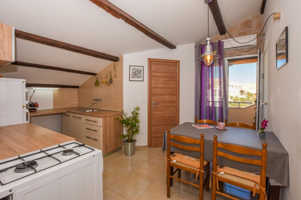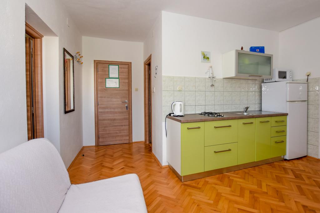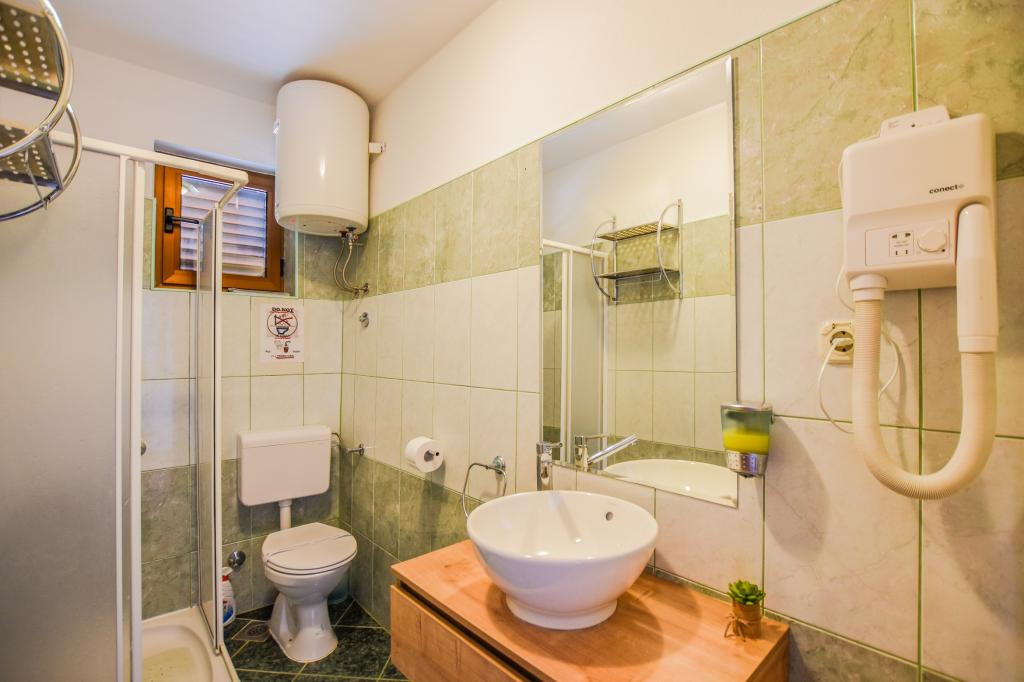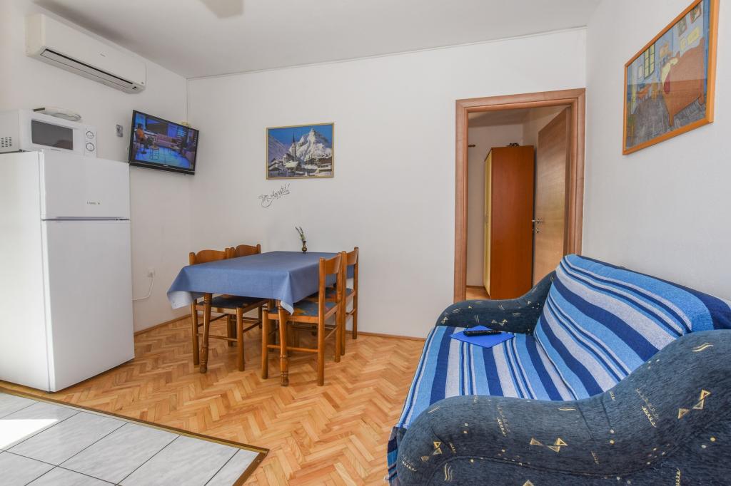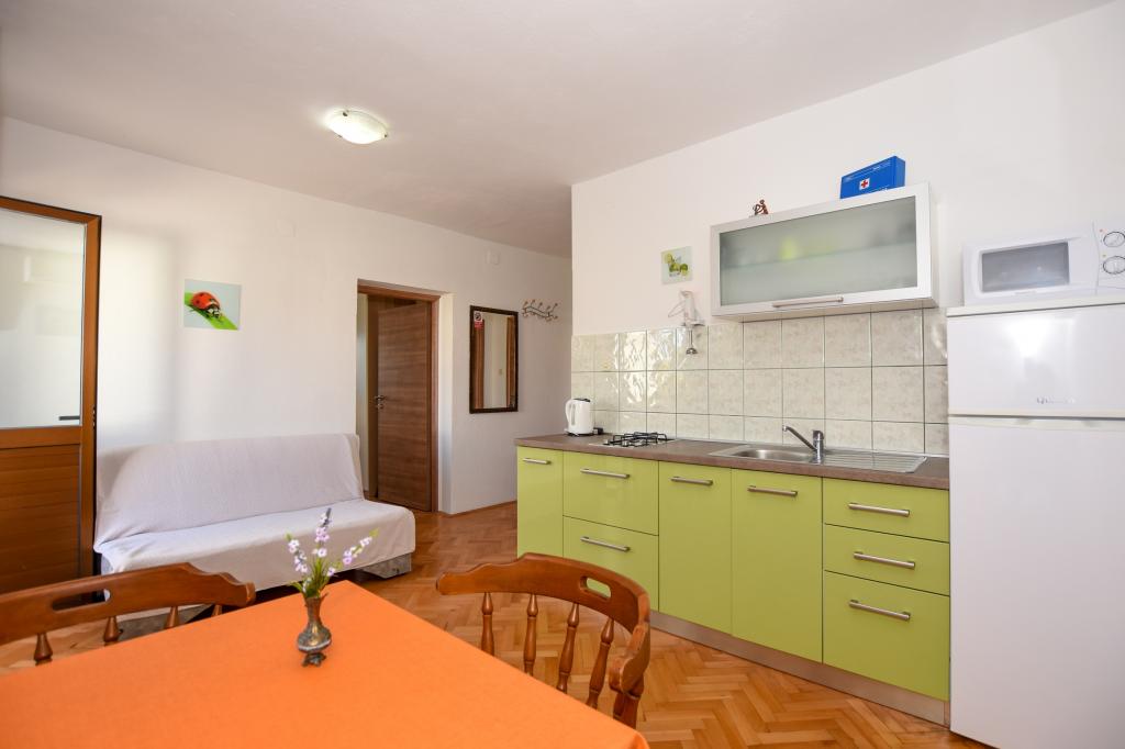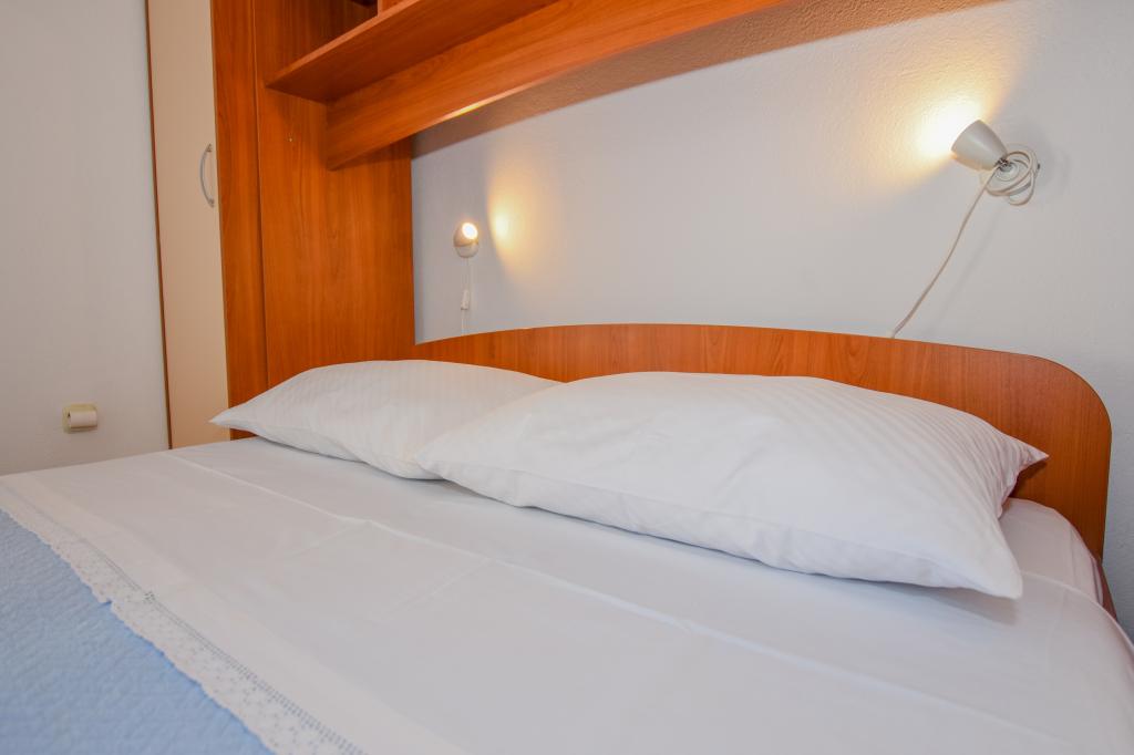 Vrlo dobar smještaj. Bili smo u A3 s dva balkona. Oprema kuhinje i kupaonice je dovoljna. Čisto, čak besprijekorno. Gospođa Dominika je od pomoći u svemu. Čak nam je omogućila pristup svojoj garaži za naših 5 SUP dasaka. Odlično mjesto za roštilj. Preporučujemo.