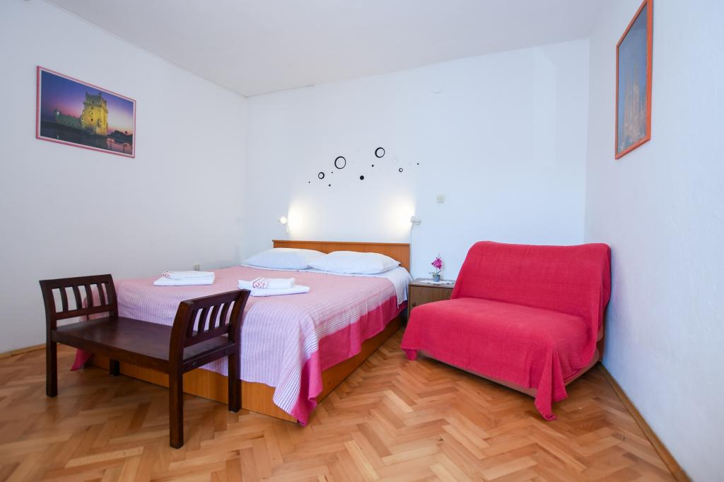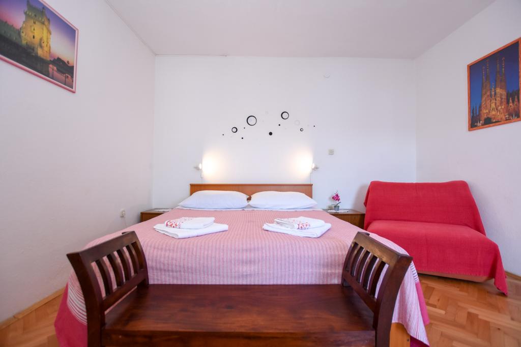 Preporučena! Prostrani apartman / studio / pripremljen za nas, čisto, mirisno rublje i ručnike posvuda. Fotografija više ne odgovara novoj stvarnosti. Novi veliki hladnjak sa zasebnim zamrzivačem, plinskim štednjakom / bez peći za pečenje /, novim LCD ravnim LCD TV-om. Izvrsna lokacija, dobro opskrbljena tržnica odmah ispod terase. Manja plaža je oko 60m, no za djecu je praktičnija / cca 400m / gradska pješčana plaža s postupnim ulazom u vodu, a posebno NABOSO! Plaža sa svim potrebnom opremom: Tobogan i super brzi snack, sladoled, kafeterije, restoran, sve što vam treba. U gradu, veliko tržište ... sa svježe pripremljenim vrućim pakiranim obrocima po povoljnoj cijeni. Večernja kružna raskrižja, automobili, trampolini, odbojkački dvorac, tržnice ... Privatni, vrlo prostrani parking 50m od kuće. Okolica vile je prilično tiha, velika terasa je u hladovini, koja je bila stvarno super. Nismo morali šutjeti uopće. Plaža treba suncobran, bazu ispunjenu vodom, za četveročlanu obitelj barem dva! Sveukupno vrlo ugodan odmor s izvrsnim smještajem i sve što je lako doći. Volim se vratiti. Pozdrav domaćoj dami, hrvatskom nogometu, želim pobijediti! Vladislav
