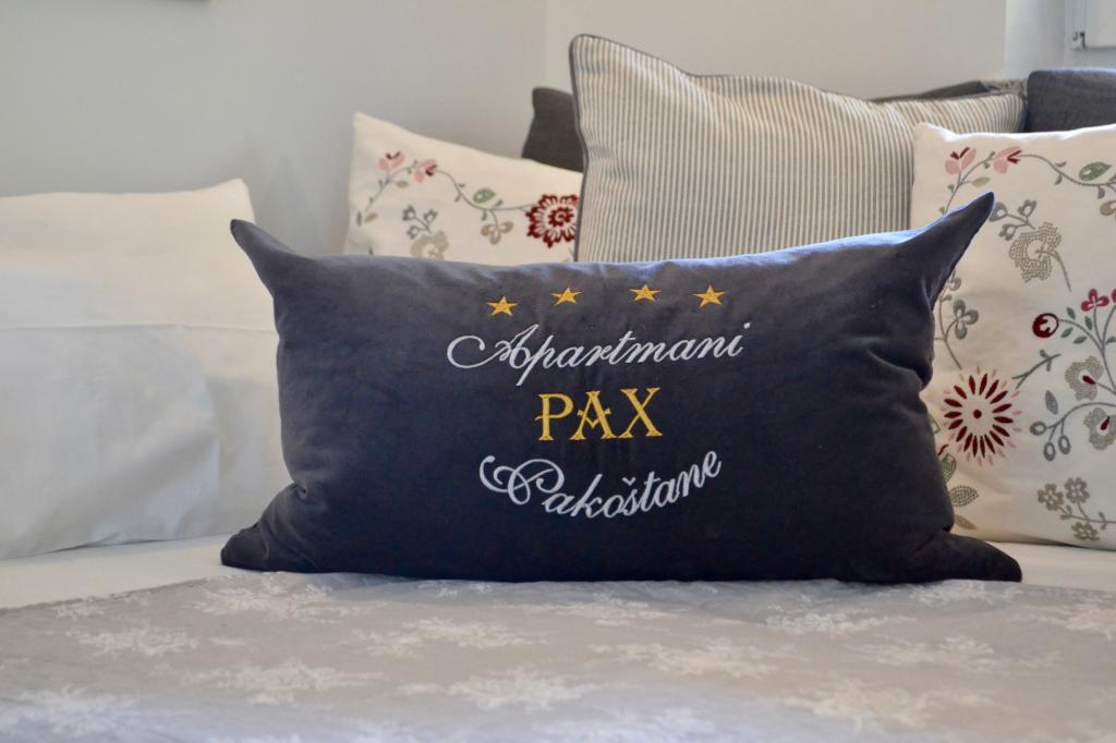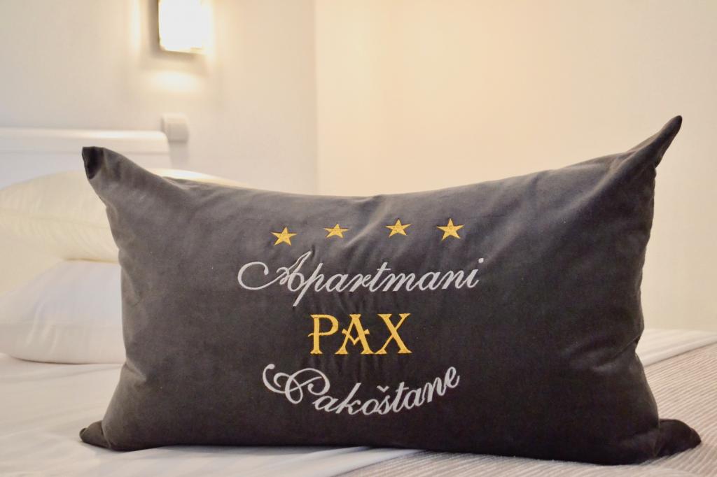 Apartmani PAX se nalaze u mirnom dijelu Pakoštana. Moderno uređeni apartmani kategorije 4 zvjezdice se nalaze na prvom katu te su veličine 68m² (s balkonom) i 48m² (s terasom) s posebnim ulazom. Sadrže jednu spavaću sobu s velikim bračnim krevetom, potpuno opreljenu kuhinju, dnevni boravak s dodatnim ležajem i kupaonicu s tušem. Imaju sve što jedan moderan apartman zahtijeva kako bi gostu omogućio što ugodniji boravak u njemu. Opremljeni su posteljinom, ručnicima, klima uređajem i sefom. Apartmani imaju besplatni bežični internet, lcd tv i satelitske programe. Parking se nalazi u dvorištu kuće. Grill je također na raspolaganju. Centar, trgovina, banka, restorani i ostali ugostiteljski i turistički sadržaji te plaža se nalaze na 5 - 10 minuta hoda od objekta. Na 10 minuta udaljenosti se nalazi park prirode Vransko jezero, najveće prirodno jezero Hrvatske. Domaćini pričaju Hrvatski i Njemački.