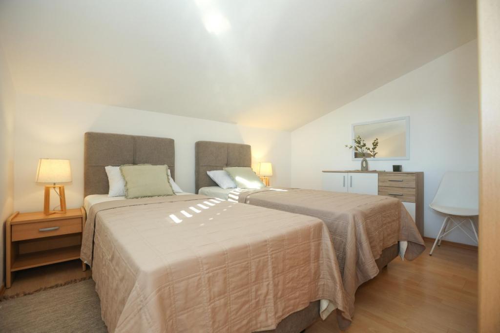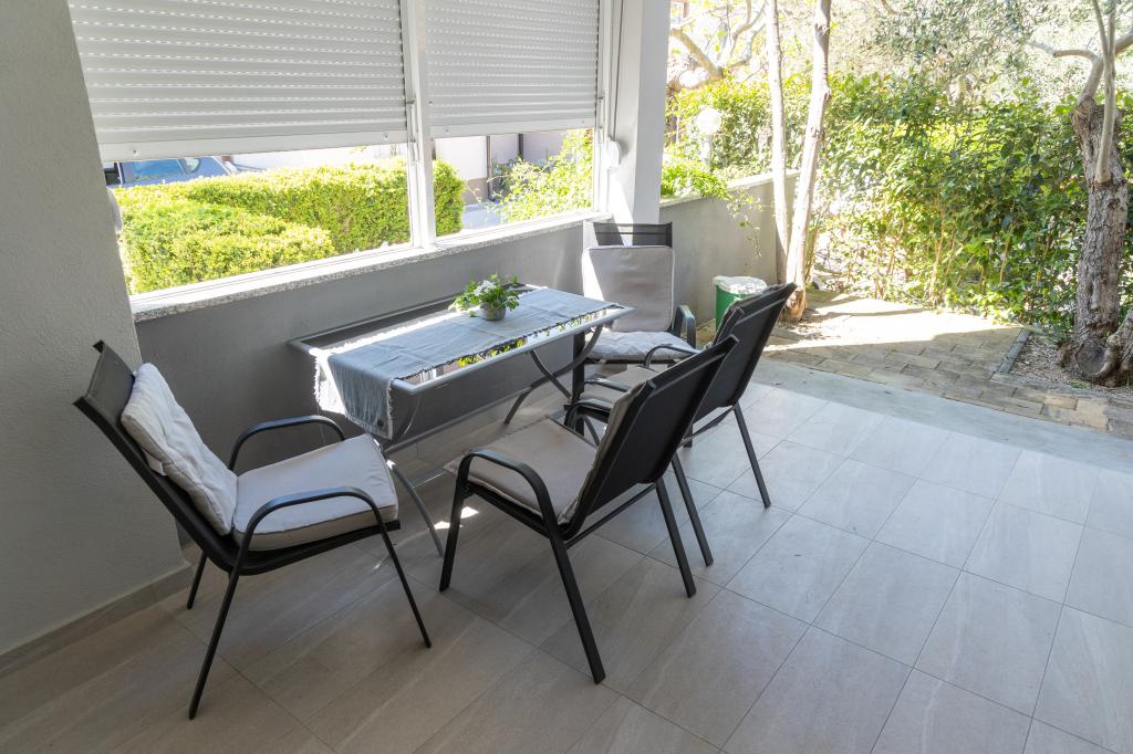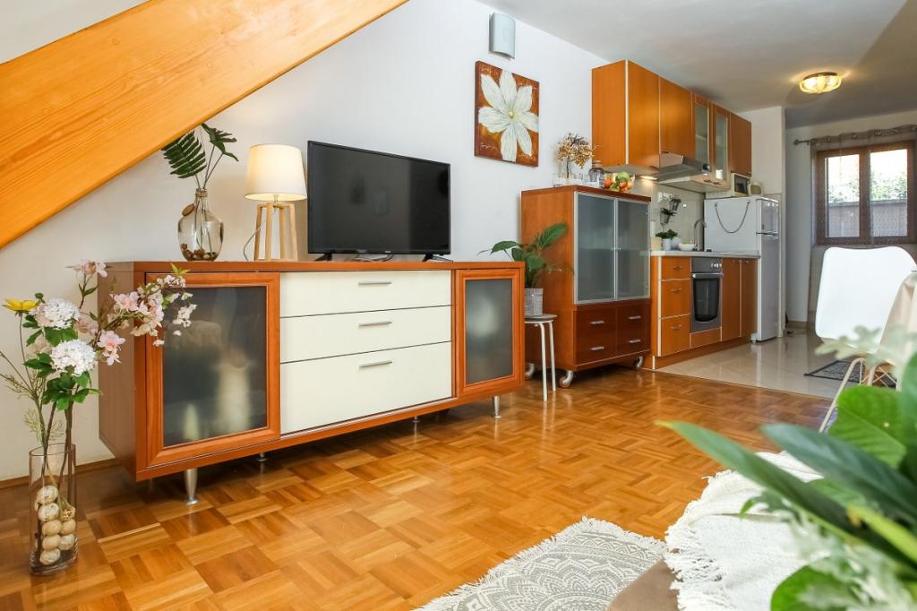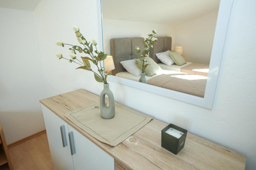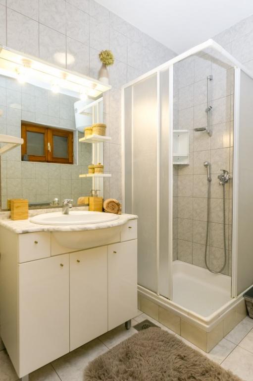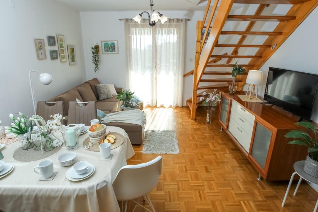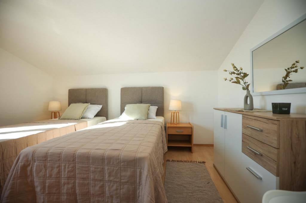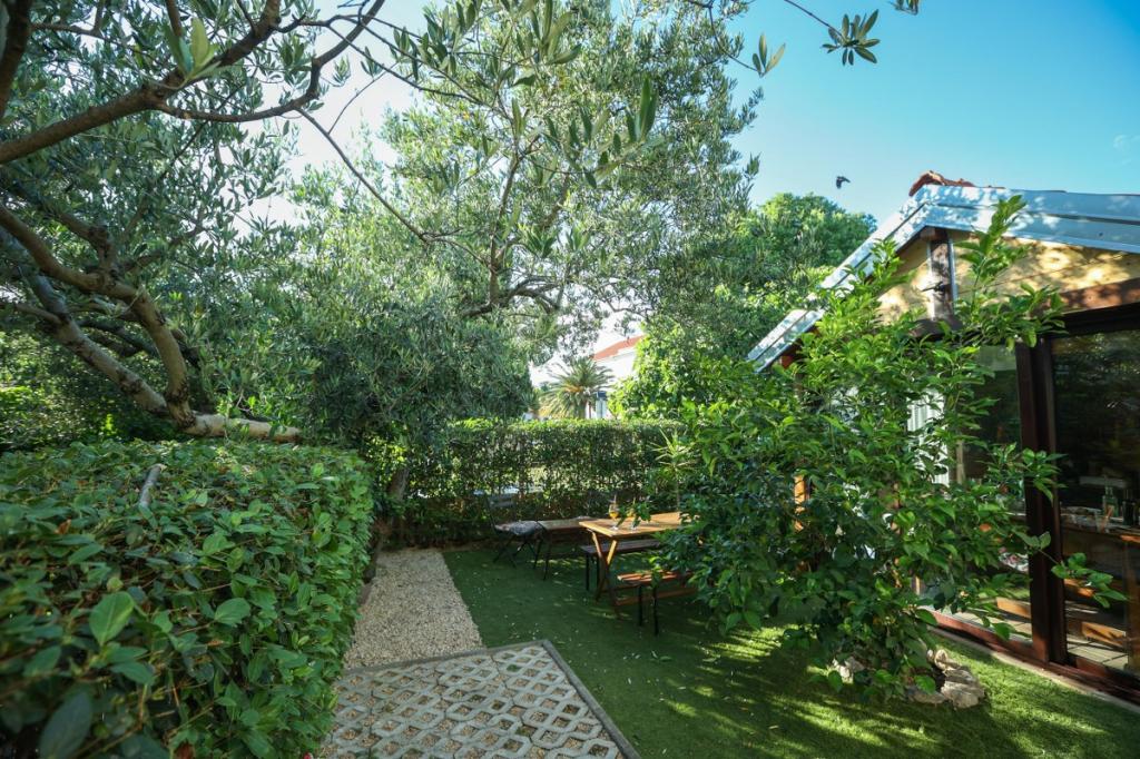 Objekt se nalazi na odličnoj lokaciji, svega 400 metara od centra mjesta, a svi potrebni sadržaji su u neposrednoj blizini – najbliža trgovina udaljena je samo 30 metara. Sastoji se od tri smještajne jedinice, pri čemu svaka ima vlastiti balkon, dok najveći apartman dodatno raspolaže s čak tri prostrane terase. Gostima je na raspolaganju i vanjski prostor koji uključuje staklenu sjenicu s kuhinjom, unutarnjim kaminom i velikim stolom idealnim za blagovanje. Ova ugodna zona za opuštanje smještena je usred zelenila i nudi ugodan ambijent za sjedenje na otvorenom. Smještaj je idealan za sve tipove gostiju, a posebno pogodan za obitelji s djecom, koja se mogu bezbrižno igrati u sigurnom i prostranom okruženju. Svaki apartman ima osigurano vlastito vanjsko parkirno mjesto.