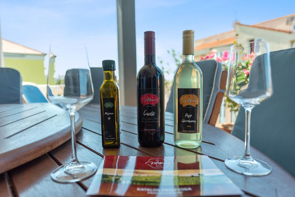 U našoj ponudi imamo naše domaće maslinovo ulje, crno i bijelo vino i našu domaću travaricu.