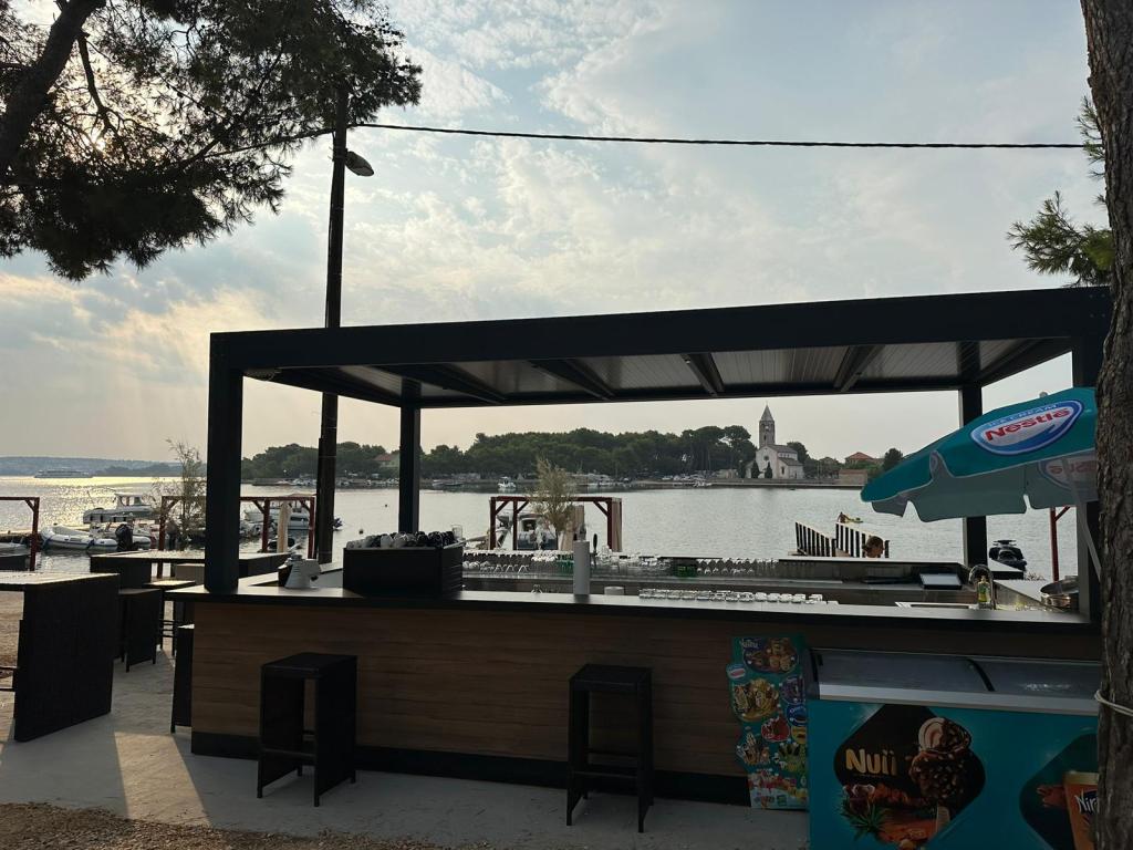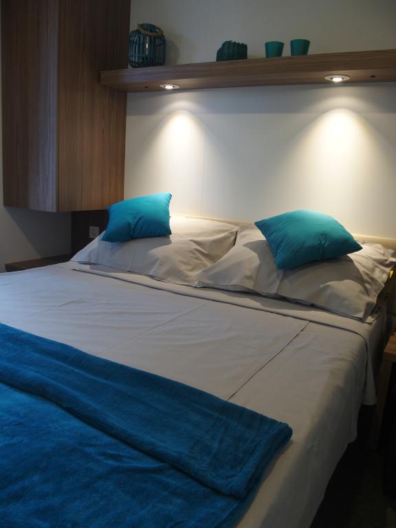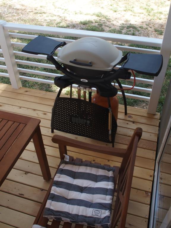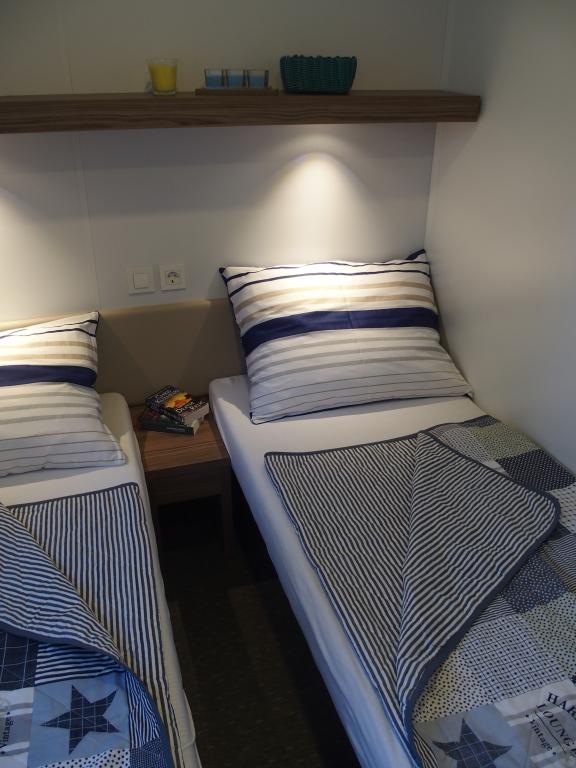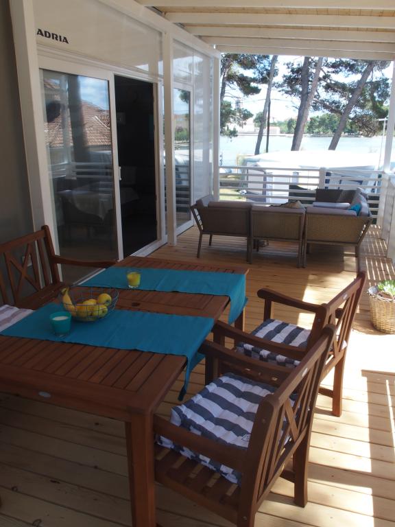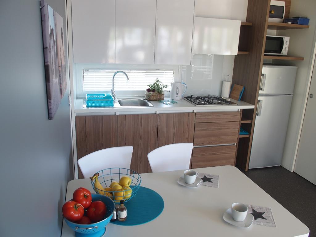 Luksuzna mobilna kućica smještena je u prirodnoj „dubokoj sjeni“ borove šume, svega 20 m od pješčane plaže. S velikom otvorenom terasom s pogledom na more, 2 spavaće sobe, potpuno opremljenom kuhinjom i kupaonicom te velikim dnevnim boravkom s dodatnim kaučem na razvlačenje, ova kuća za odmor savršen je izbor za opuštajući obiteljski odmor. Omogućuje udoban smještaj za 4 osobe, dok je maksimalni kapacitet 4 + 1 osoba. Na terasi je na raspolaganju sjedeća garnitura za opuštanje, stol za objedovanje do 6 osoba, kao i plinski roštilj. Na udaljenosti od samo 20 m nalazi se lijepa i sigurna plaža s pješčanim morskim dnom koje se proteže od jednog kraja uvale do drugog. Uz obalu, nekoliko kilometara u oba smjera, nalaze se i druge plaže različitih tipova koje možete istražiti. Unutar kampa gostima je na raspolaganju bazen sa uređenim sunčalištem s besplatnim ležaljkama, kao i caffe-bar, a terasa kućice je smještena tako da s nje imate otvoren pogled na cijelu uvalu i bazen.