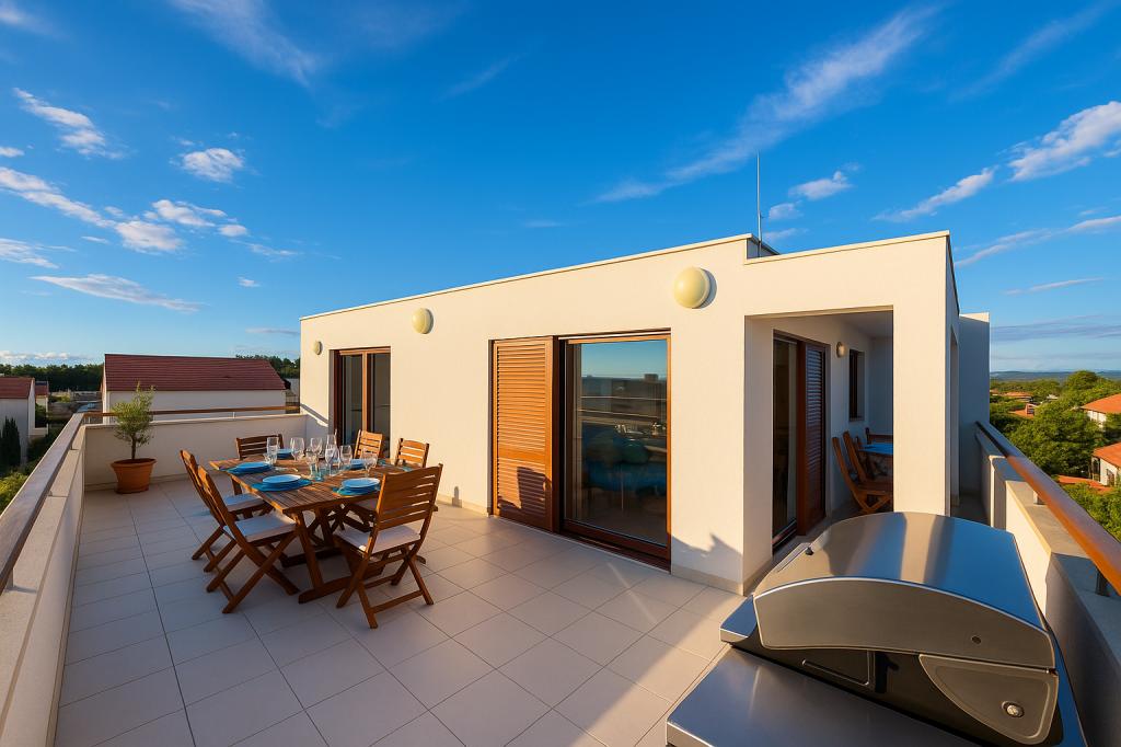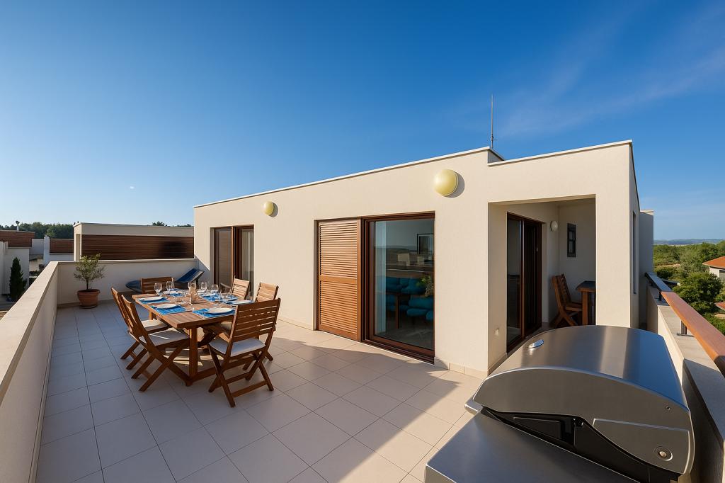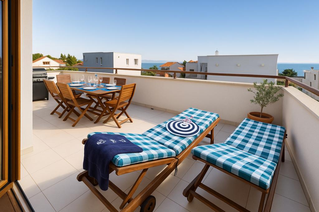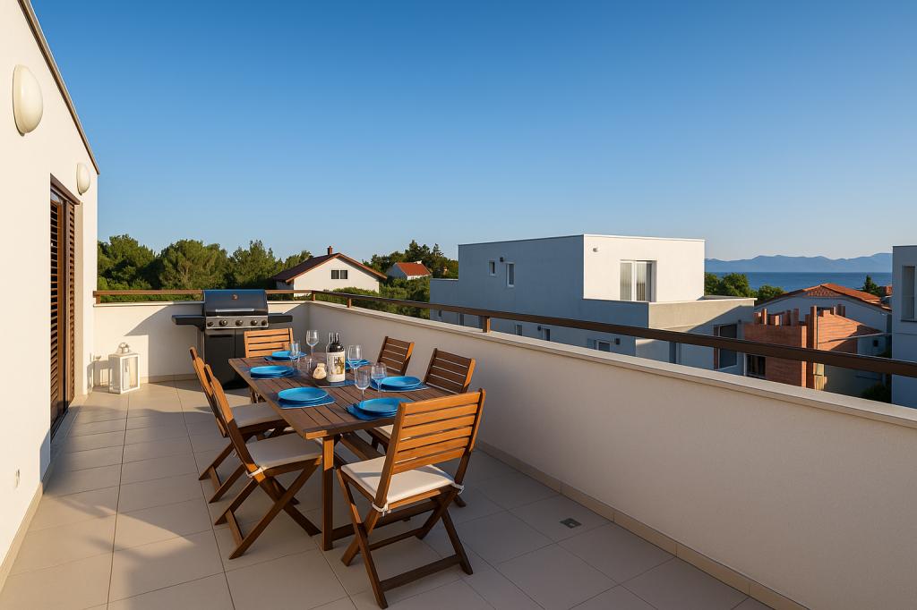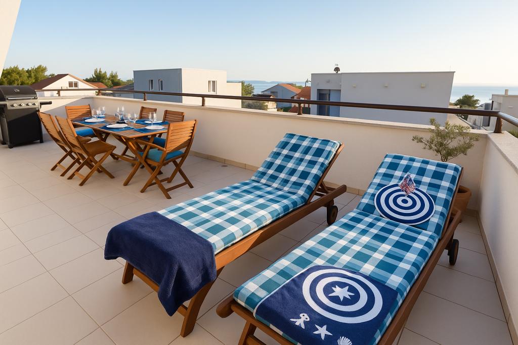 Aquamarine Deluxe Penthouse Apartment smješten je u Petrčanima, samo 150 m od plaže Pineta i 250 m od plaže Punta Radman. Gostima su na raspolaganju velika terasa s djelomičnim pogledom na more, roštilj, besplatan WiFi i privatno parkiralište. Apartman uključuje 3 spavaće sobe, moderno uređenu kupaonicu, dnevni boravak s kaučem i TV-om ravnog ekrana sa satelitskim programima, potpuno opremljenu kuhinju s blagovaonicom, posteljinom i ručnicima. Udaljen je samo 200 m od autobusnog stajališta Petrčane, a Zračna luka Zadar nalazi se 23 km dalje. Moguća je organizacija prijevoza uz nadoplatu. Idealno za obitelji ili grupe do 6 osoba koje žele udoban i elegantan odmor na moru.