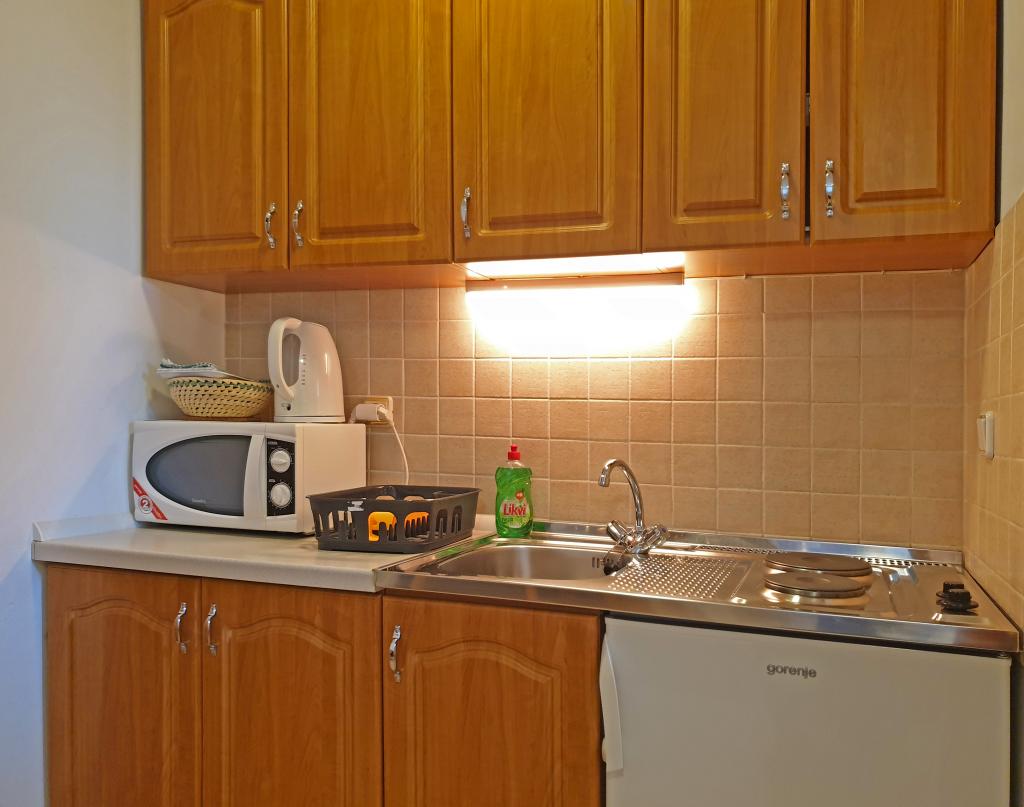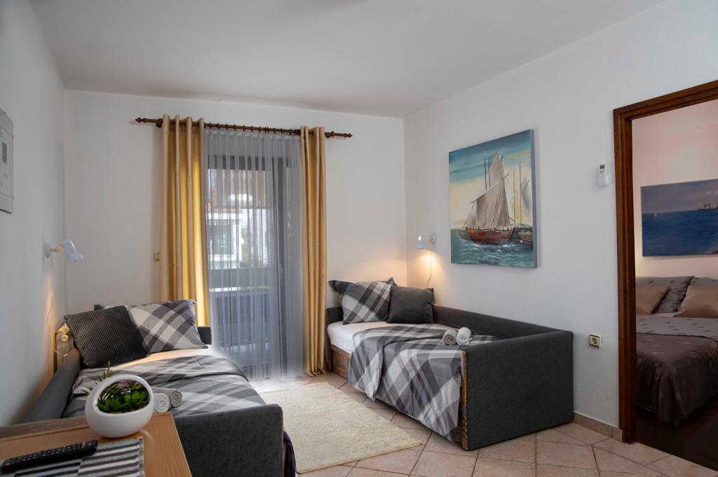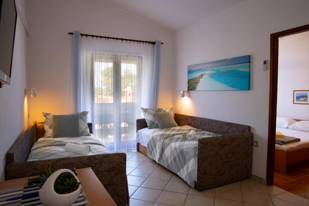 Apartmani uredni i čisti te opremljeni svime što je potrebno za kraći i duži boravak. Vlasnik je susretljiv, pristupačan i voljan pomoći oko svega. Plaže su doslovno nadohvat ruke, minuta hoda (s malim djetetom) na koju god stranu krenete. Hlada možete gotovo uvijek naći, a za djecu ima i fina pješčana plaža sa plitkim morem na kojoj ima mjesta u svako doba dana. Mjesto ima dovoljno kafića, restorana, pizzerija, gift shopova... Auto je doslovno nepotreban (a možete ga ostaviti na rezerviranom parkingu u hladu uz apartman) jer je sve u par minuta hoda. Svaka preporuka za apartman.