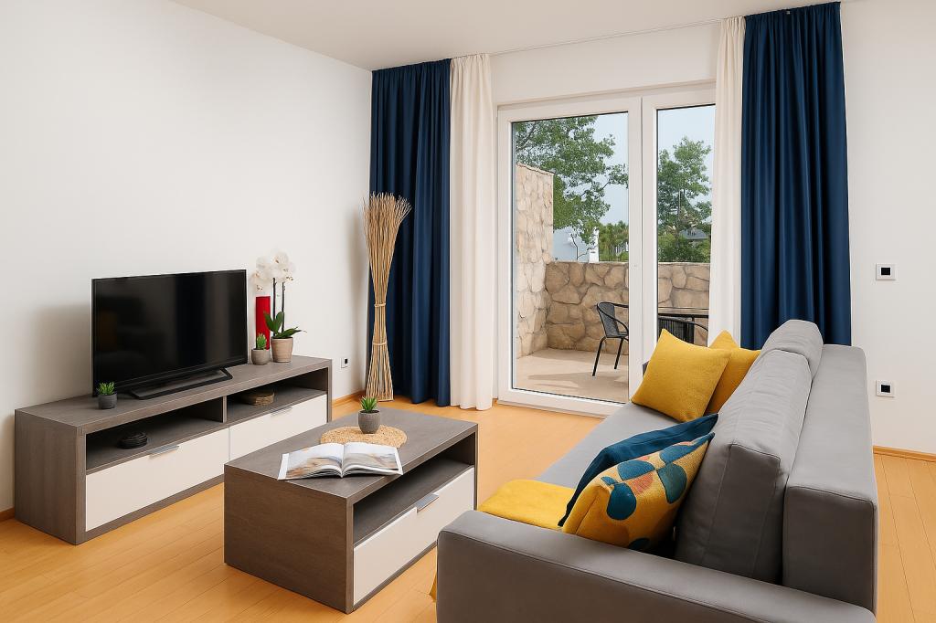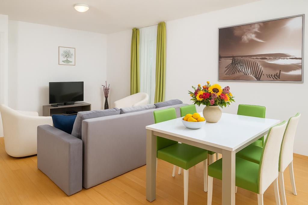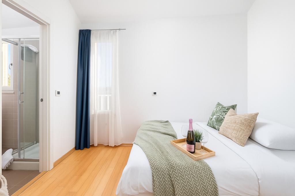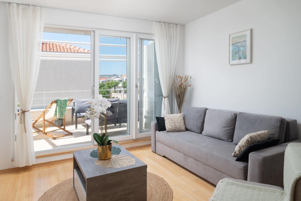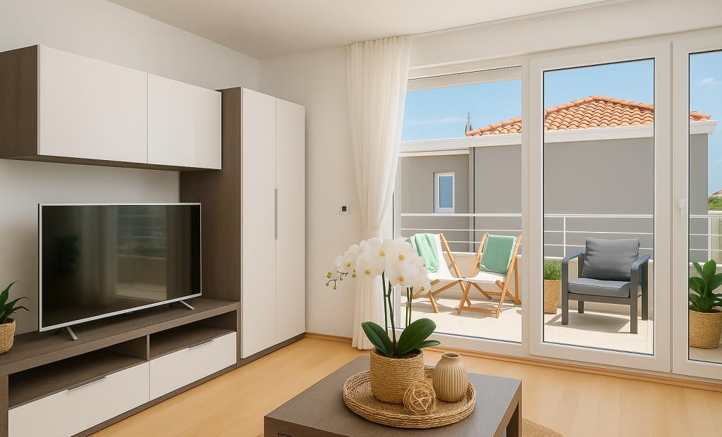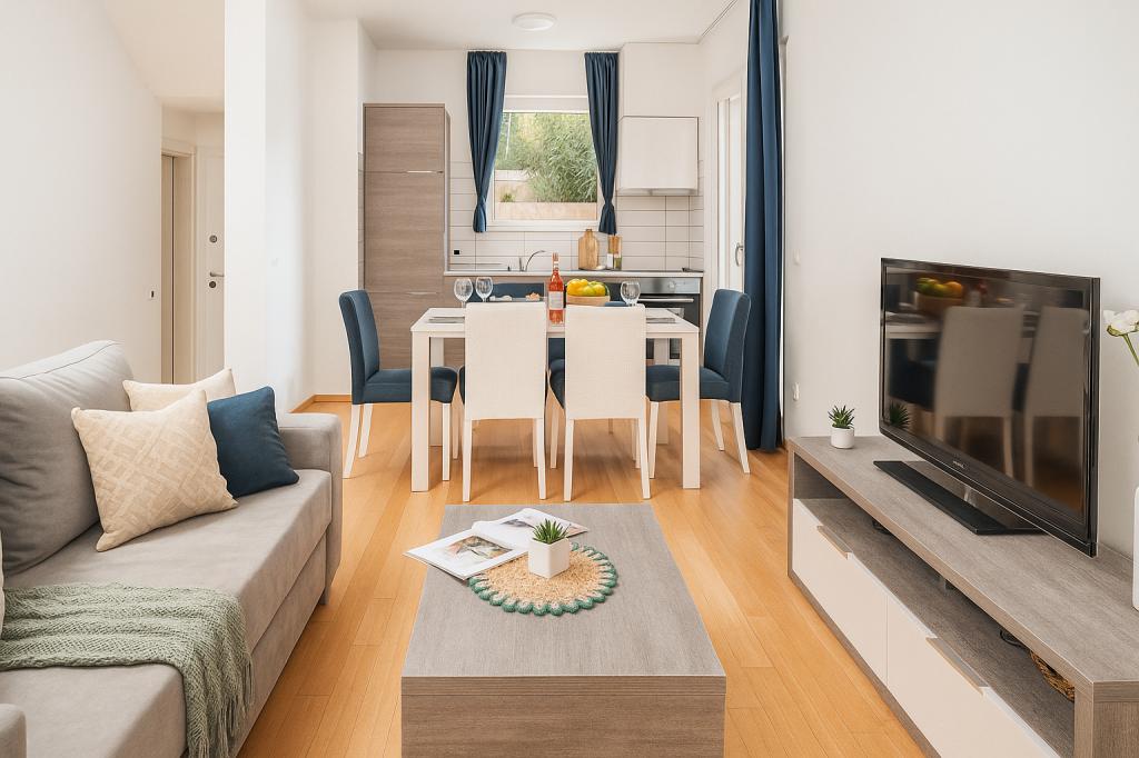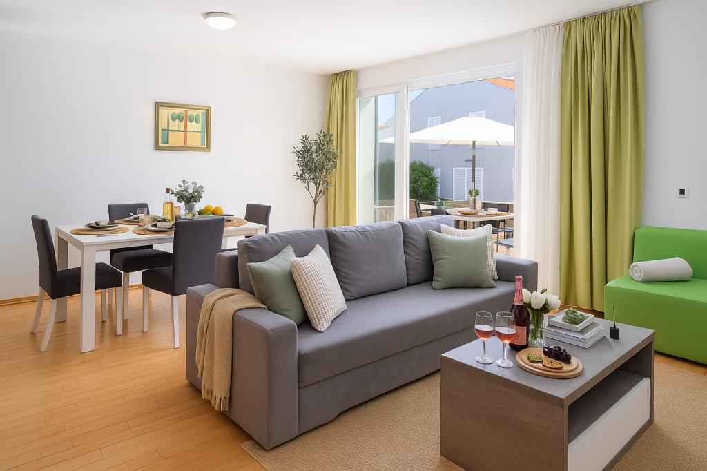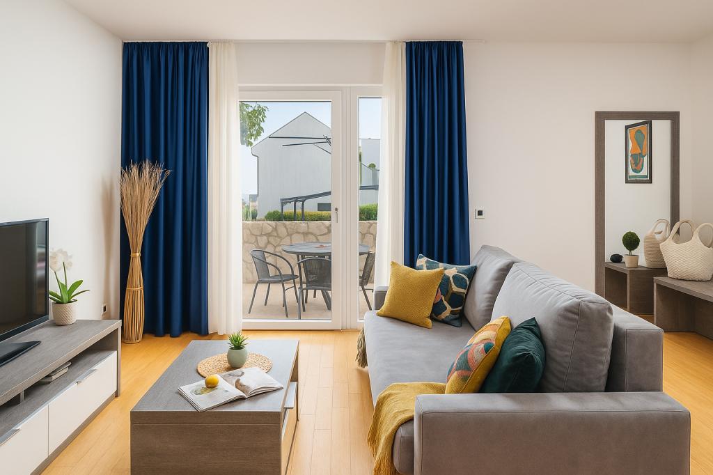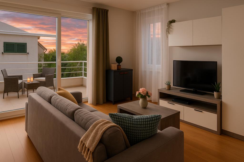 Apartmani Sunny Resort u Pretrčanima nudi savršen spoj udobnosti i vrhunske lokacije za opuštajući odmor. SmještenI u kompleksu Sunny Resorta, u neposrednoj blizini hotela Falkensteiner Diadora i Iadera. Opis apartmana - Kapacitet: do 4-6 osoba (1-2 spavaća soba s bračnim krevetom + kauč na razvlačenje u dnevnom boravku) - Površina: 49-75 m² - Pogled: balkon i terasa s pogledom na more - Opremljenost: klima uređaj, potpuno opremljena kuhinja, Wi-Fi, TV ravnog ekrana, Netflix