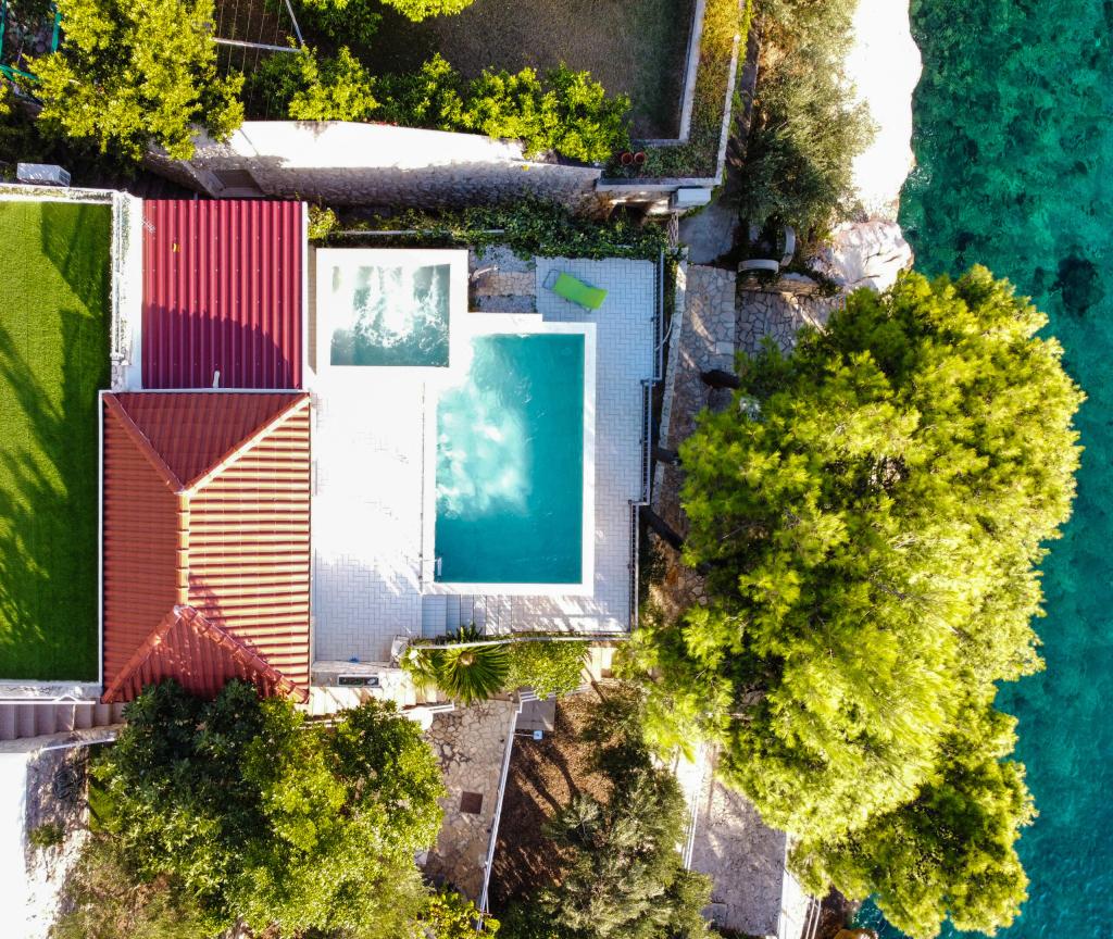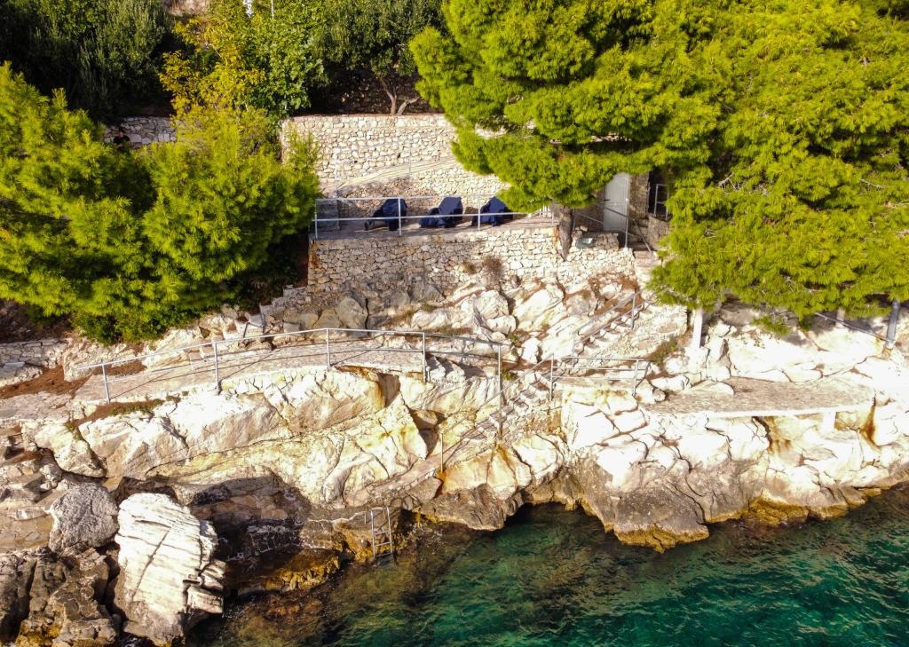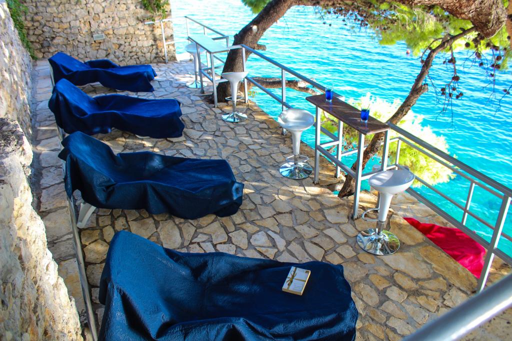 Zagarantirane dvije ležaljke po jednom apartmanu u hladovini borovih stabala. U sklopu plaže se nalazi i vanjski tuš. Reflektor na plaži za noćno kupanje ispod kuće.