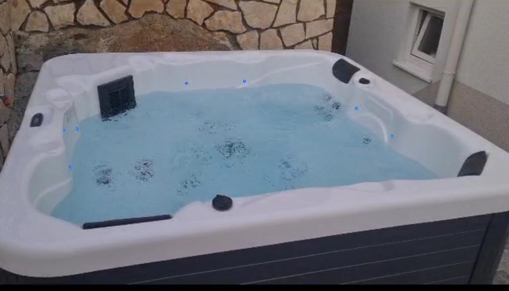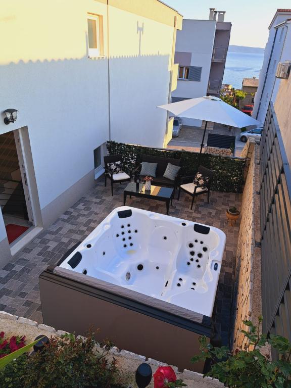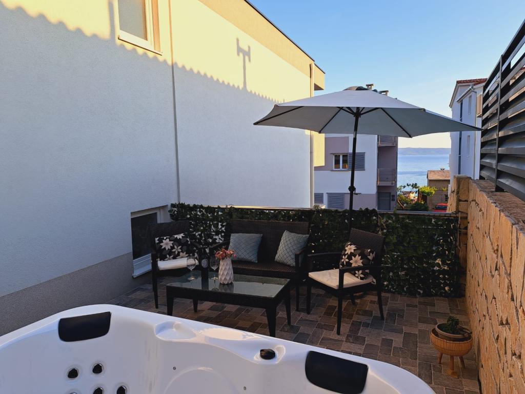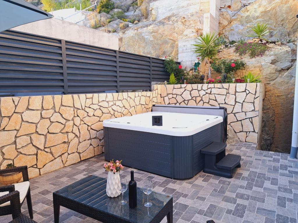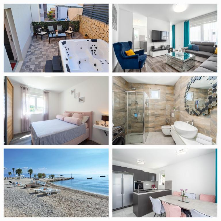 Novi i kompletno opremljen apartman nalazi se u mirnom predjelu s prekrasnim pogledom na more.Idealan za vaš mirni odmor s obitelji.Apartman ima sve što vam je potrebno,grill,dvije terase od kojih jedna ima jacuzzi koji na korištenje imaju isključivo samo gosti apartmana,te dva parkirna mjesta.Udaljen desetak minuta hoda do prekrasne šljunčane plaže.Kao domaćini stojimo Vam 24 sata na usluzi.Nadamo se da ćetete izabrati baš naš apartman za Vaš odmor te se radujemo Vašem dolasku.