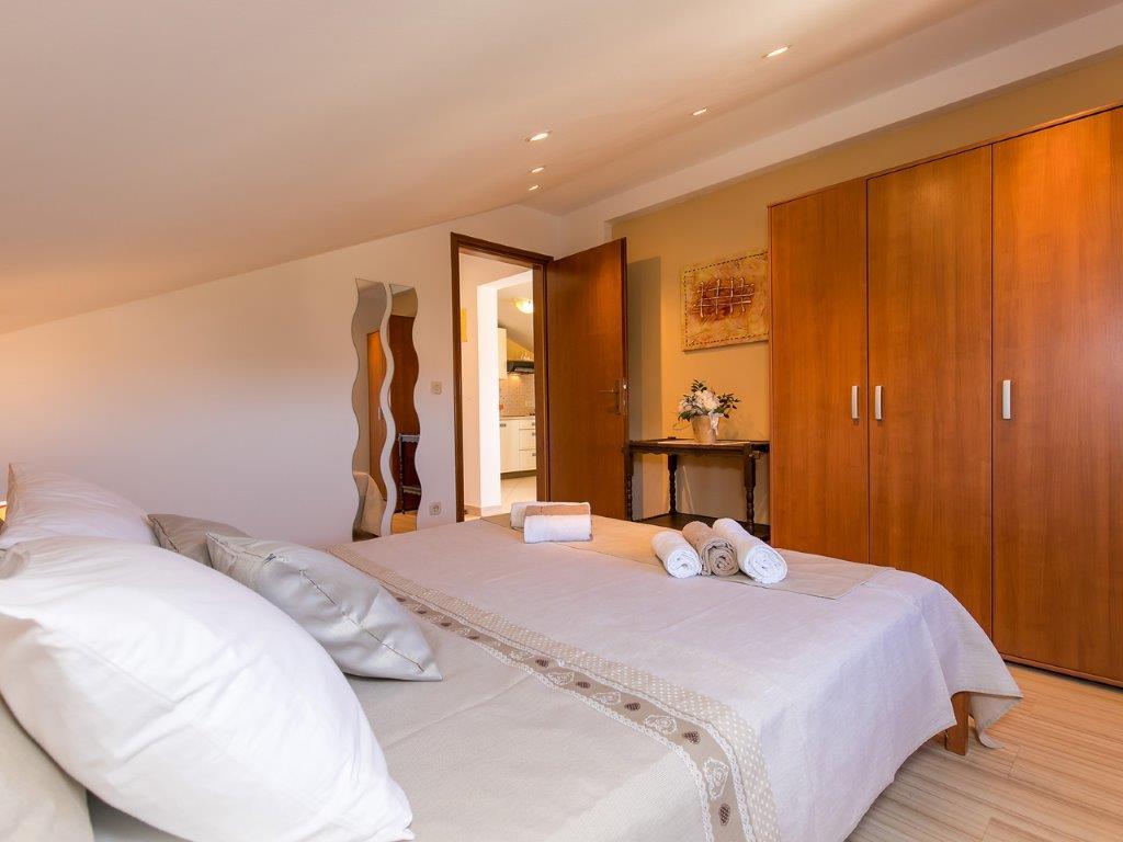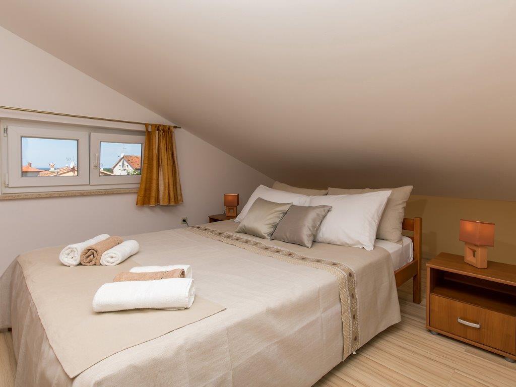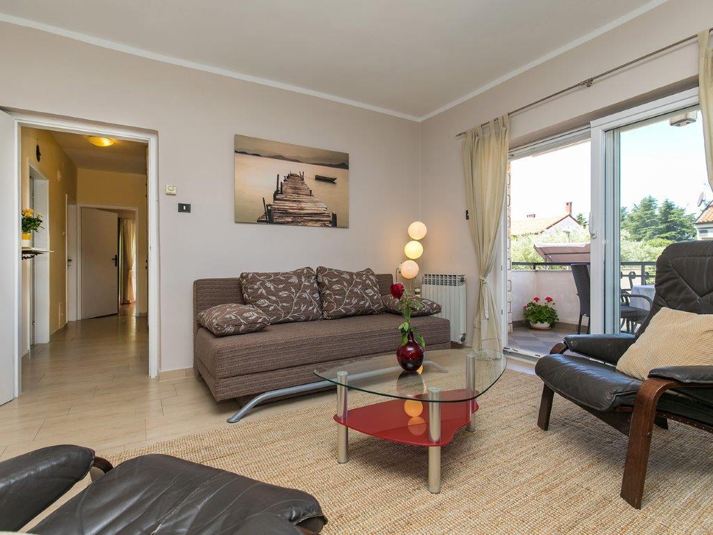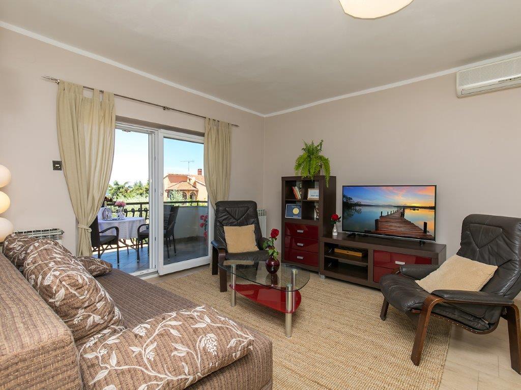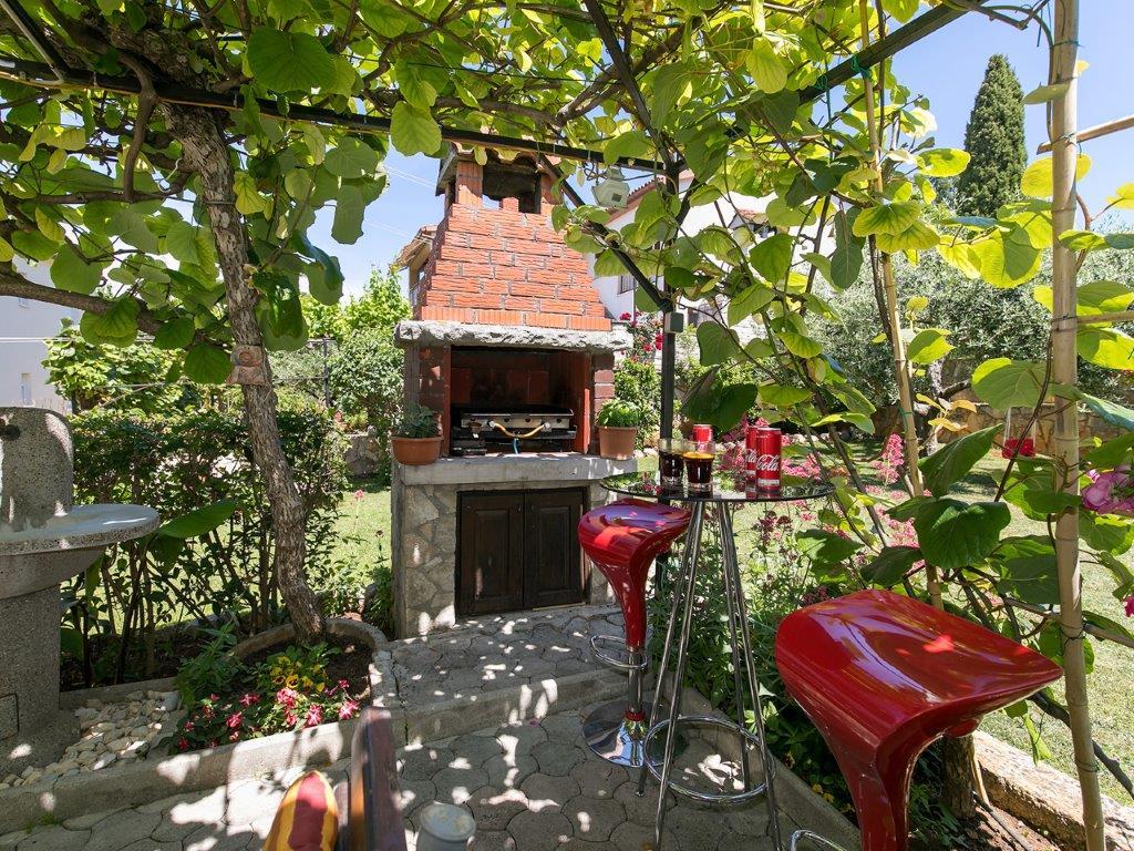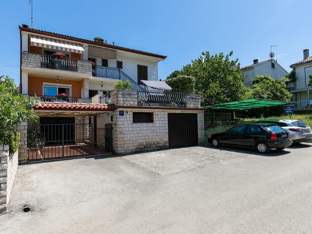 Nalazimo se u mirnoj zoni u neposrednoj blizini grada. Apartman ima 3 spavaće sobe s duplim krevetima, kuhinje, blagovaone, hodnika, te 3 kupatila s tuš kabinom, wc-om i bideom. U apartmanu postoji sve sto je potrebno kako bi Vas odmor bio pravi odmor. Sva je posteljina na raspolaganju kao i kompletan pribor za jelo i pice, frižider, aparat za kavu, električni štednjak, mikrovalna pećnica, TV sa satelitskim prijemom i osim toga imate besplatni pristup internetom neograničenim korištenjem. Ispred apartmana se nalazi velika terasa sa stolom i stolice, te ležaljke. Iza apartmana je pravi raj, u velikoj hladovini imate veliki stol i možete koristiti grill, dok djeca mogu opušteno igrati na zelenoj travi. Ispred kuće je privatni besplatni parking. U blizini, na 50 m od apartmana imate veliki supermarket, restorani, ambulante a do samog centra imate 400 m, isto tako i do prve plaze. Naravno nije Vam potreban automobil, jer laganom šetnjom stižete za 7-8 minuta.