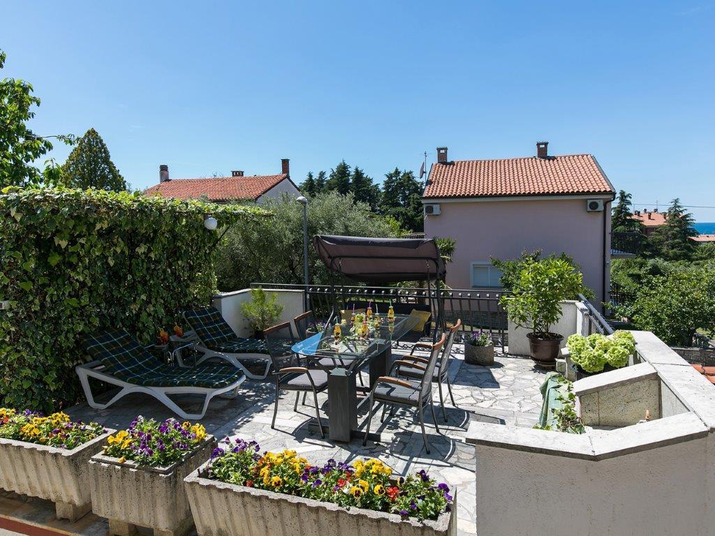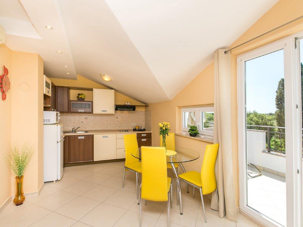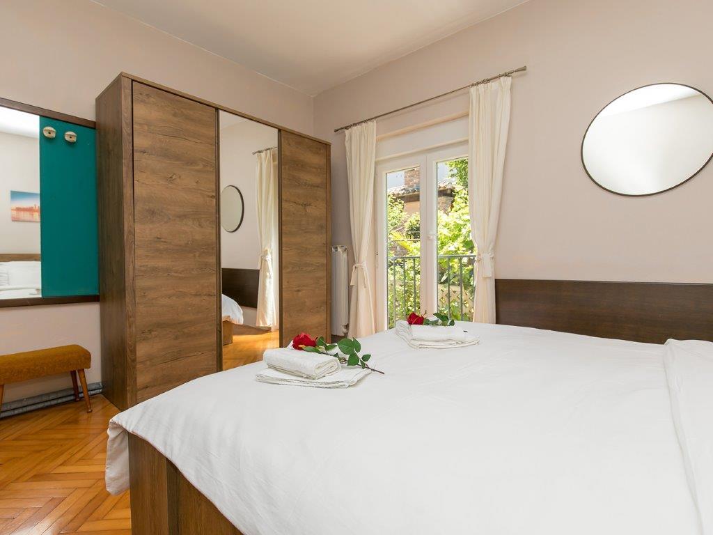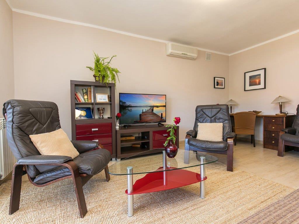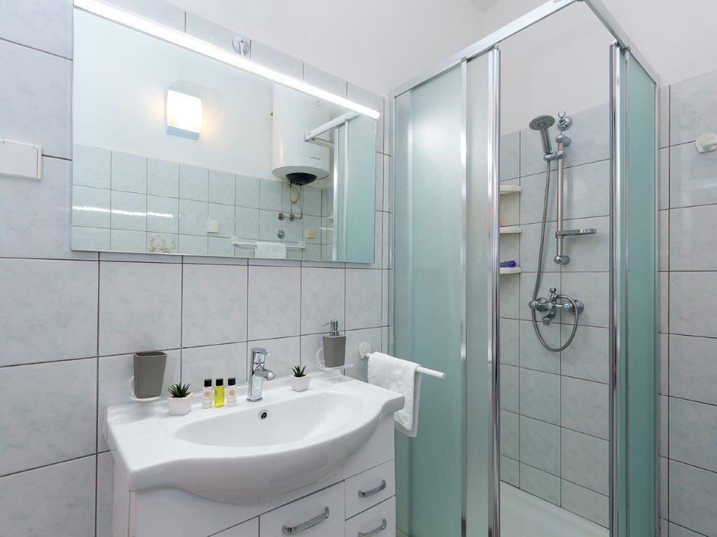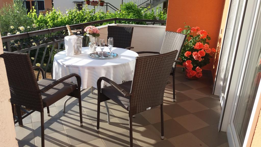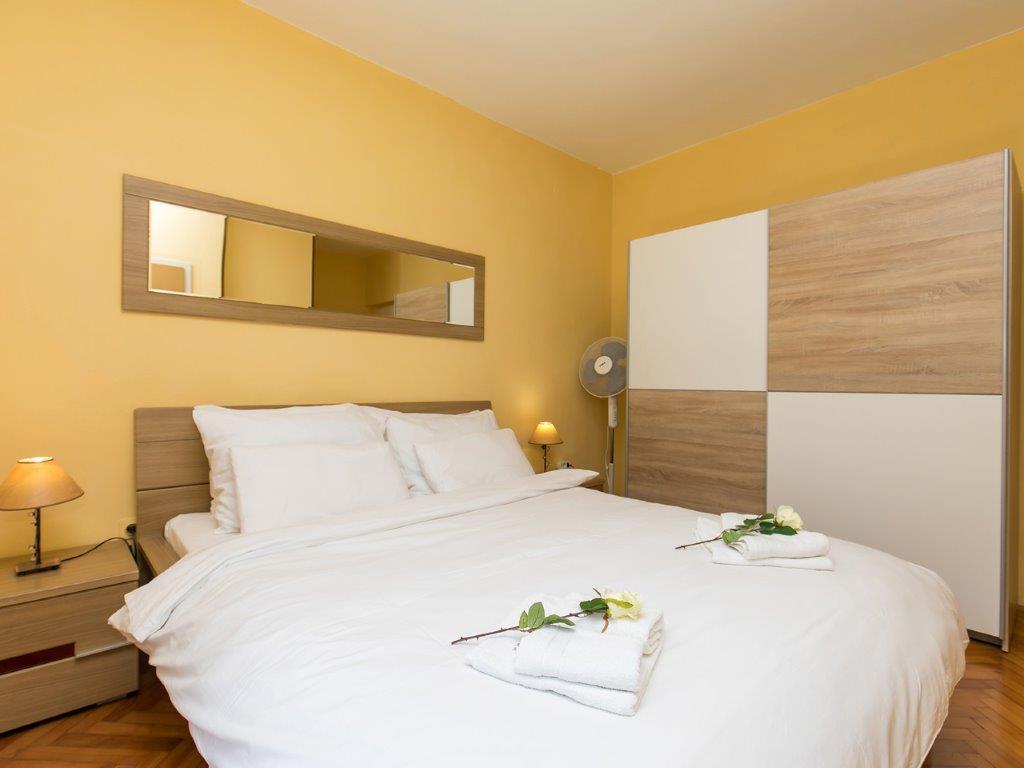 Nalazimo se u mirnoj zoni u neposrednoj blizini grada. Apartman ima 3 spavaće sobe s duplim krevetima, kuhinje, blagovaone, hodnika, te 3 kupatila s tuš kabinom, wc-om i bideom. U apartmanu postoji sve sto je potrebno kako bi Vas odmor bio pravi odmor. Sva je posteljina na raspolaganju kao i kompletan pribor za jelo i pice, frižider, aparat za kavu, električni štednjak, mikrovalna pećnica, TV sa satelitskim prijemom i osim toga imate besplatni pristup internetom neograničenim korištenjem. Ispred apartmana se nalazi velika terasa sa stolom i stolice, te ležaljke. Iza apartmana je pravi raj, u velikoj hladovini imate veliki stol i možete koristiti grill, dok djeca mogu opušteno igrati na zelenoj travi. Ispred kuće je privatni besplatni parking. U blizini, na 50 m od apartmana imate veliki supermarket, restorani, ambulante a do samog centra imate 400 m, isto tako i do prve plaze. Naravno nije Vam potreban automobil, jer laganom šetnjom stižete za 7-8 minuta.