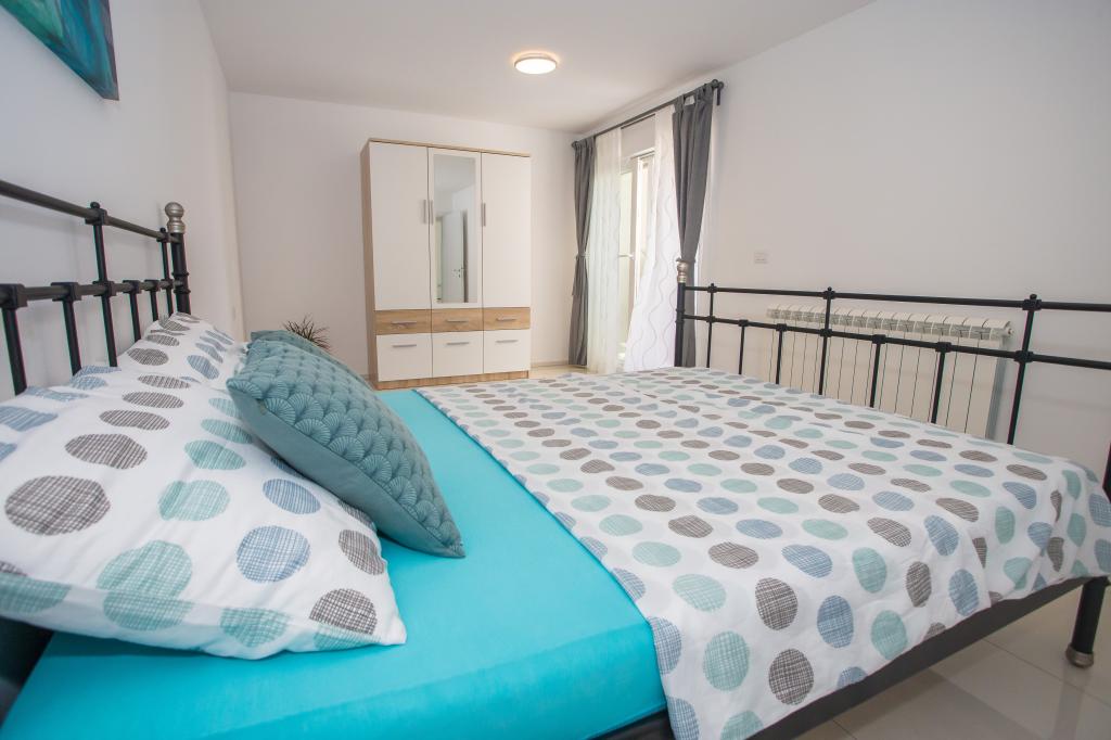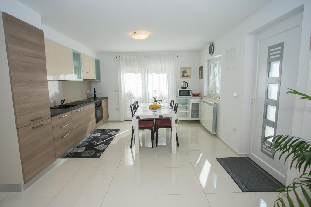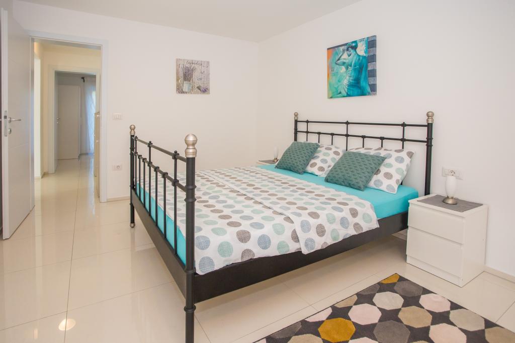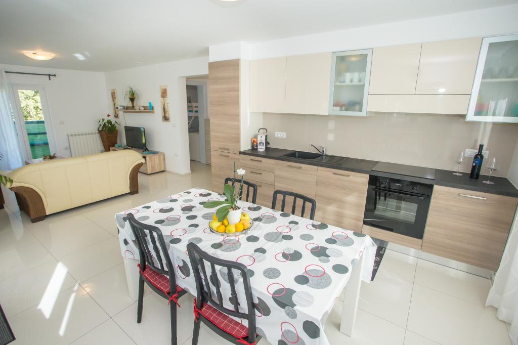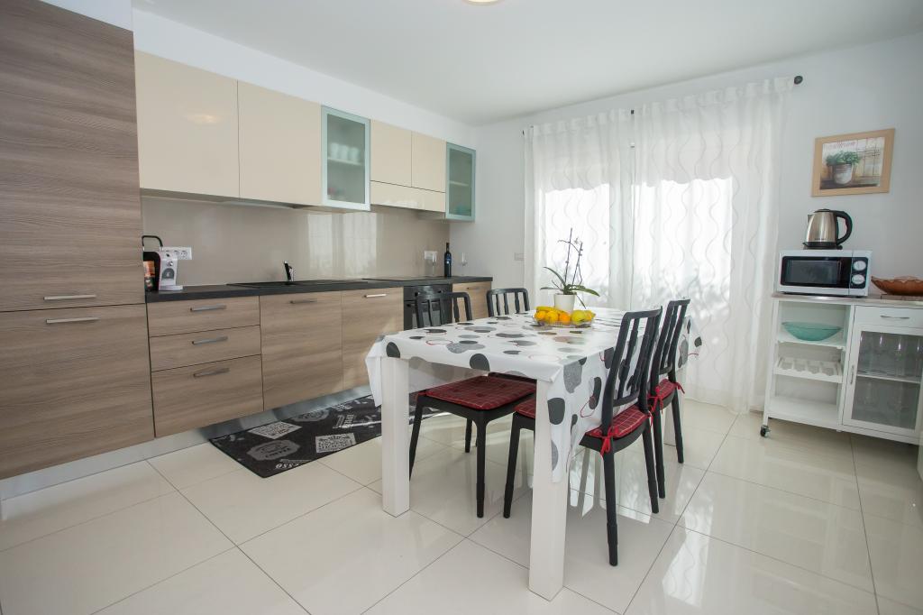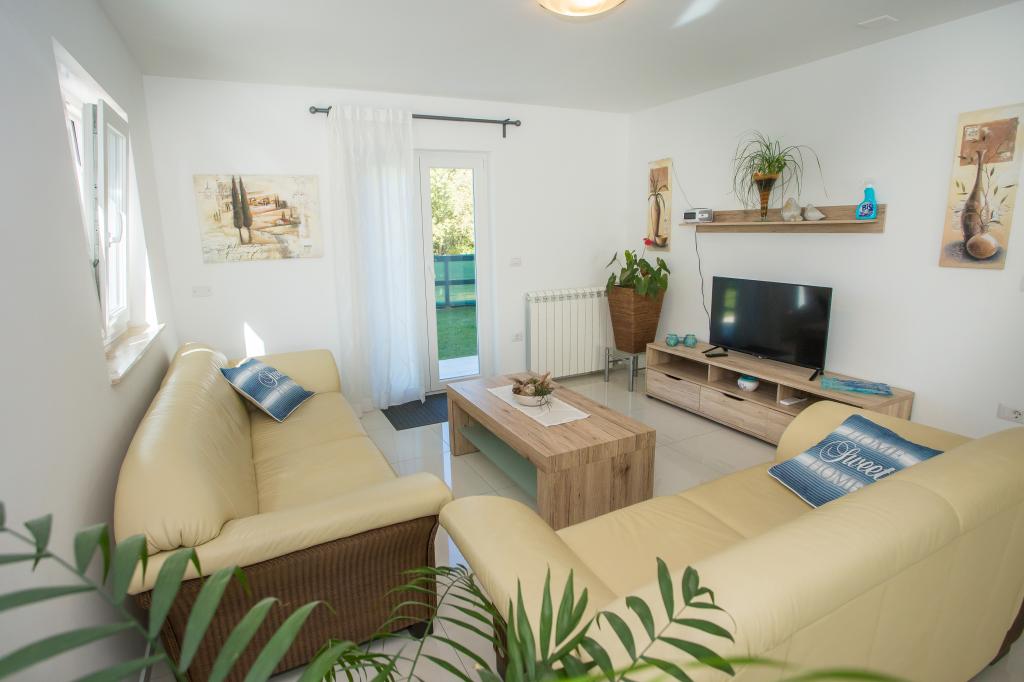 Apartman(75 m2) ima dvije spavaće sobe. Jedna je sa velikim krevetom(160X200) a druga je sa krevetom na kat, donji krevet je 140X200 a gornji 90X200. Kupaonica je sa tušem i perilicom za veš. Dnevni boravak je sa klimom i Sat -Tv. Kuhinja je opremljena sa: hladnjak sa frizerom, perilica suđa, mikrovalna, pečnica, kuhalo, toster, aparat za kavu, i druge kuhinjske potrepštine. Iz svih navedenih prostorija se izlazi u vrt koji je ograđen i pogodan za obitelj sa djecom. Posteljina i ručnici se mjenjaju jednom tjedno( i na upit).