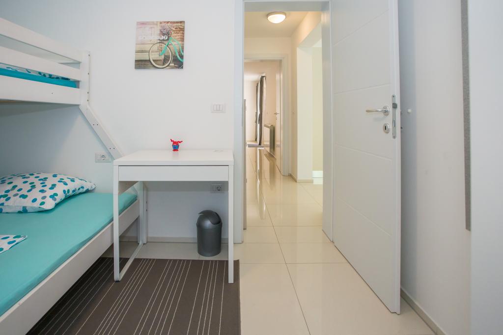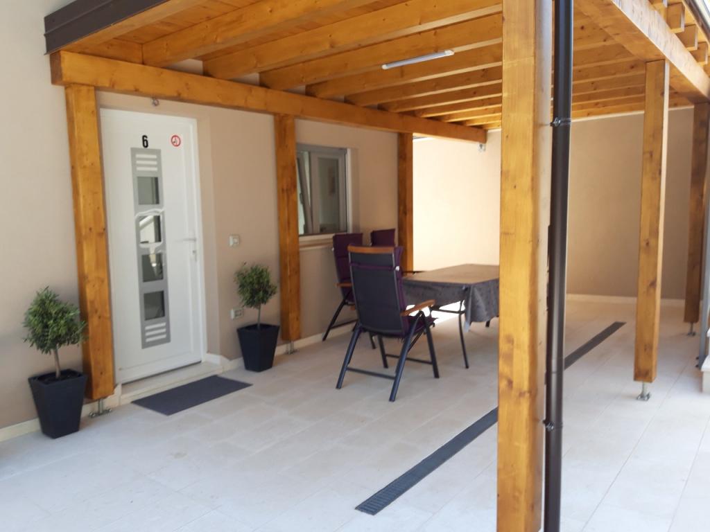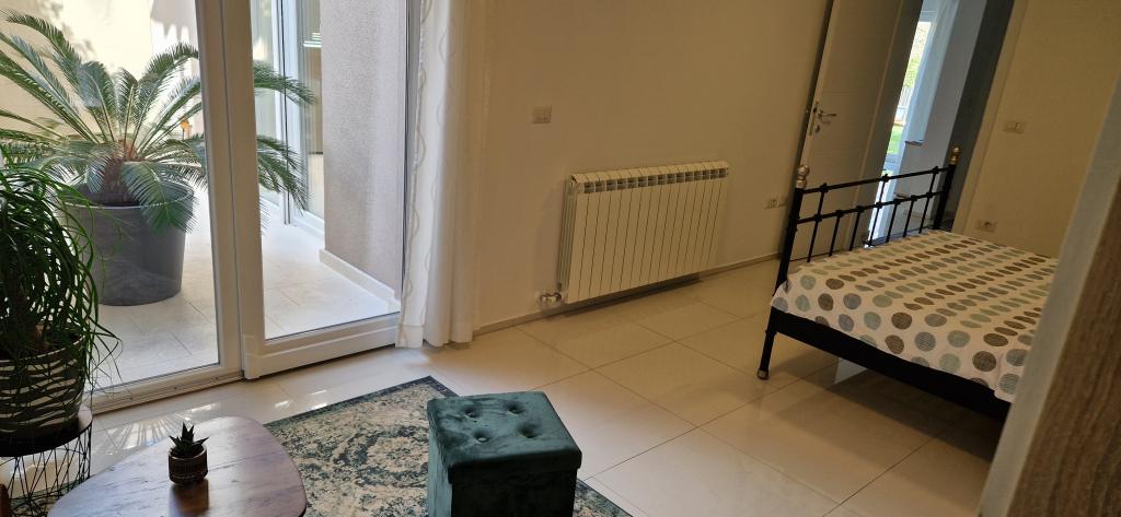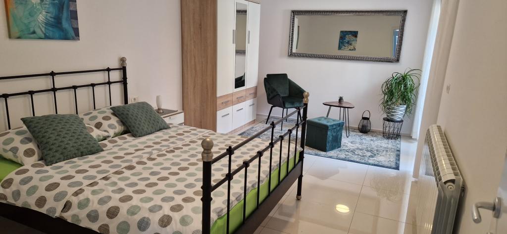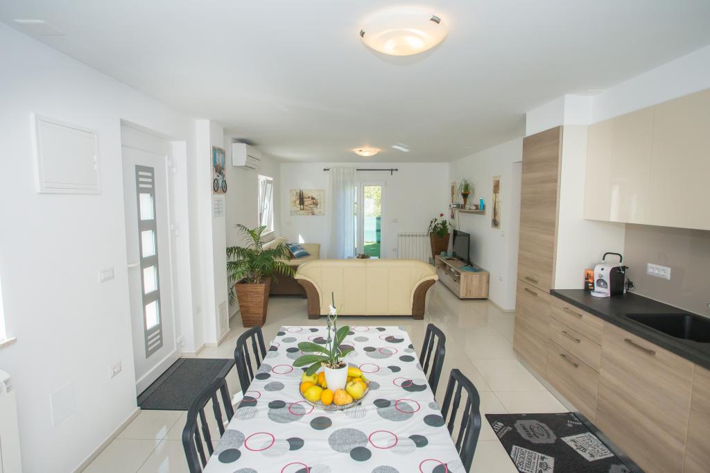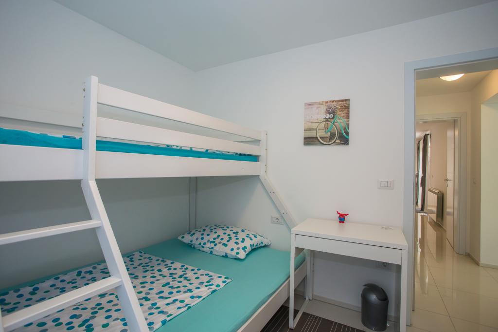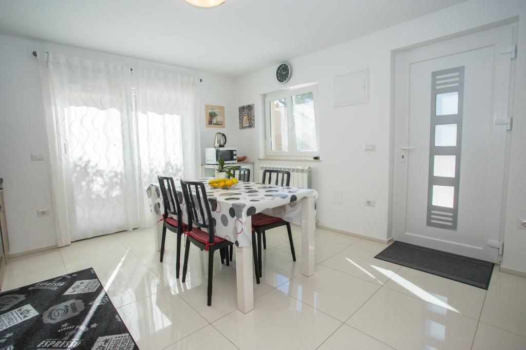 Apartman(75 m2) ima dvije spavaće sobe. Jedna je sa velikim krevetom(160X200) a druga je sa krevetom na kat, donji krevet je 140X200 a gornji 90X200. Kupaonica je sa tušem i perilicom za veš. Dnevni boravak je sa klimom i Sat -Tv. Kuhinja je opremljena sa: hladnjak sa frizerom, perilica suđa, mikrovalna, pečnica, kuhalo, toster, aparat za kavu, i druge kuhinjske potrepštine. Iz svih navedenih prostorija se izlazi u vrt koji je ograđen i pogodan za obitelj sa djecom. Posteljina i ručnici se mjenjaju jednom tjedno( i na upit).