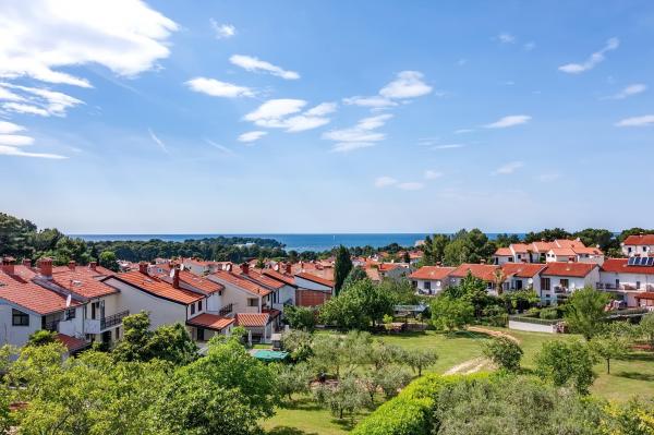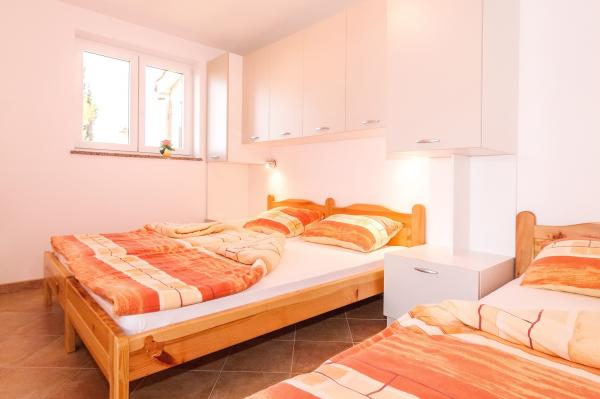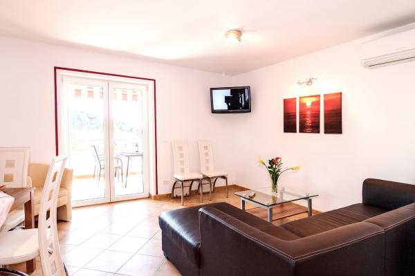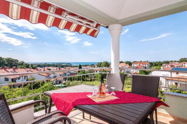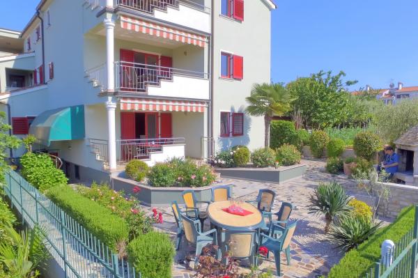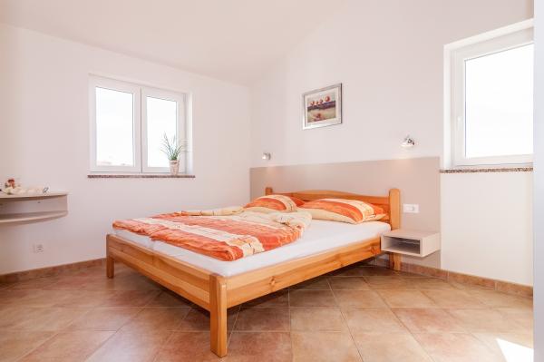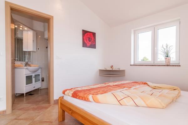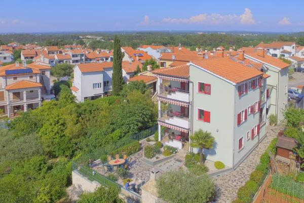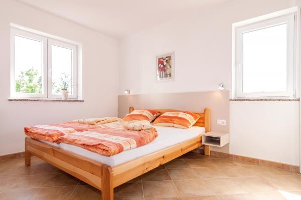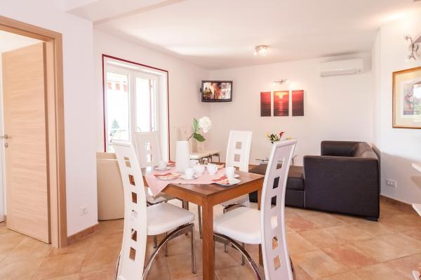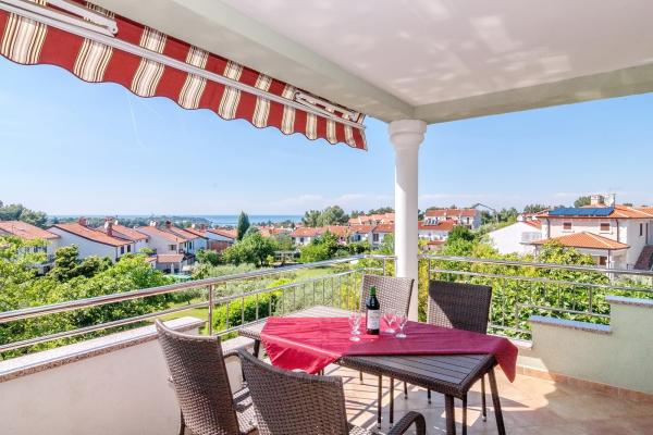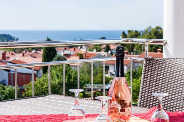 Luksuzan apartman Beethoven kao Penthouse na 2. katu vile Symphonie koja ima 270 stupnjeva opširan pogled na Plavu Lagunu, te Jadransko more prema Veneciji, isto tako i prema talijanskim i slovenskim Alpama, može se do 5 osoba komotno ljetovati. Pozicija te vile će vas svakako oduševiti. Spavaće i dječje sobe (3 kreveta) imaju zasebno svoje elegantne kupaone te dovoljno mjesta. Kuhinja je kompletno uređena kao napr. sa: ceran-štednjakom i pečnicom, frižider sa dubokim zamrzavanjem, mikrovalni uređaj, mašine za suđe i rublje, usisavač. Na balkonu koji raspolaže sa električnom tendom, može se komotno sa 6 osoba sjediti i predivan pogled uživati. Cijeli apartman je iz higijenskih razloga popločen te se može jednostavno čisto održavati. U apartmanu mogu ljetovati obitelji a i isto tako rado 2 para koji mogu biti zajedno i svejedno ne trebaju ostati bez \osobnog kuta\. Dodatna ugodnost objekta: WLAN, klima uređaji za hlađenje i grijanje, safe, fem, mjesta za bicikle, veliki kamin za roštijl