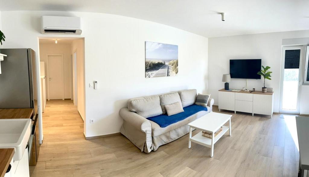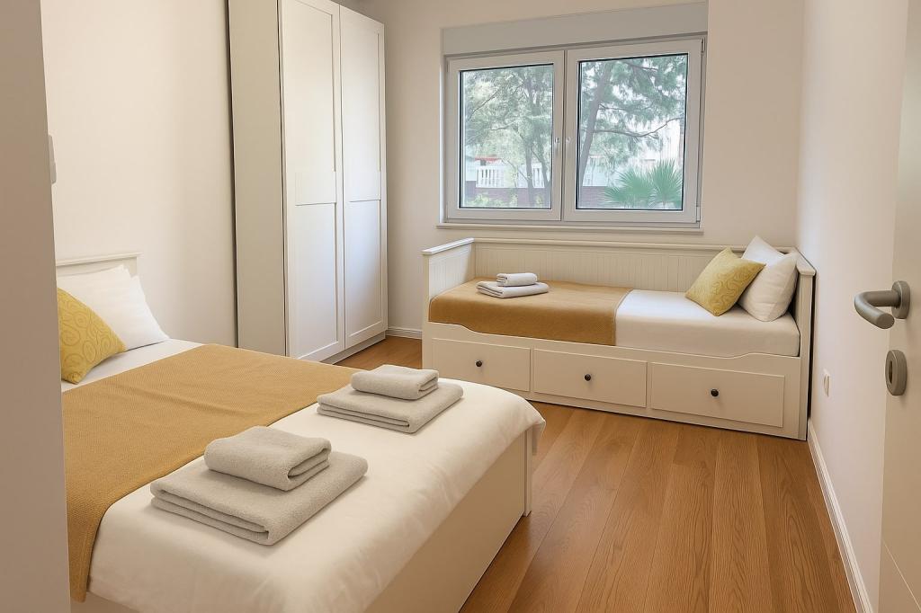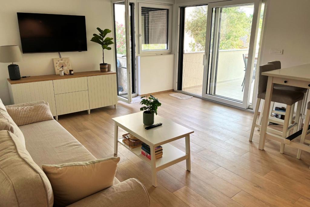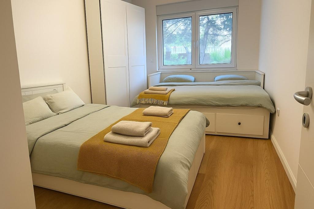 Dobrodošli u Apartman Maris! Naš novi apartman s predivnim pogledom na more nalazi se samo 70 metara od prekrasne plaže Dubrovnik okružene palmama. Za manje od minute hoda možete uživati u kristalno čistom moru ili se opustiti u jednom od obližnjih kafića i restorana. Apartman ima dvije udobne spavaće sobe, potpuno opremljenu kuhinju i prostrani dnevni boravak uređen u svijetlim, obalnim tonovima s mediteranskim detaljima – savršeno mjesto za opuštajući i ugodan odmor. Svaka soba ima svoju klimu. Za vašu udobnost, osigurano je besplatno parkirališno mjesto. Apartman se nalazi u mirnom okruženju, idealnom za obiteljski odmor. Trgovina je udaljena samo 5 minuta hoda. U blizini, na minutu hoda, nalazi se pekara s svježim kruhom te štand s domaćim voćem i povrćem.