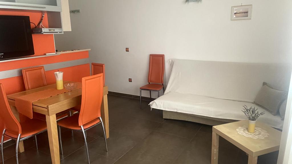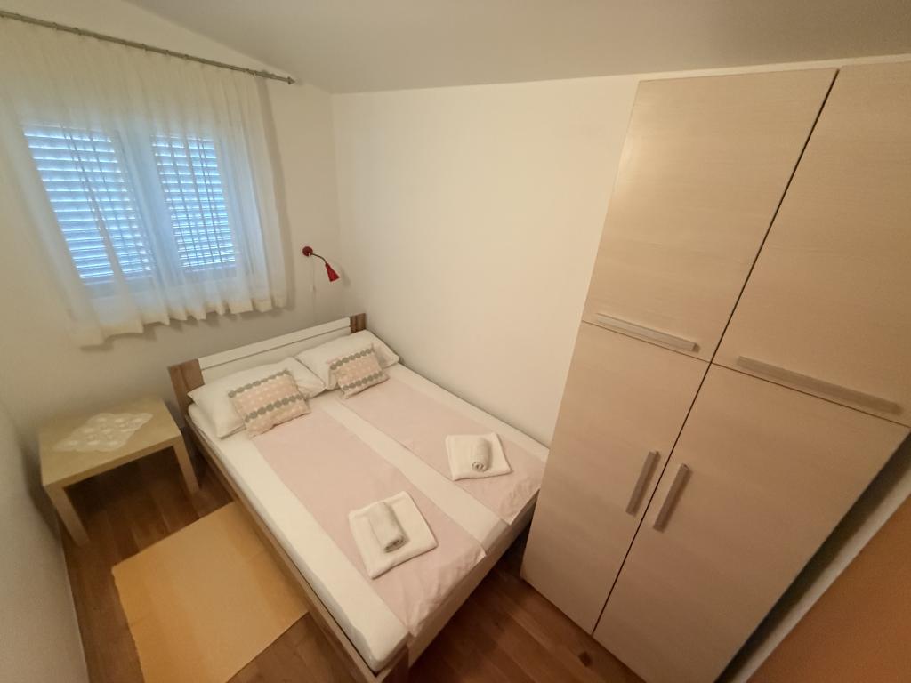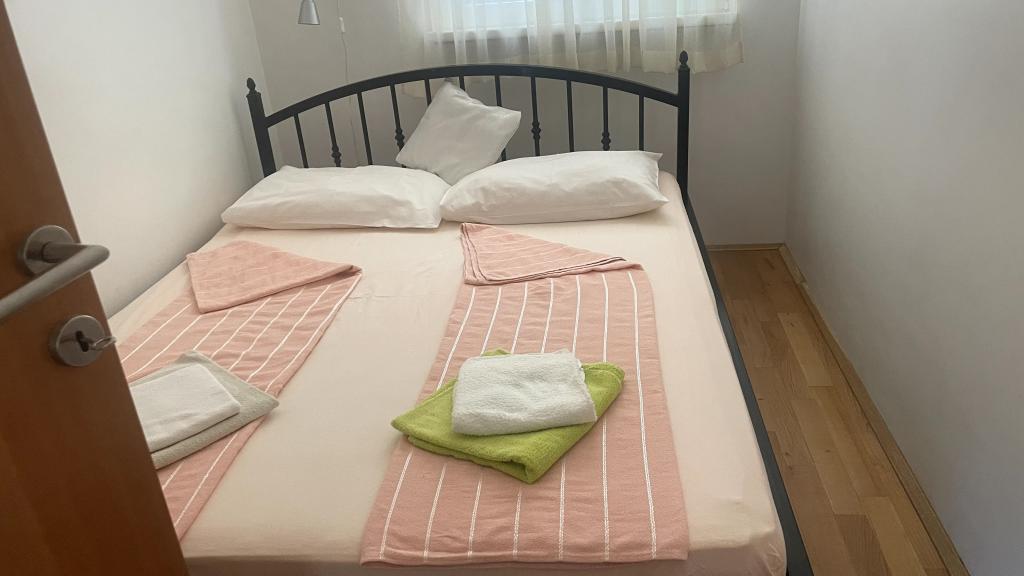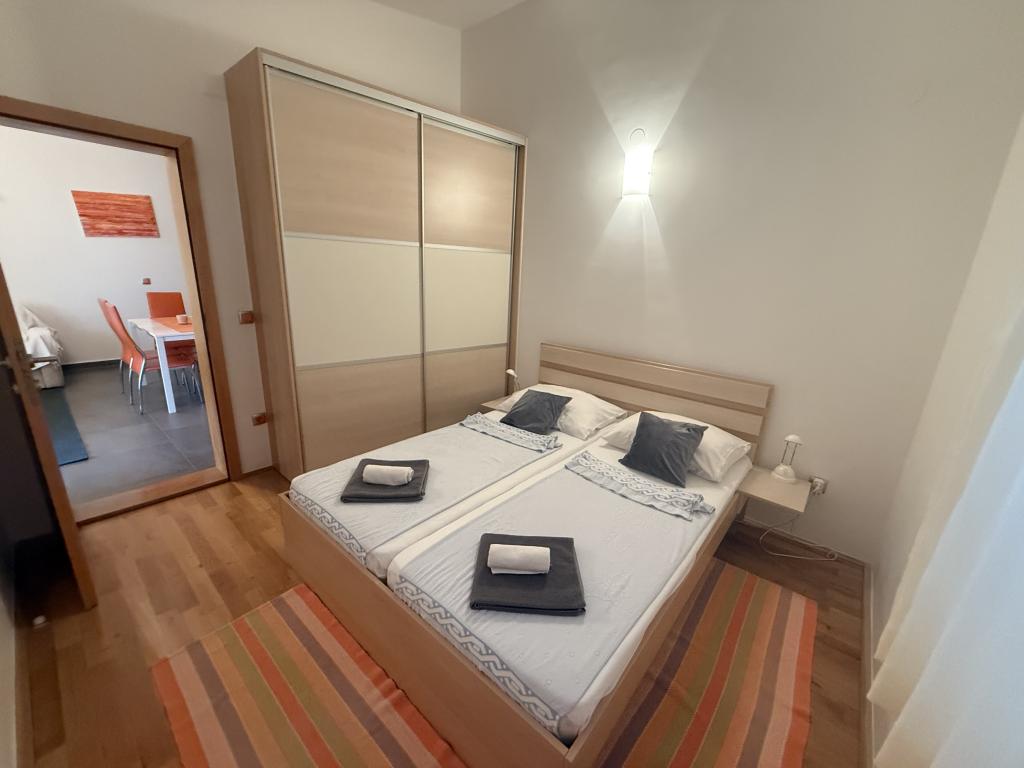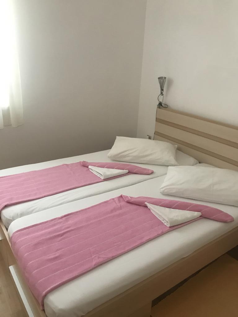 Apartmani idealni za obiteljski odmor U našoj ponudi imamo tri gotovo identična apartmana, svaki prilagođen za udoban obiteljski odmor. Svaki apartman sastoji se od: Dnevnog boravka s blagovaonom i kuhinjom Dvije spavaće sobe: roditeljska (160x200) i dječja (140x200) Dnevni boravak s kaučem. Kuhinja je opremljena standardnim pećnicama s indukcijskom pločom, manjim frižiderom, kuhalom za vodu i filter aparatima za kavu, kao i svim potrebnim posuđem. Kupaonica ima tuš kabinu, mala je, ali funkcionalna. Svaki apartman sadrži mirni kutak u obliku loggie s pomičnom stijenom. Na svim prozorima nalaze se mrežice protiv komaraca. Za naše goste također je dostupan vanjski roštilj s stolom i stolicama za uživanje na otvorenom. Naš higijenski standard je vrlo visok, što nam je posebno važno. U cijenu je uključeno: Klima uređaj Boravišna pristojba TV sat (nemamo Smart TV) Kompletno posuđe i posteljina Po jedan ručnik za svakog gosta Kućni ljubimci su dopušteni uz dogovor i posebnu tarifu.