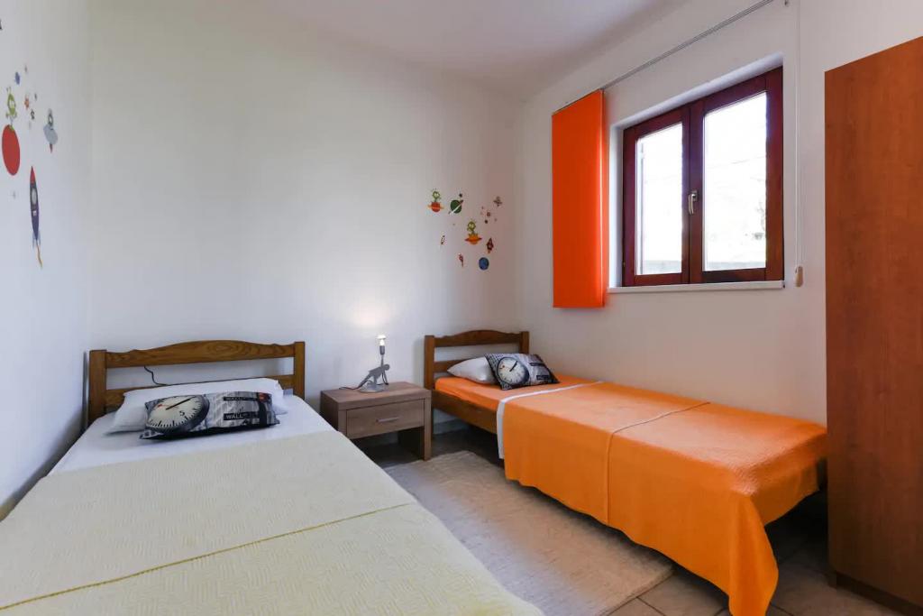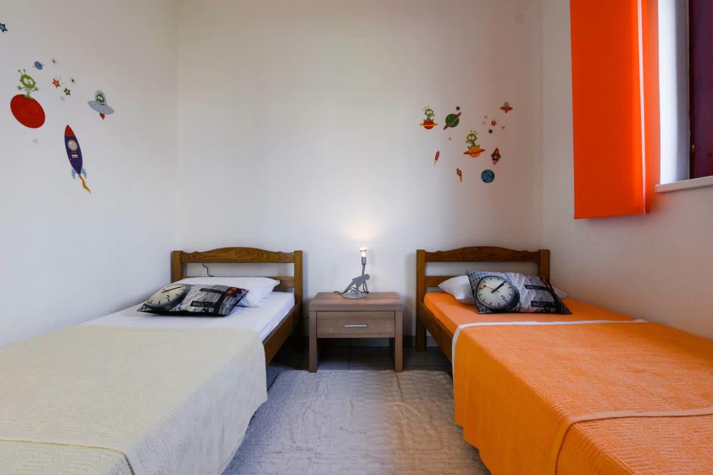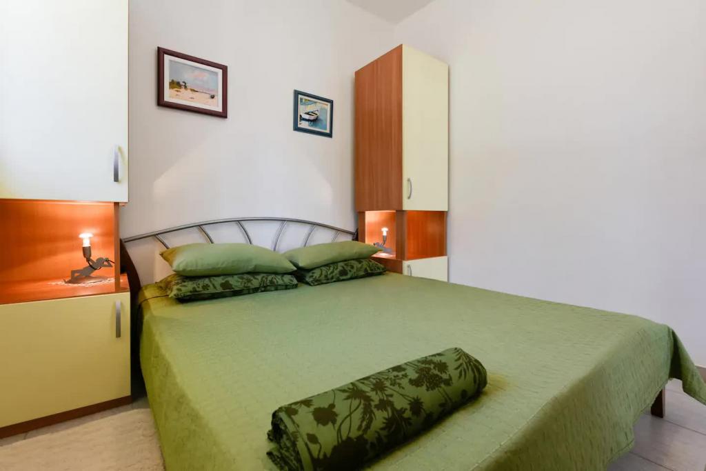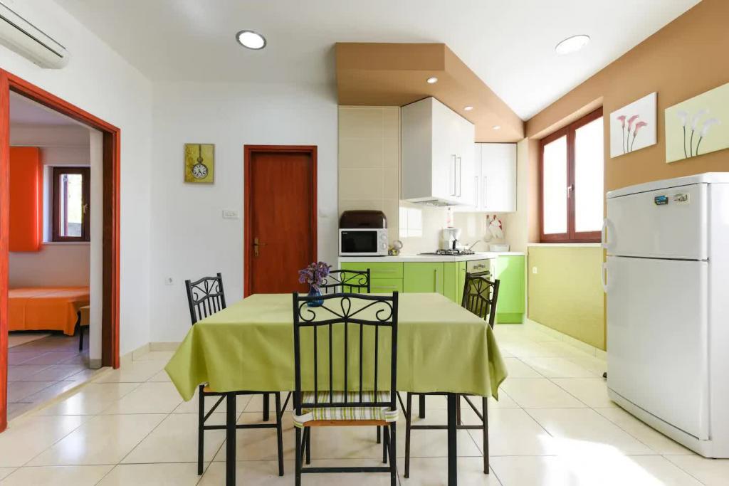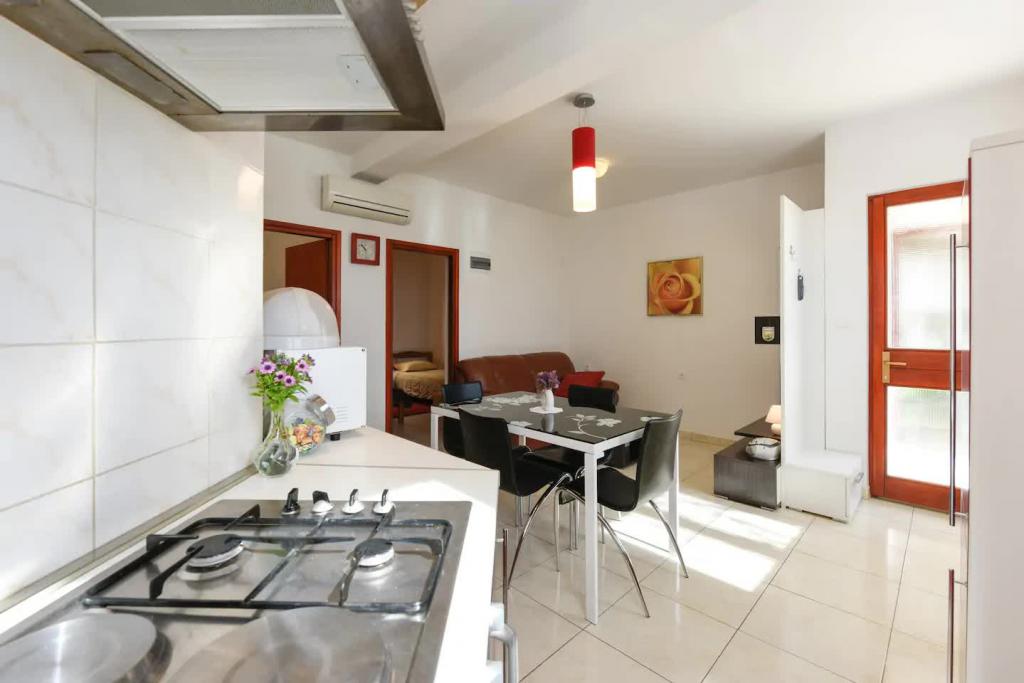 Novi, lijepo opremljeni apartmani u prizemlju obiteljske kuće, udaljeni par koraka od prekrasne plaže Jaz, koja nosi Plavu zastavu i u sklopu koje je odbojkaški igralište. U neposrednoj blizini nalaze se restorani i kafići, a dječje igralište udaljeno je svega dvadesetak metara. Svaki apartman ima vlastitu veliku terasu s pogledom na more. Apartmani imaju dvije spavaće sobe, opremljenu kuhinju, kupaonicu, dnevni boravak, te vanjski roštilj i privatni parking. Poklon dobrodošlice uključen je u cijenu