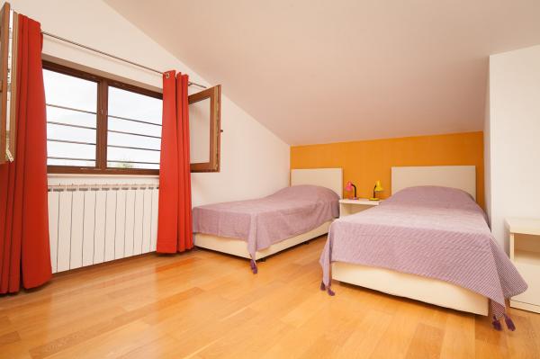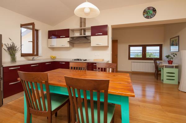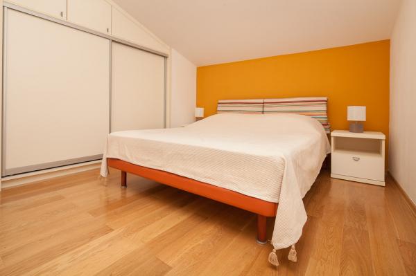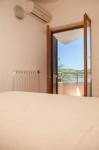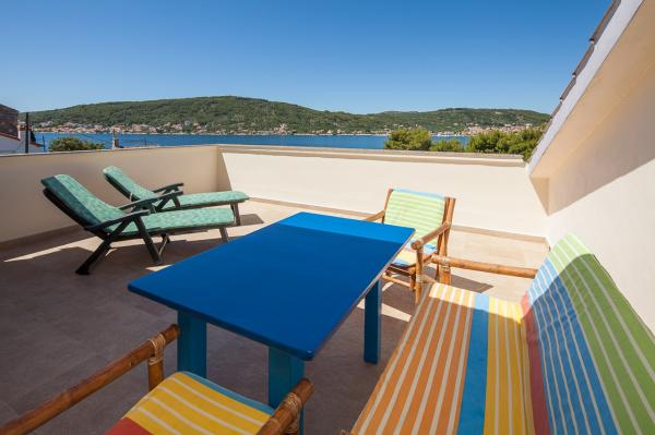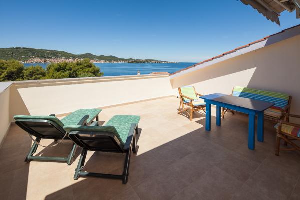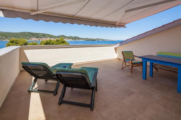 Prostran apartman sa pogledom na more iz svake prostorije, sa terasom velikom 25 m2 koja gleda na more i otok Ugljan. Apartman se nalazi u visokom potkrovlju u kući na otočiću Ošljaku, prvom otoku do Zadra. Apartman ima dvije sobe. Soba sa balkonom ima bračni krevet dimenzija 180×200 cm i zidni ormar te gleda na more i otok Ugljan. Druga soba ima dva kreveta dimenzija 90×200 cm (koji se po potrebi mogu lagano spojiti u veliki bračni krevet) i zidni ormar. Po potrebi može se staviti i dodatni dječji krevetić.Ova soba ima pogled na Zadarski kanal, grad Zadar, Velebit i dio otoka Ugljana. Kupatilo je prostrano sa tuš kabinom i perilicom rublja. Kuhinja ima svo potrebno posuđe, hladnjak, pećnicu i perilicu suđa. Jedan klima uređaj je u dnevnom a drugi u spavaćem dijelu apartmana. Iz dnevnog boravka koji ima veliku kutnu garnituru i televiziju i blagavaonice se izlazi na terasu koja ima stol sa stolicama te dvije udobne ležaljke. Terasa se cijela po potrebi može prekriti sa tendom.