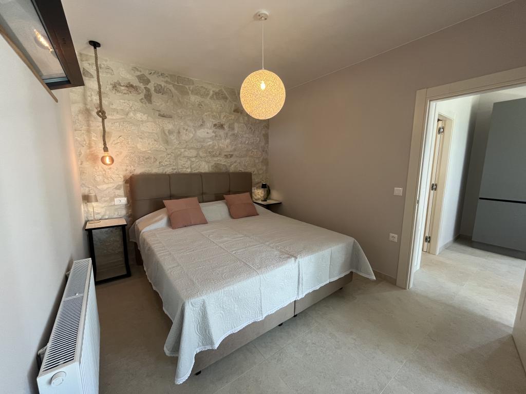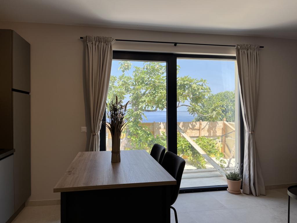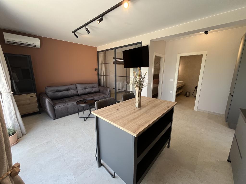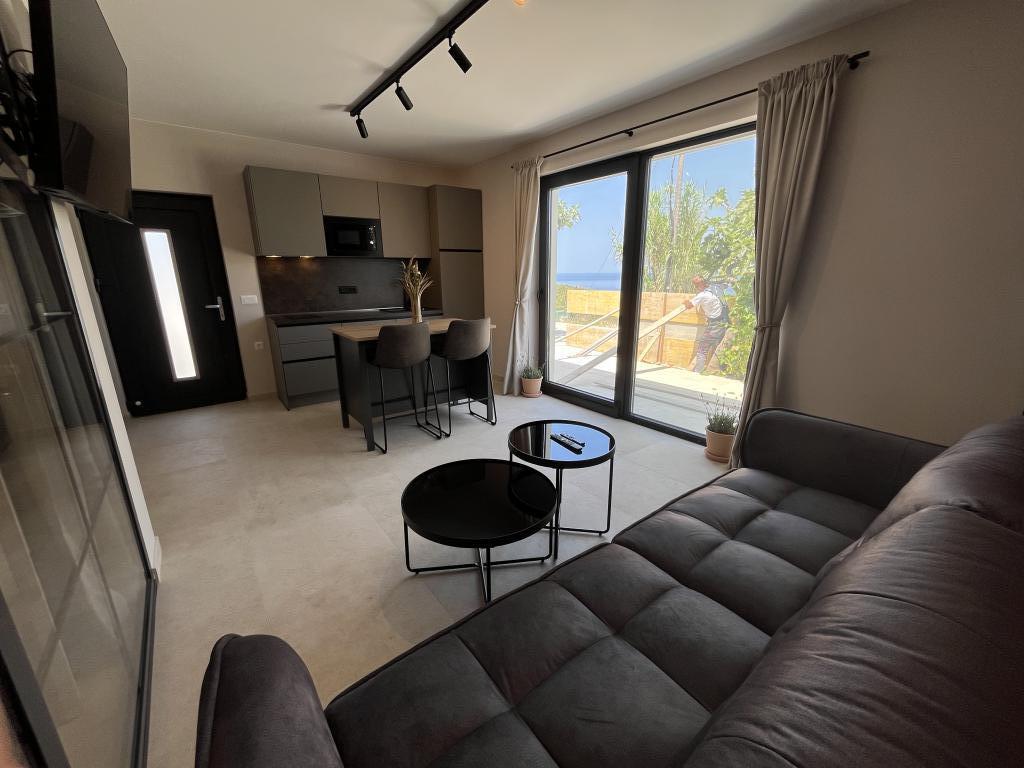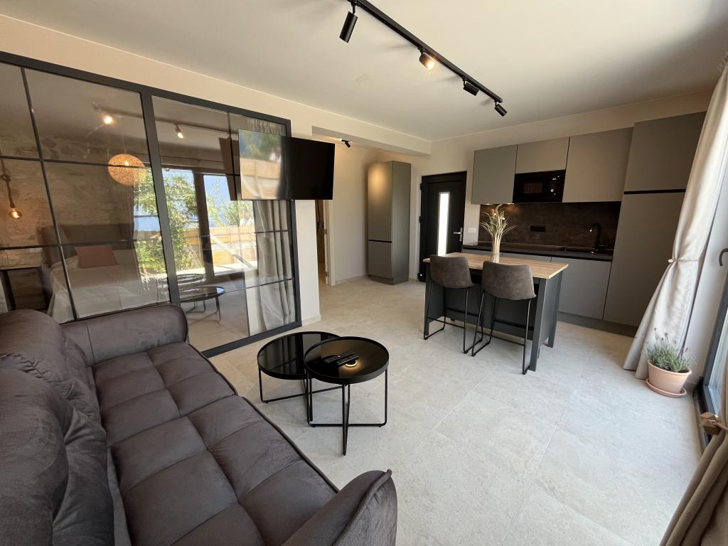Jednosobni apartman od 45 m² pogodan je za parove, obitelji ili bilo koju drugu grupu od 2-4 osobe, s mogućnošću dodatnog ležaja za dvoje na razvlačenje ili dječjeg krevetića na zahtjev. Imanje uključuje dva privatna parkirna mjesta i prizemnu terasu okrenutu ka istoku i zapadu, što vam omogućuje da uživate u sunčanim jutrima i kavi na otvorenom, kao i u ugodnim zalascima sunca i večerima u intimnoj atmosferi. Unutrašnjost apartmana je novoopremljena svim aparatima koji bi vam mogli zatrebati tijekom boravka, kao što su klima uređaj, Wi-Fi, satelitska TV, aparat za kavu, perilica posuđa, perilica rublja, prijenosna pećnica, pegla, sušilo za kosu i još mnogo toga. Spavaća soba, sa udobnim novim king-size krevetom, ima staklenu stijenu koja omogućuje uživanje u pogledu čak i iz kreveta, ali i potpunu privatnost povlačenjem zavjesa. Kupaonica uključuje dvostruki umivaonik, WC, bide i prostranu walk-in tuš kabinu.