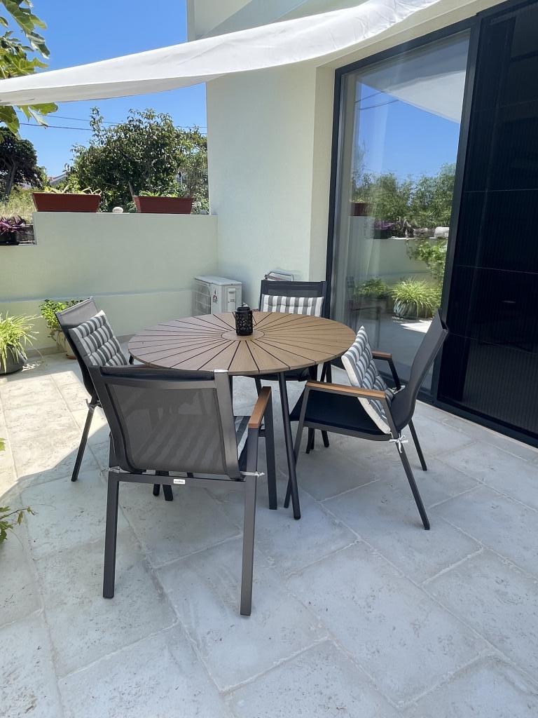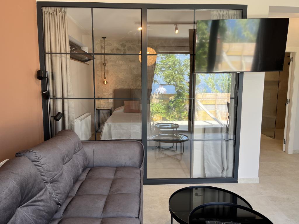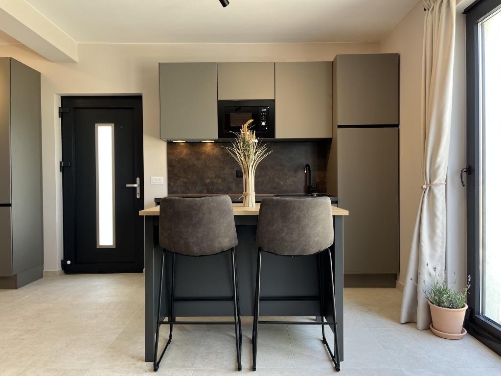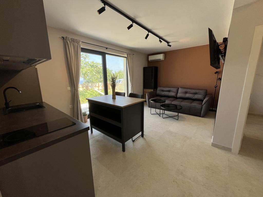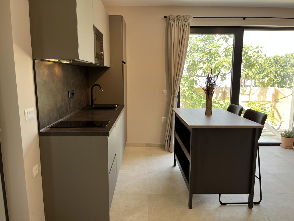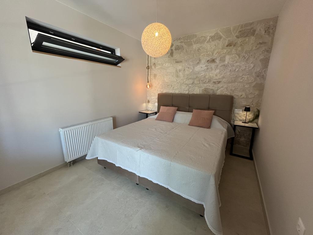 Jednosobni apartman od 45 m² pogodan je za parove, obitelji ili bilo koju drugu grupu od 2-4 osobe, s mogućnošću dodatnog ležaja za dvoje na razvlačenje ili dječjeg krevetića na zahtjev. Imanje uključuje dva privatna parkirna mjesta i prizemnu terasu okrenutu ka istoku i zapadu, što vam omogućuje da uživate u sunčanim jutrima i kavi na otvorenom, kao i u ugodnim zalascima sunca i večerima u intimnoj atmosferi. Unutrašnjost apartmana je novoopremljena svim aparatima koji bi vam mogli zatrebati tijekom boravka, kao što su klima uređaj, Wi-Fi, satelitska TV, aparat za kavu, perilica posuđa, perilica rublja, prijenosna pećnica, pegla, sušilo za kosu i još mnogo toga. Spavaća soba, sa udobnim novim king-size krevetom, ima staklenu stijenu koja omogućuje uživanje u pogledu čak i iz kreveta, ali i potpunu privatnost povlačenjem zavjesa. Kupaonica uključuje dvostruki umivaonik, WC, bide i prostranu walk-in tuš kabinu.