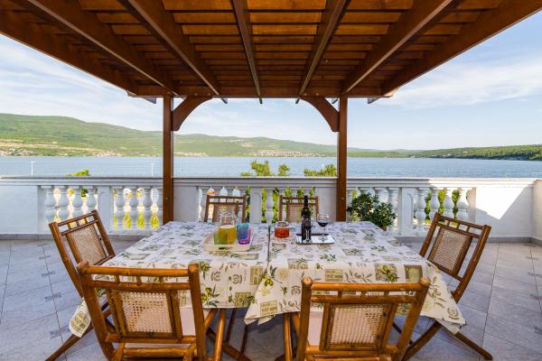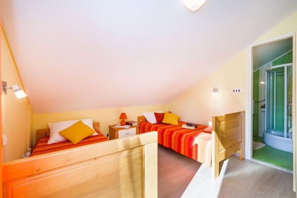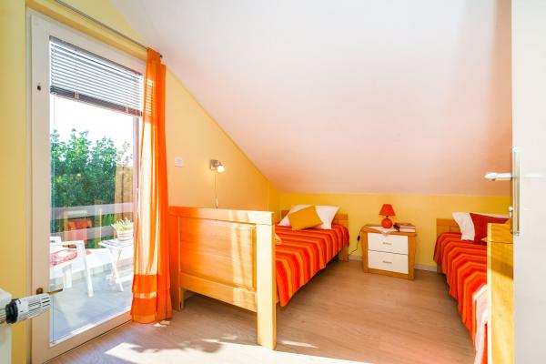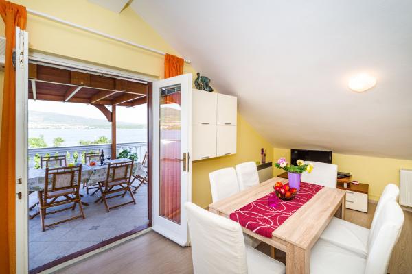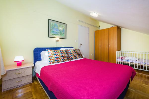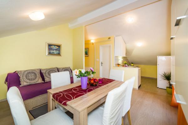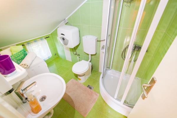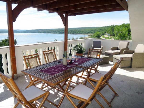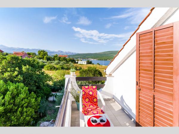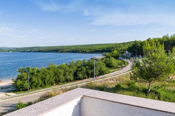 Apartmani Pridraga, Karinsko more, 1. red do mora. Apartman potkrovlje 3, sa 79 m2, 40 m2 terasa s pogledom na more i s pergolom. 2 sobe, 2 kupaone, dnevna soba sa sofom na razvlačenje, kuhinja s perilicom suđa, terasa, balkon. Dva apartmana za po 4 osobe na 1. katu od 38 i 45 m2, lođa pogled na more. Svi apartmani opremljeni su perilicom rublja i perilicom posuđa. U sklopu objekta moguće je koristiti besplatno privatno parkiralište i roštilj. Uređena pjeskovito/šljunkovita plaza s tuševima na plaži. Uređena šetnica uz more i kroz borovu šumu u dužini od cca 4 km. Kafić u borovoj šumi. Udaljenost od centra mjesta cca 2000 m. U centru mjesta postoji nekoliko trgovina s mješovitom robom, tržnica s voćem i povrćem te ostalim domaćim proizvodima, pošta, autobusna postaja.... Objekt pruža odmor u miru i tišini, a za aktivniji odmor nude se izleti/rafting na rijeci Zrmanji, u blizini su Nacionalni parkovi Paklenica i Krka. Udaljenost od aerodroma cca 20 km, od Zadra cca 30 km.