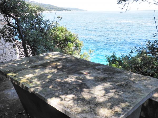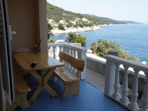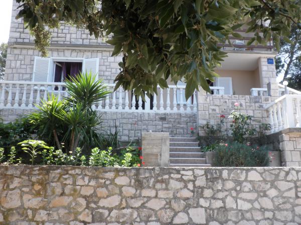 Ovi udobni i prostrani apartmani se nalaze u mirnoj uvali Prigradici, na otoku Korčuli. Smješteni su prvi red do mora i imaju vlastitu plažu (10 m), posebno mjesto u hladovini s kamenim stolom i klupama gdje se mogu sakriti oni kojima dug boravak na suncu smeta. Objekt je udaljen 3 minuta hoda od centra gdje se nalazi trgovina te 7 minuta hoda do šljunčane plaže, sportskog igrališta i restorana. Apartman na prvom katu ima 3 sobe s bračnim krevetom (2. kat 2), kuhinju i dnevni boravak, kupatilo, terasu i vanjski kamin. Dvije spavaće sobe imaju pogled na more i na otok Hvar. Gostu su na raspolaganju 2 ručnika i posteljina, koji se mijenjaju jednom tjedno. Na terasama, s koje se u suton pruža prekrasan pogled na zalazak sunca, se nalaze drvene vrtne garniture. Opremljenost apartmana: klima uređaj, televizor, satelitska antena, hladnjak i zamrzivač, plinski i električni štednjak, pećnica, mikrovalna pećnica, aparat za kavu, toster, pegla, sušilo za kosu, perilica rublja, vanjski roštilj