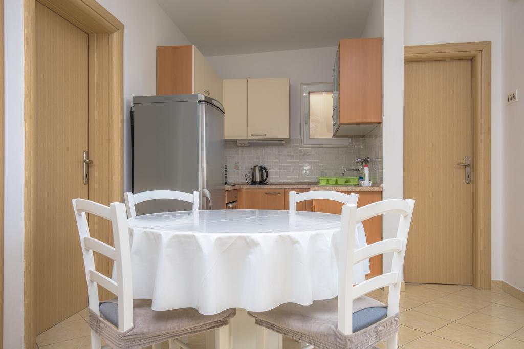 Boravili smo u apartmanu A4 2 tjedna (2 odrasle osobe + 3 djece) i mogu ga samo preporučiti. Vrlo je čist, ima 2 udobne spavaće sobe, potpuno opremljenu kuhinju, dnevni boravak sa sofom i TV-om te balkon gdje možete uživati u kavi i pogledu na more. Nalazi se u mirnom susjedstvu, plaža (s barom) je udaljena 2', a mnoge druge plaže su na pješačkoj udaljenosti. U krugu od oko 5 minuta vožnje nalazi se nekoliko tržnica. Domaćini su vrlo ljubazni, uvijek uslužni i proizvode prvoklasno maslinovo ulje