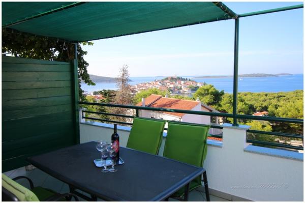 Apartmani se nalaze u mirnom predjelu Primoštena. Potpuno su opremljeni i prostrani s prekrasnim pogledom na more, otoke i staro mjesto. Svi apartmani imaju velike terase koje su opremljene stolovma i sjedalicama gdje gosti mogu uživati u pogledu. U dvorištu se također nalazi gril-kućica, kojom se gosti mogu koristiti. Objekt se nalazi iznad plaže Velika Raduća, udaljen 5 minuta hoda od nje. U dvorištu se nalaze parkirna mjesta za automobile naših gostiju. Velika okućnica obiluje zelenilom i cvijećem.