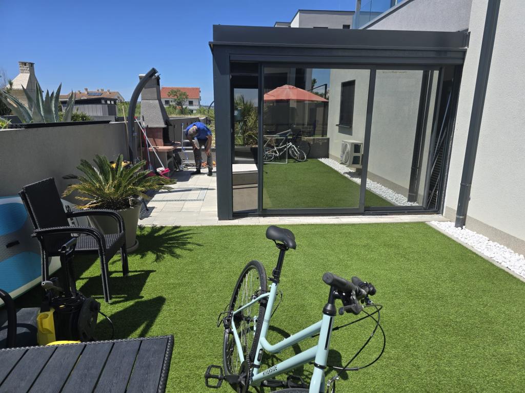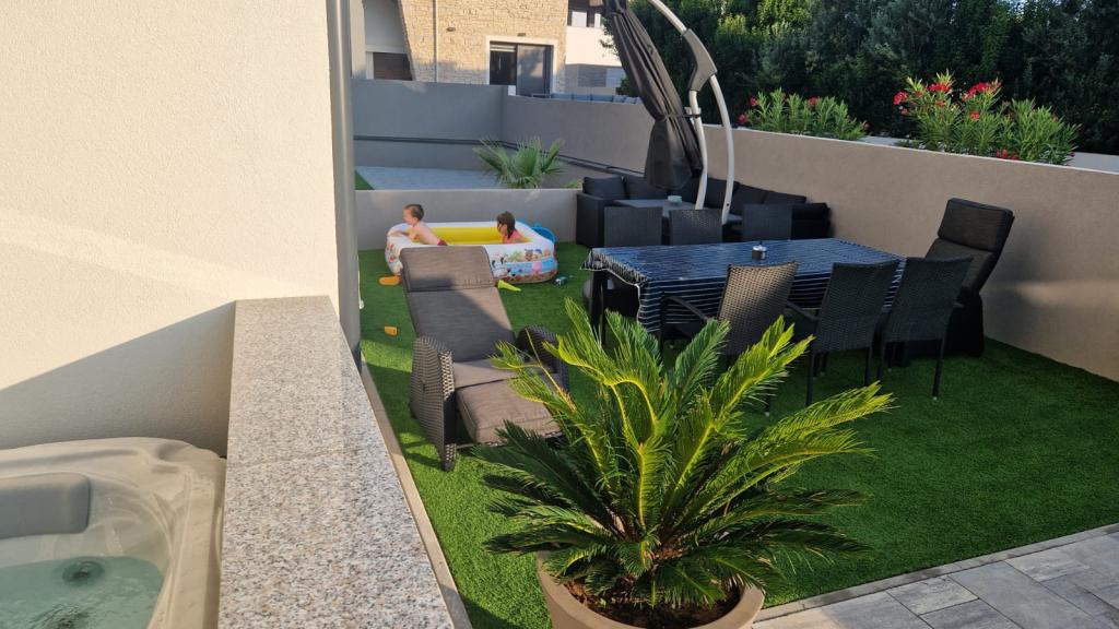 Apartman Neptun Zadar nalazi se u Privlaci, u prizemlju zgrade u novogradnji. Objekt ima jednu spavacu sobu i otvoren tlocrt kuhinje s dnevnim boravkom, izlazom na balkon (12m2) i dvoriste/vrt velicine 60m2 djelomično natkriveno sa ostakljenom pergolom, s rostiljem, suncobranom,solarnim tusem i jaccuzzijem. S dvorista se pruza djelomican pogled na more. Objekt se nalazi 2 min hoda od pjescane plaze. Idealno za obitelji s djecom.