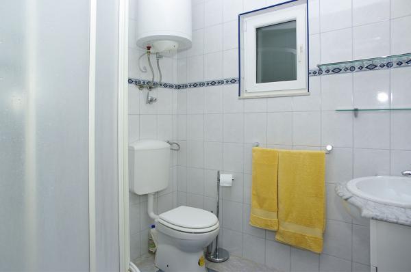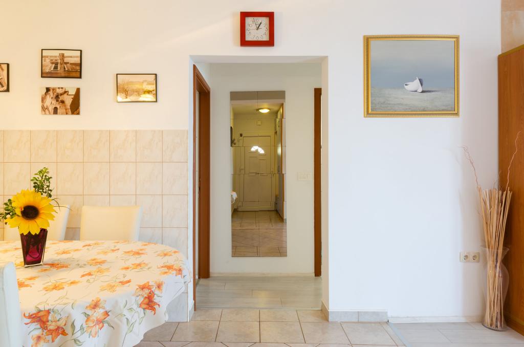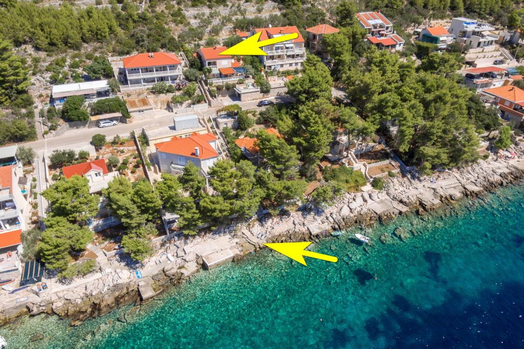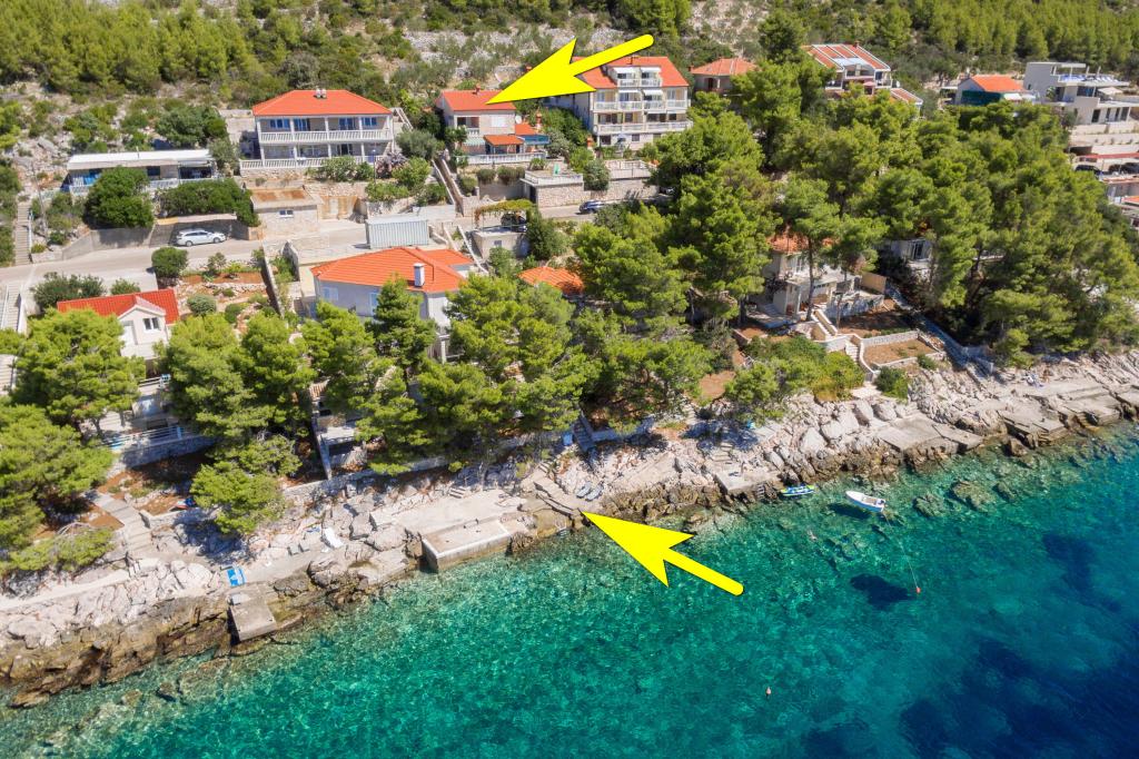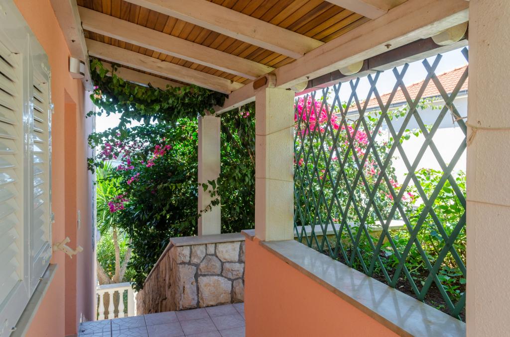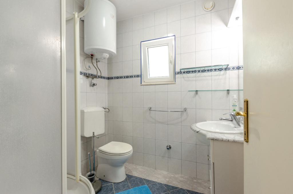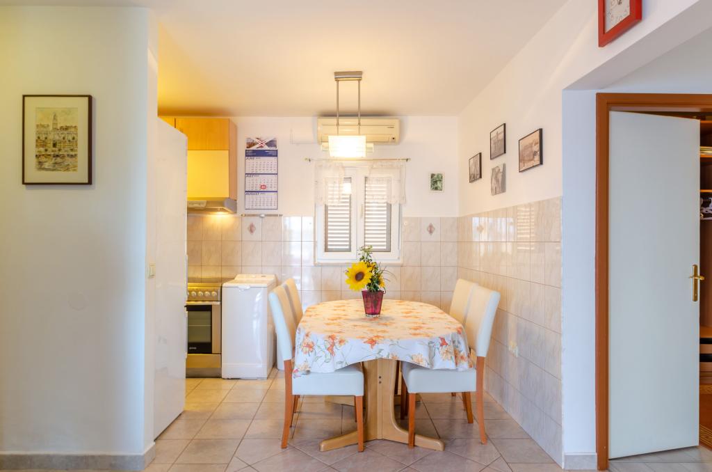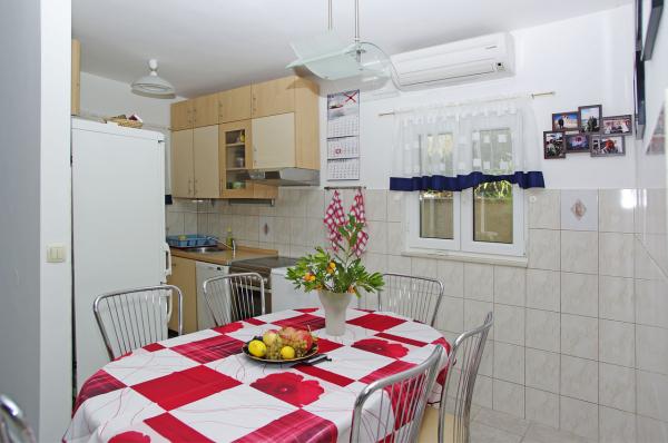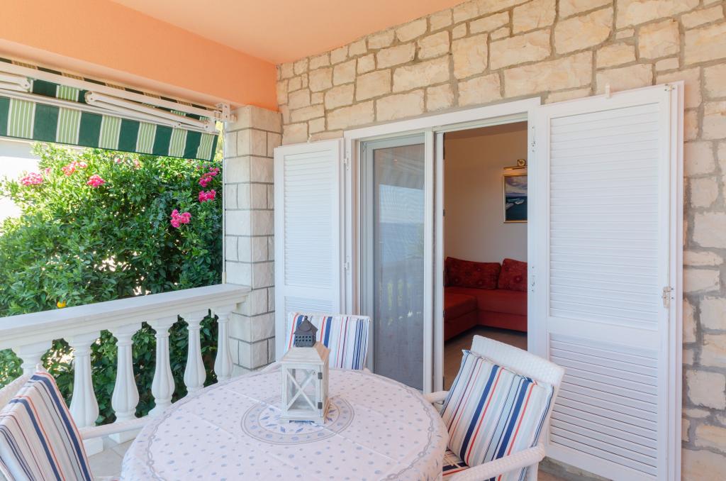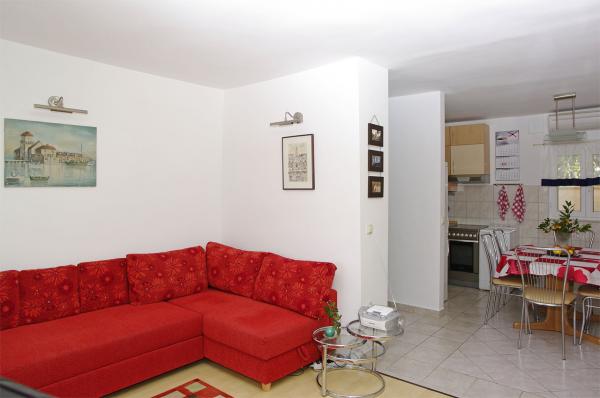 Apartman u obiteljskoj kuci ,orijentacija sjever-jug, od mora udaljen 30m , nalazi se na prvom katu.Sastoji se od dvije spavace sobe , dnevnog boravka/blagovaone s kuhinjom, manje sobe za garderobu, kupaonice/WC te terase s pogledom na more od 12m2.U blizini apartmana nalazi se prodavaonica mjesovite robe, a laganom setnjom stize se do centra Prizbe cca.400m do svih ostalih sadrzaja.
