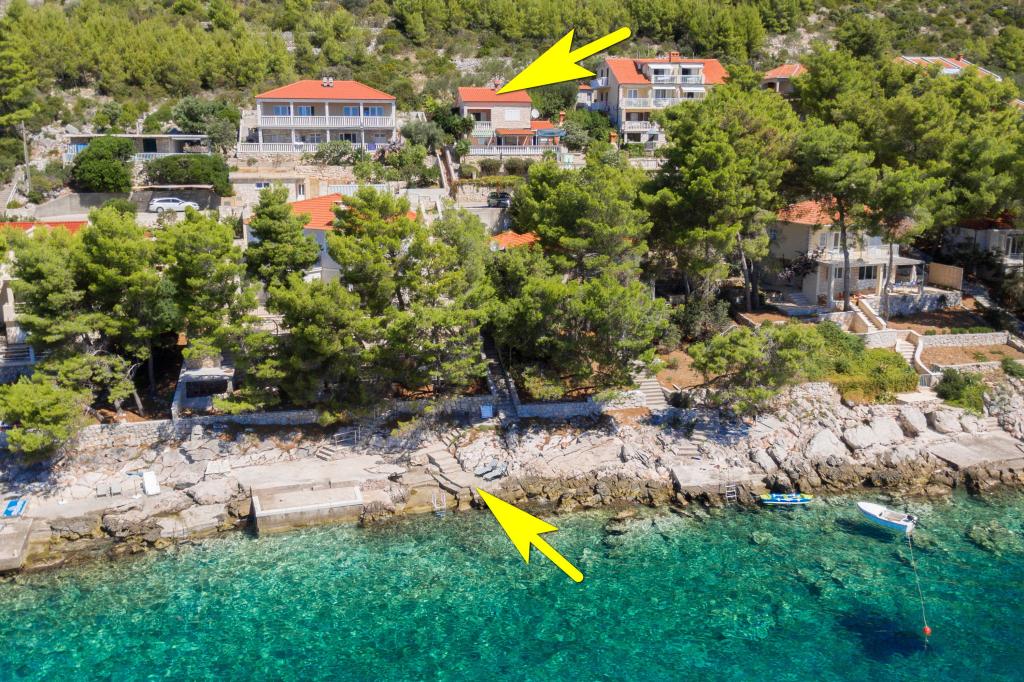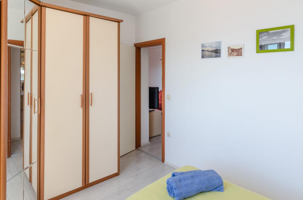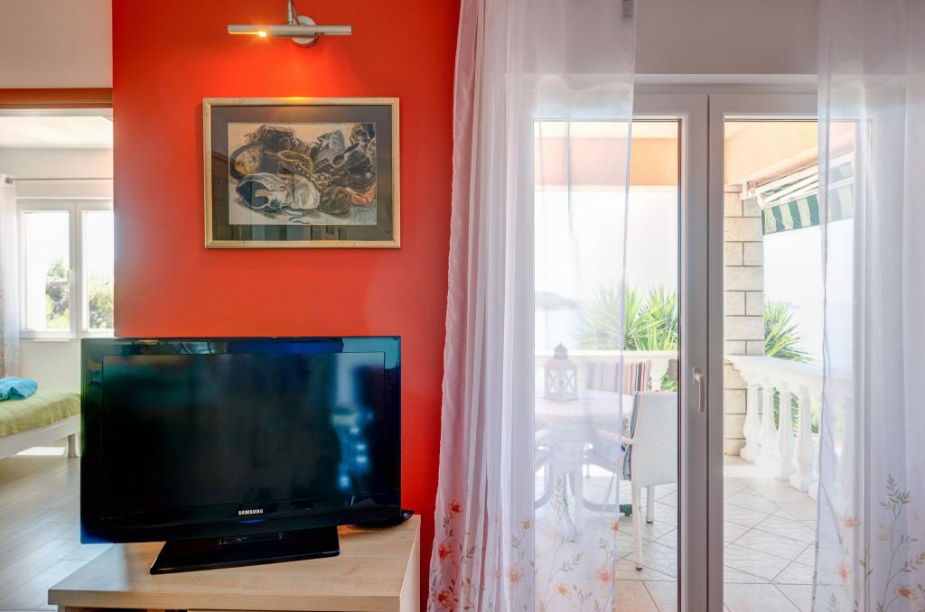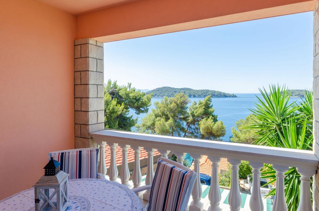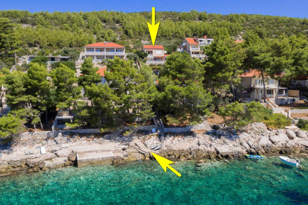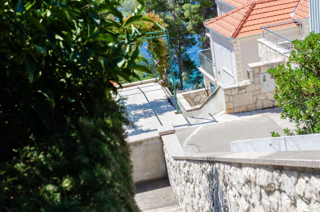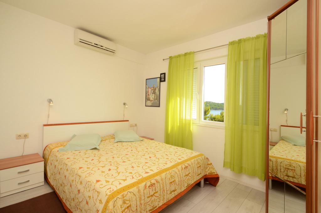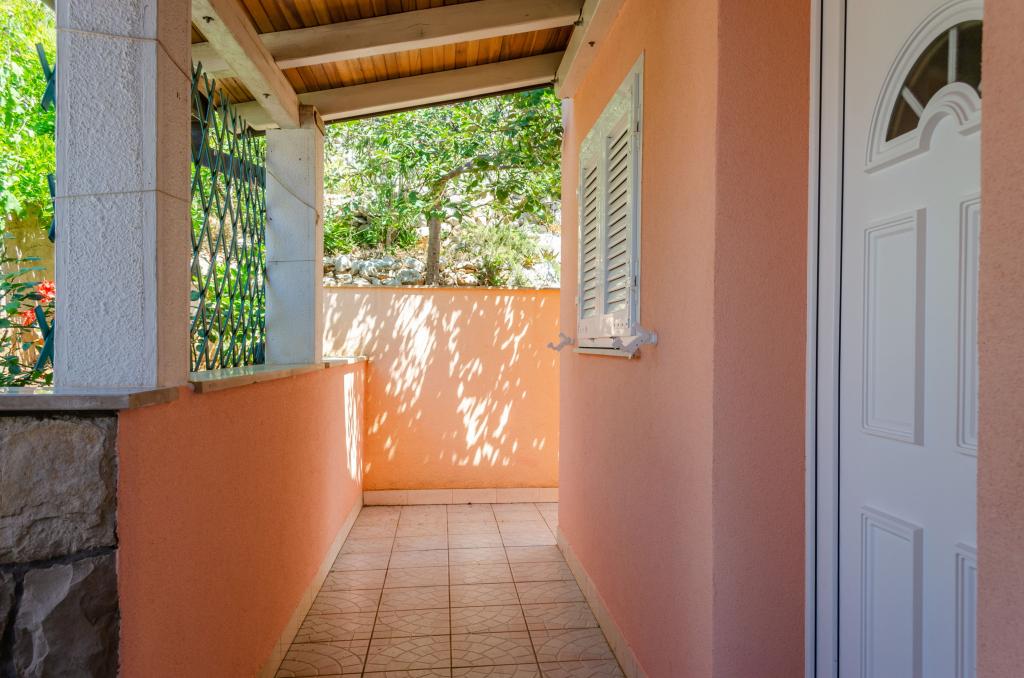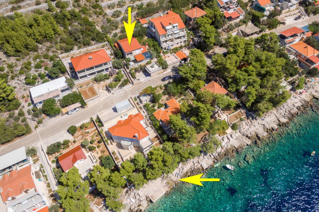 Apartman u obiteljskoj kuci ,orijentacija sjever-jug, od mora udaljen 30m , nalazi se na prvom katu.Sastoji se od dvije spavace sobe , dnevnog boravka/blagovaone s kuhinjom, manje sobe za garderobu, kupaonice/WC te terase s pogledom na more od 12m2.U blizini apartmana nalazi se prodavaonica mjesovite robe, a laganom setnjom stize se do centra Prizbe cca.400m do svih ostalih sadrzaja.