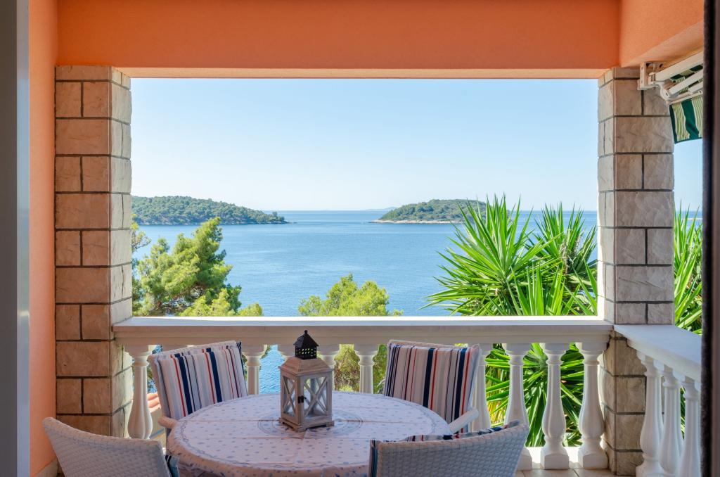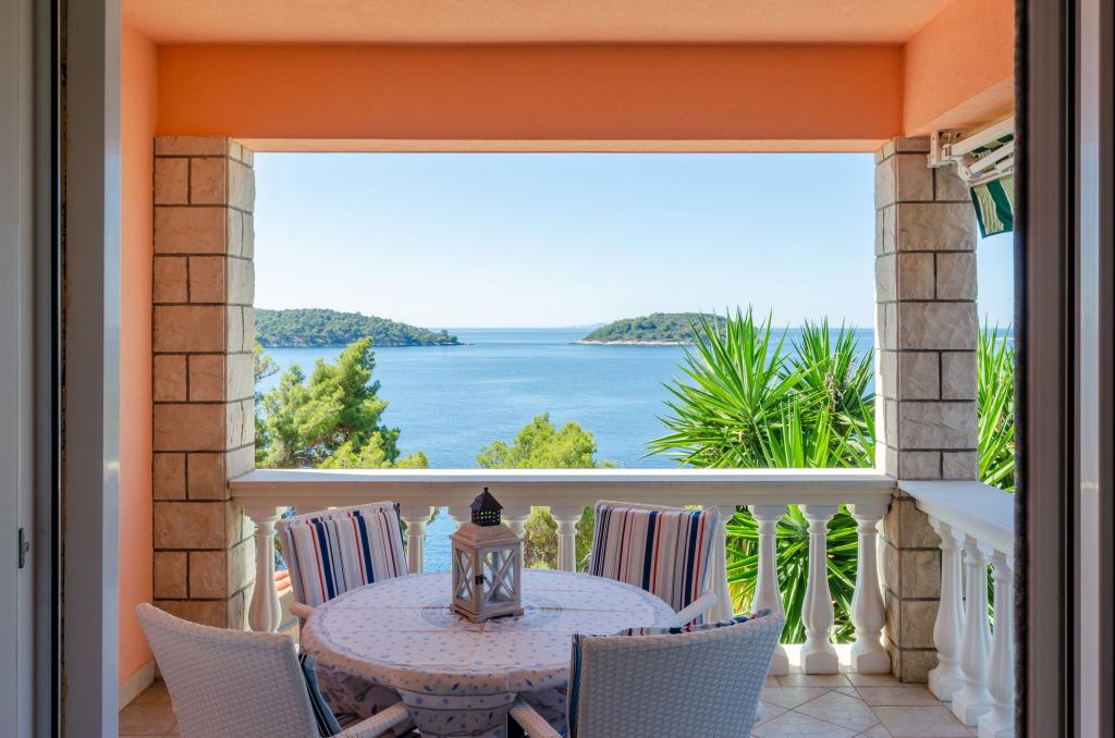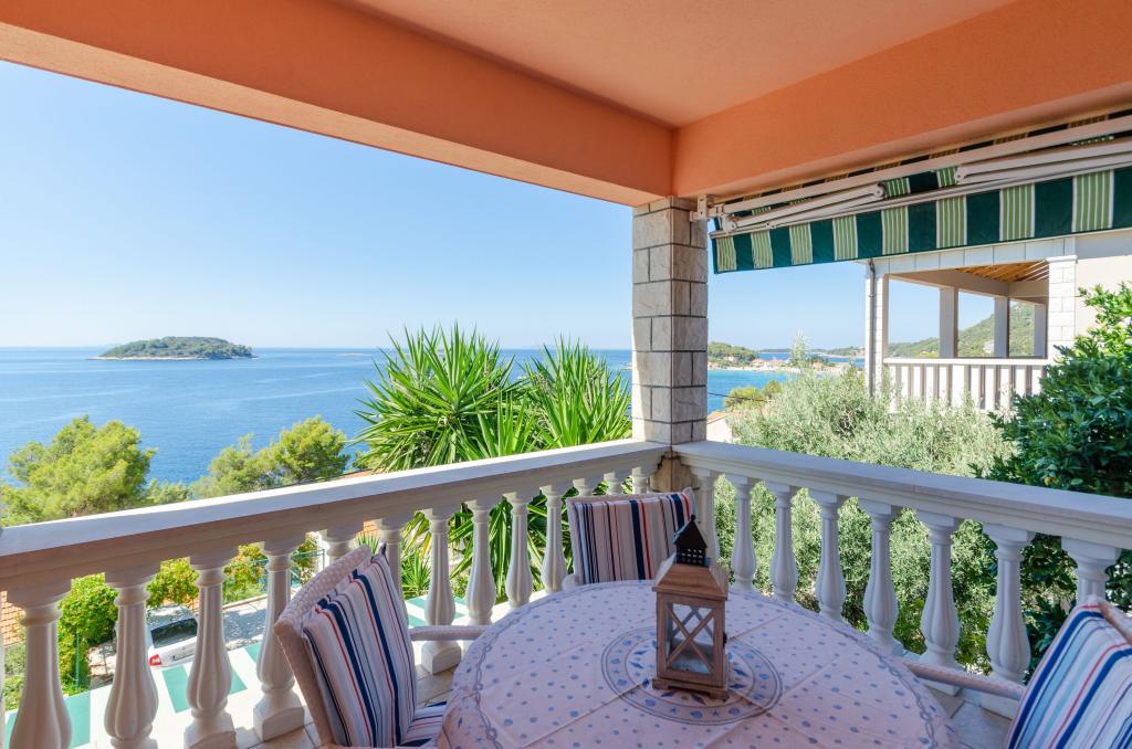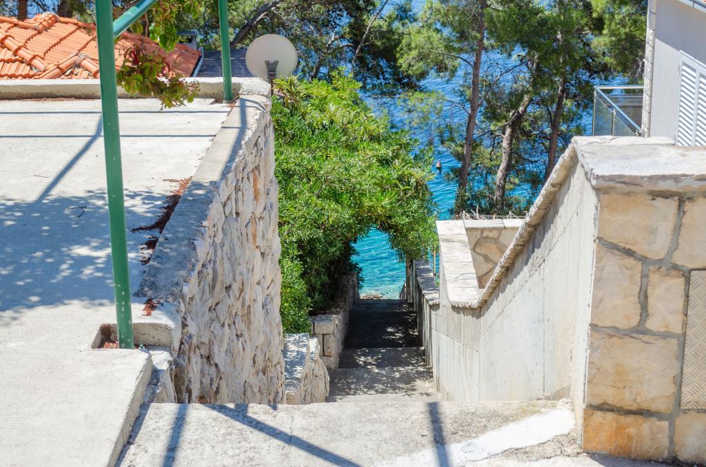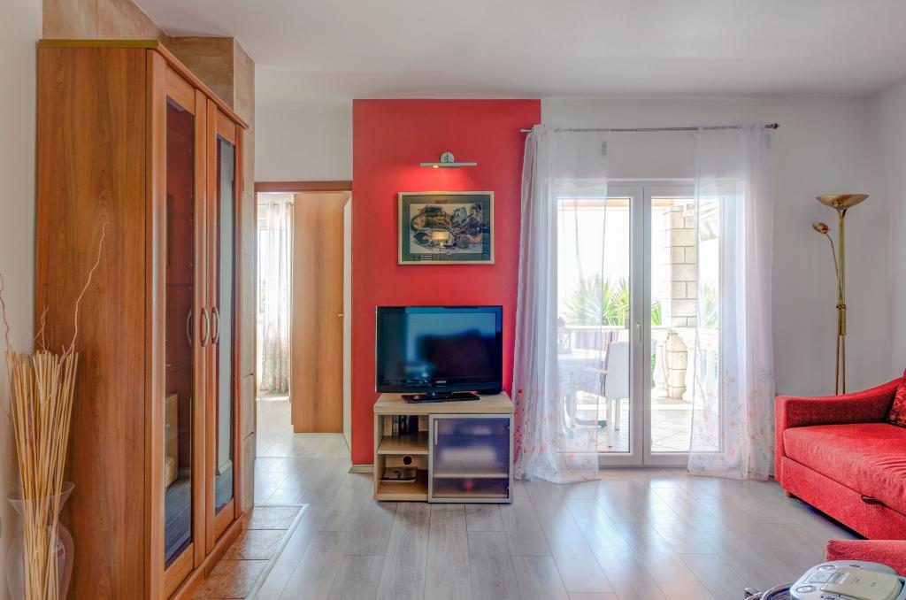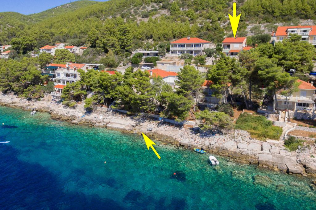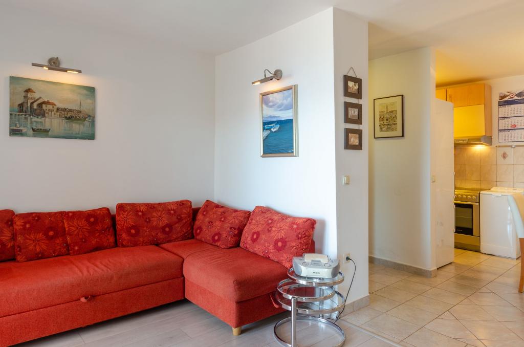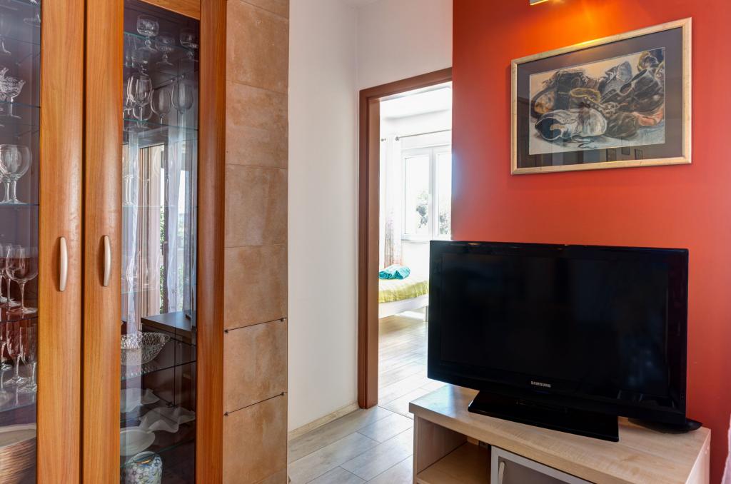 Apartman u obiteljskoj kuci ,orijentacija sjever-jug, od mora udaljen 30m , nalazi se na prvom katu.Sastoji se od dvije spavace sobe , dnevnog boravka/blagovaone s kuhinjom, manje sobe za garderobu, kupaonice/WC te terase s pogledom na more od 12m2.U blizini apartmana nalazi se prodavaonica mjesovite robe, a laganom setnjom stize se do centra Prizbe cca.400m do svih ostalih sadrzaja.