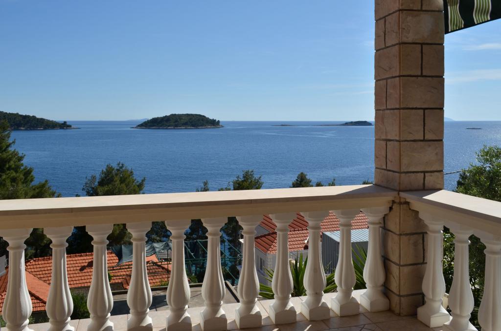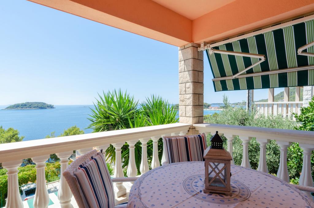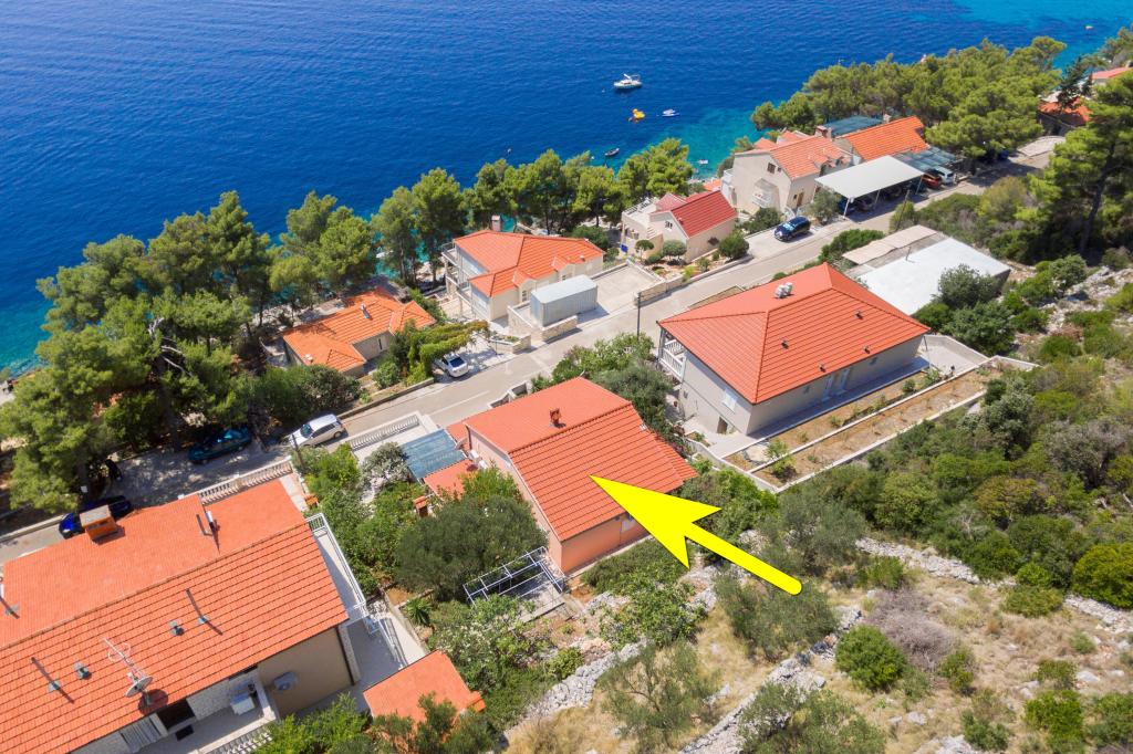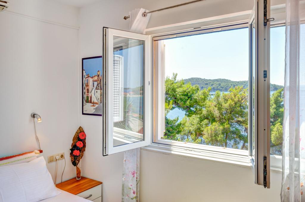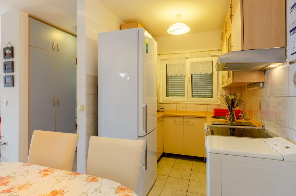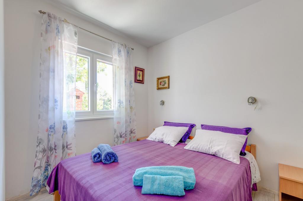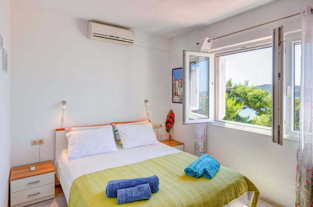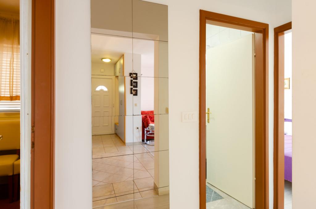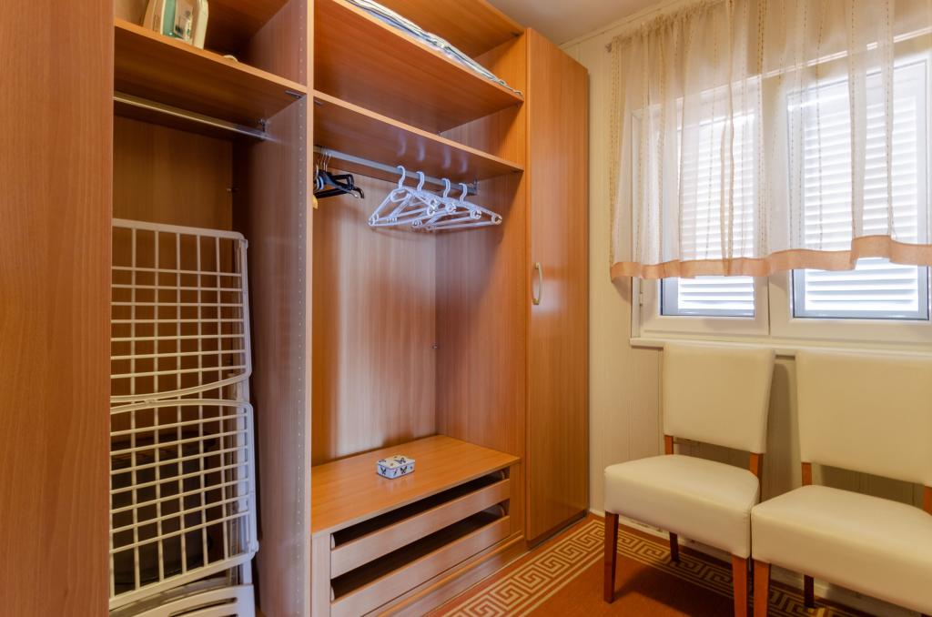 Apartman u obiteljskoj kuci ,orijentacija sjever-jug, od mora udaljen 30m , nalazi se na prvom katu.Sastoji se od dvije spavace sobe , dnevnog boravka/blagovaone s kuhinjom, manje sobe za garderobu, kupaonice/WC te terase s pogledom na more od 12m2.U blizini apartmana nalazi se prodavaonica mjesovite robe, a laganom setnjom stize se do centra Prizbe cca.400m do svih ostalih sadrzaja.