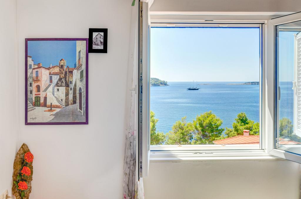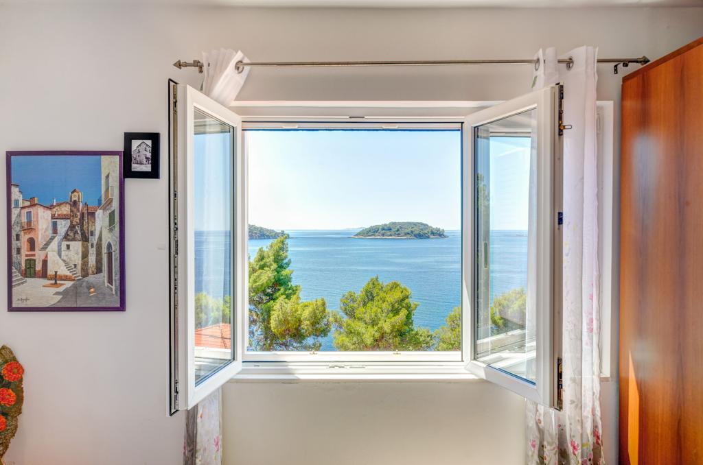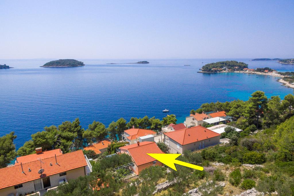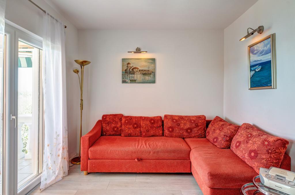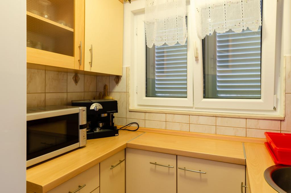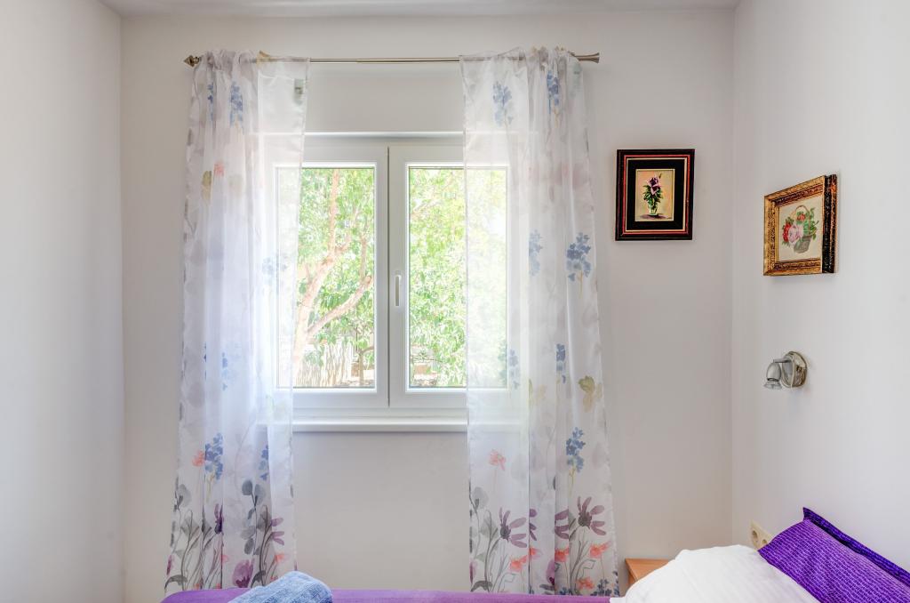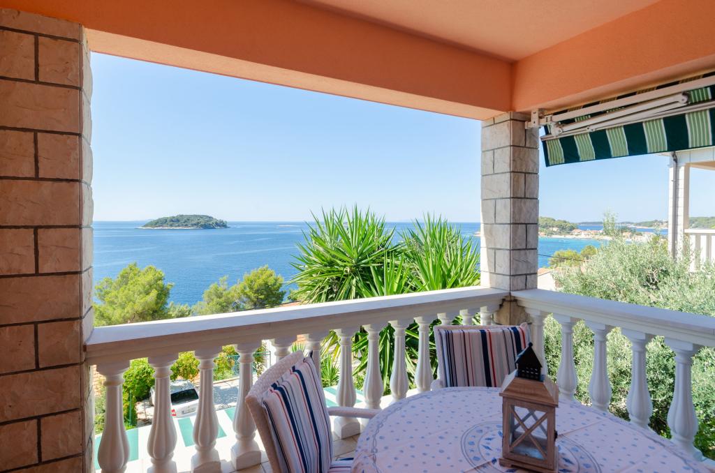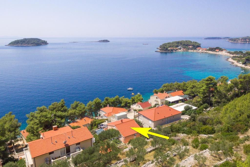 Apartman u obiteljskoj kuci ,orijentacija sjever-jug, od mora udaljen 30m , nalazi se na prvom katu.Sastoji se od dvije spavace sobe , dnevnog boravka/blagovaone s kuhinjom, manje sobe za garderobu, kupaonice/WC te terase s pogledom na more od 12m2.U blizini apartmana nalazi se prodavaonica mjesovite robe, a laganom setnjom stize se do centra Prizbe cca.400m do svih ostalih sadrzaja.