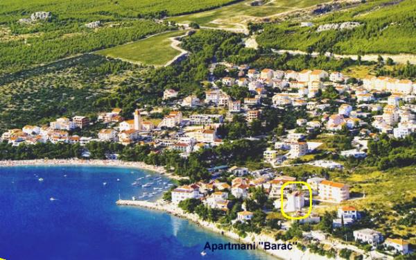 Apartmani Barać su smješteni u mirnom okruženju, imaju prekrasan pogled na more, a od središta mjesta i duge šljunčane plaže su udaljeni oko 150 metara. U kući nudimo studio apartmane i apartmane sa odvojenom spavaćom sobom, kategorije tri zvjezdice. Svi apartmani su klimatizirani, imaju zasebno kupatilo, kuhinju, satelitsku TV i bežični Internet. Kuhinje su opremljene hladnjakom i standardnim kuhinjskim priborom i posuđem, a postoji i mogućnost korištenja vanjskog grila. Dobar izbor za sve one koji žele boraviti u mirnom okruženju, blizu svoje plaže snova.