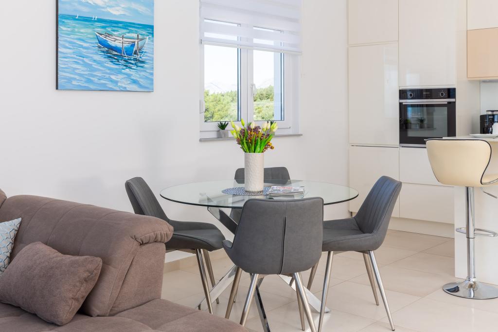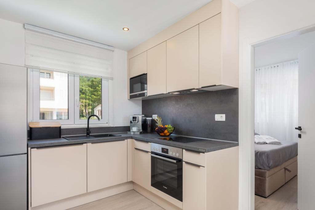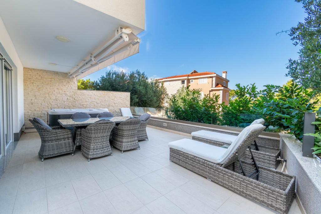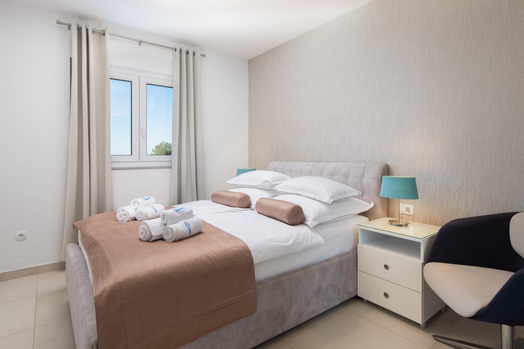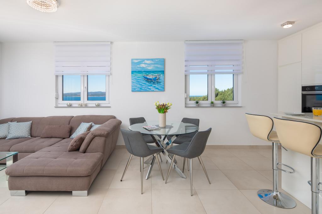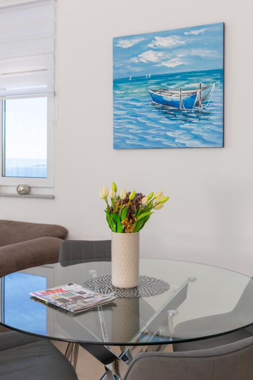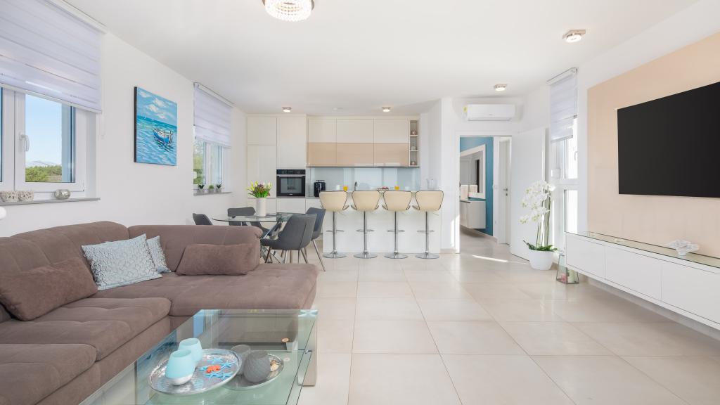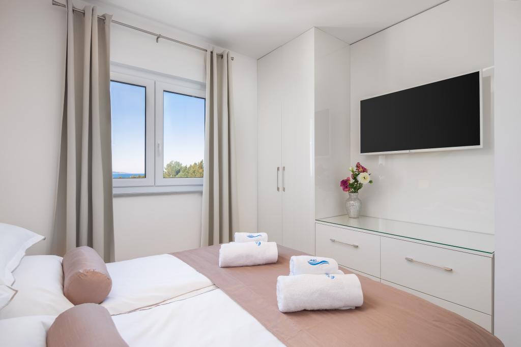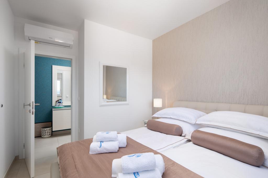 Apartman su opremljeni vrhunskim namještajem i uređajima. Apartman u prizemlju ima elektroničku tendu i dodatni vanjski tuš.