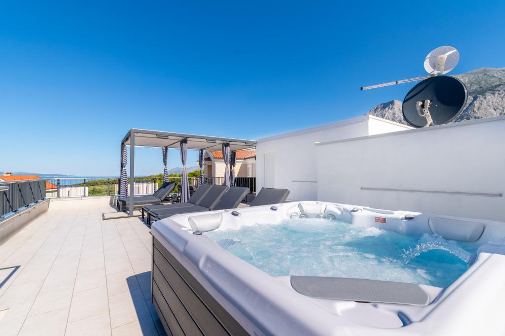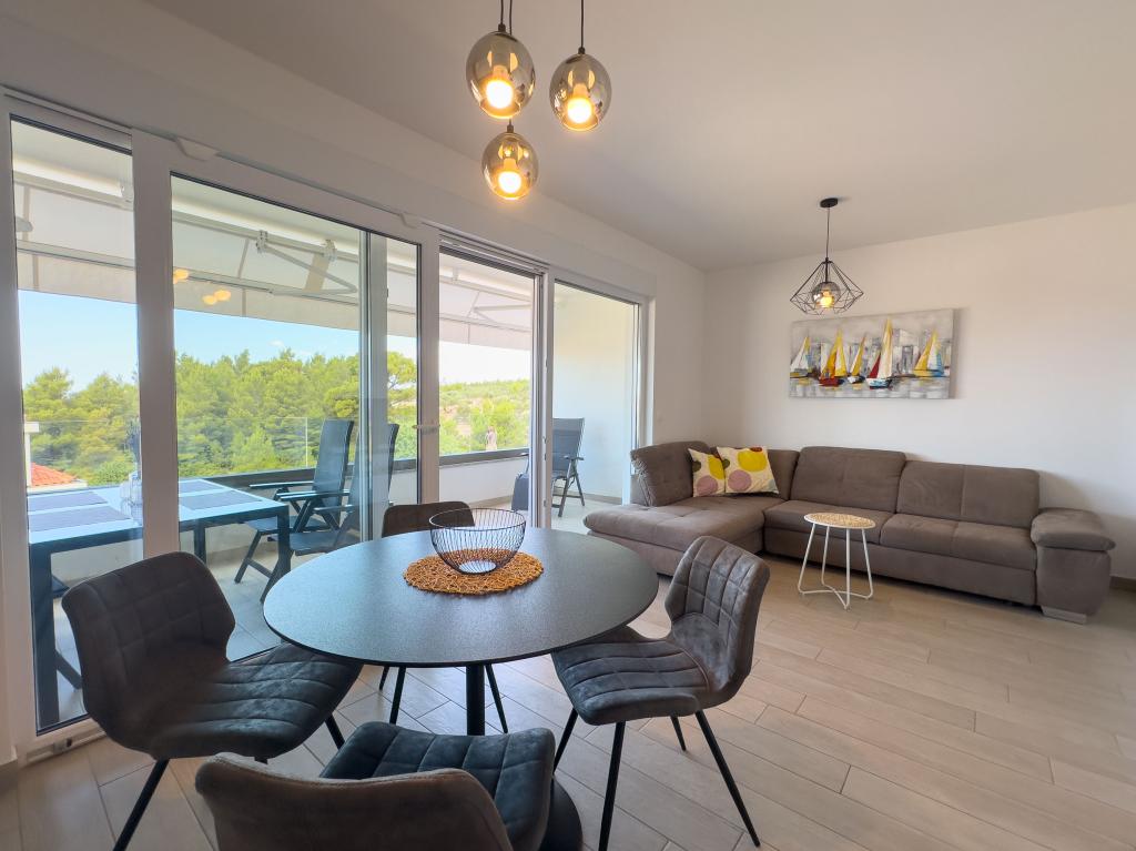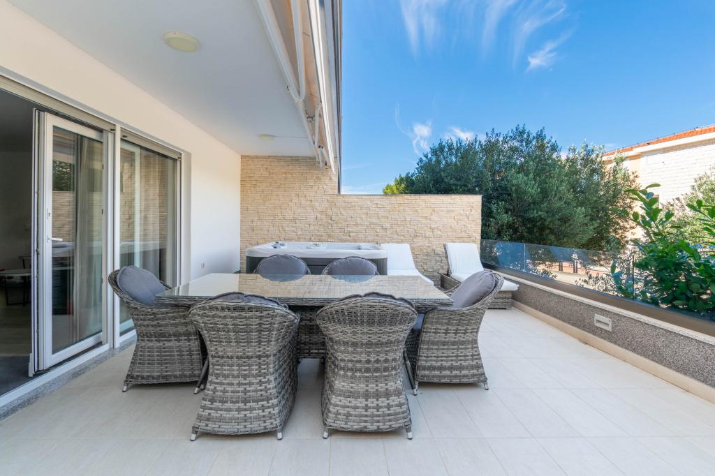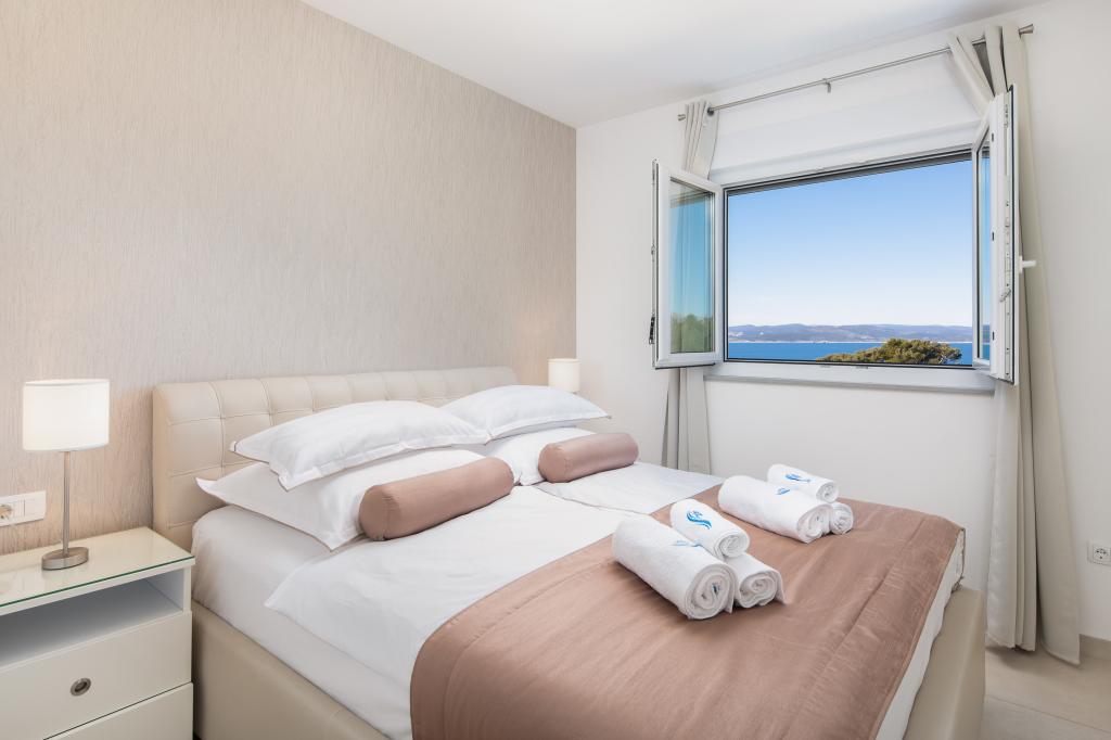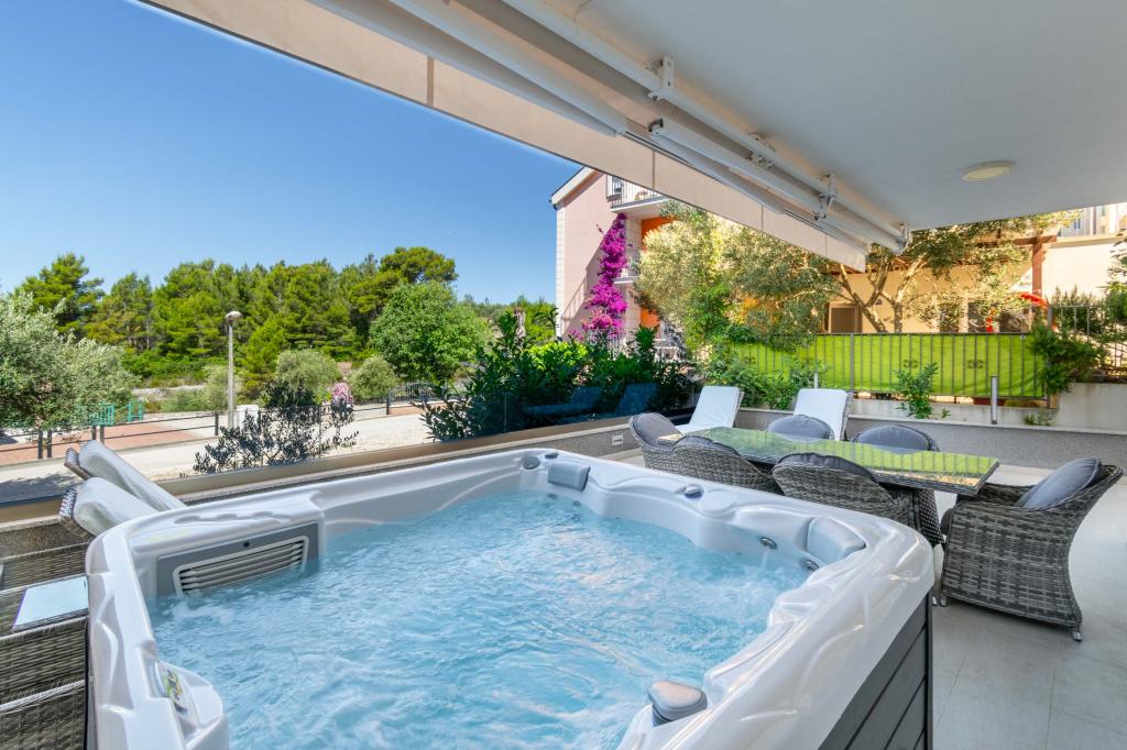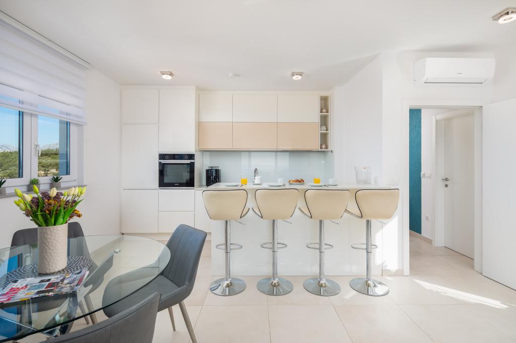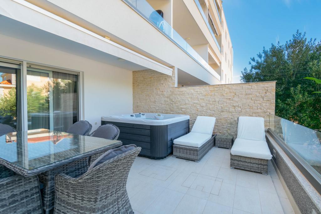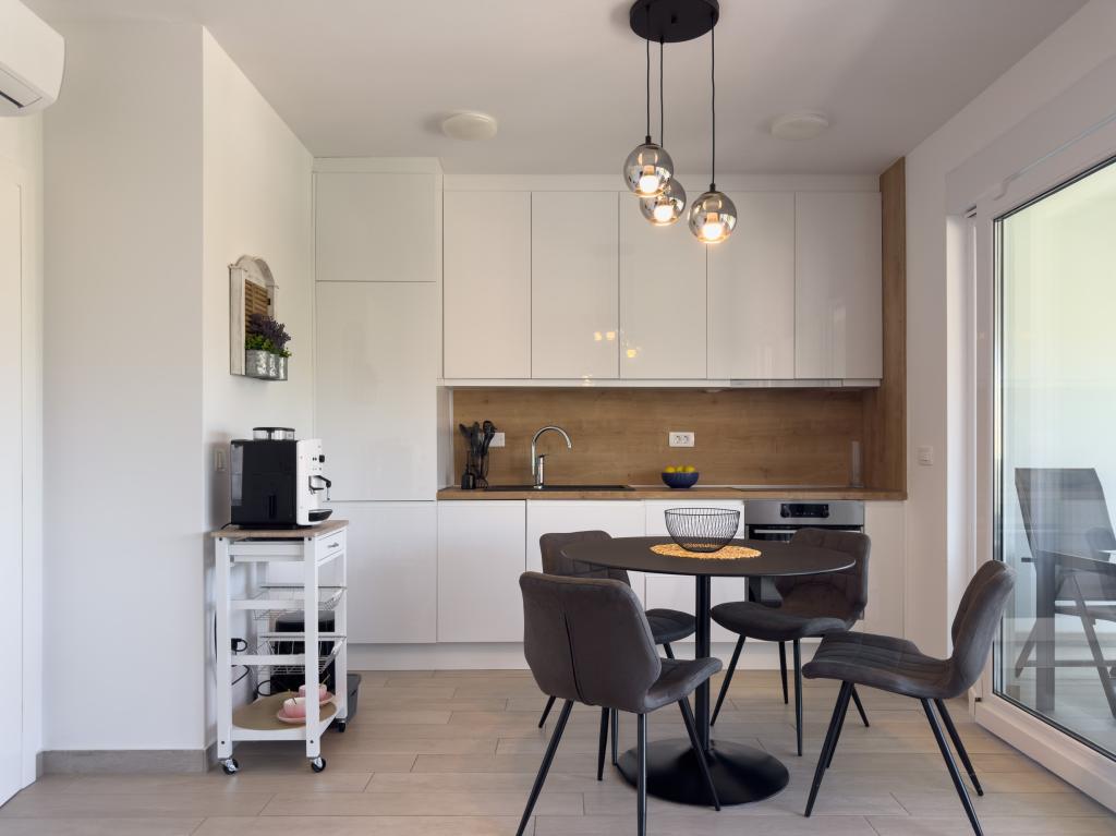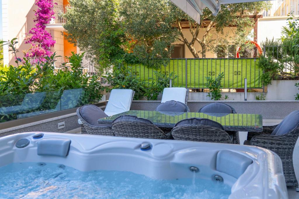 Apartman su opremljeni vrhunskim namještajem i uređajima. Apartman u prizemlju ima elektroničku tendu i dodatni vanjski tuš.