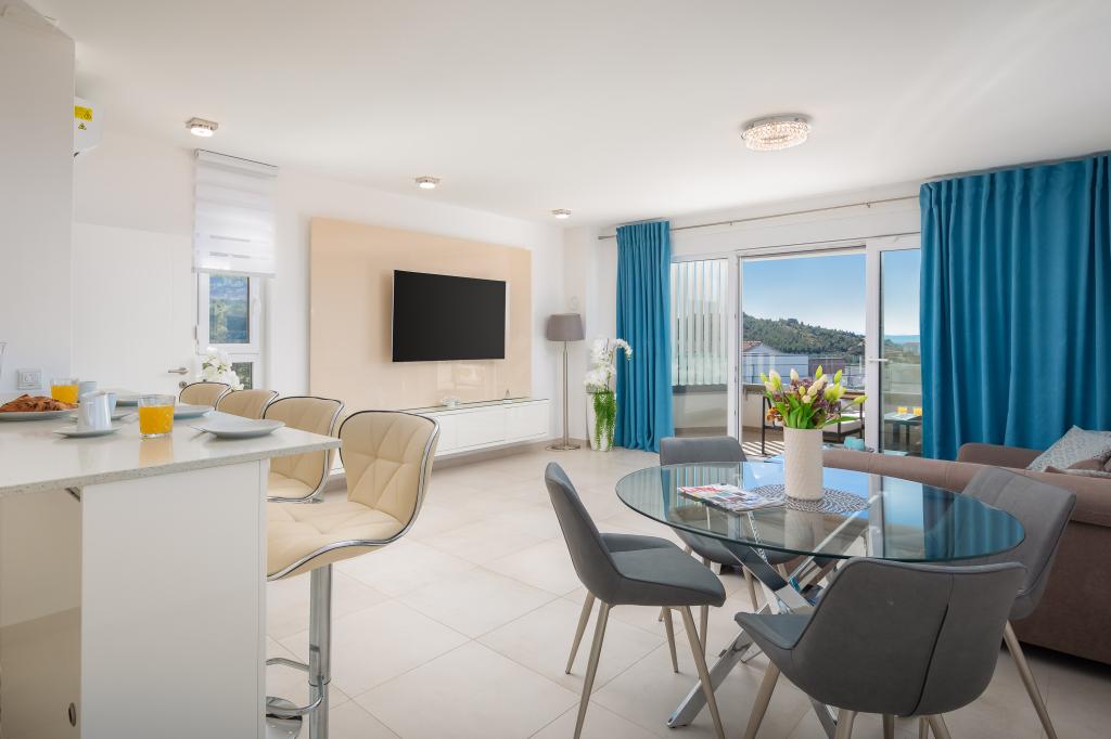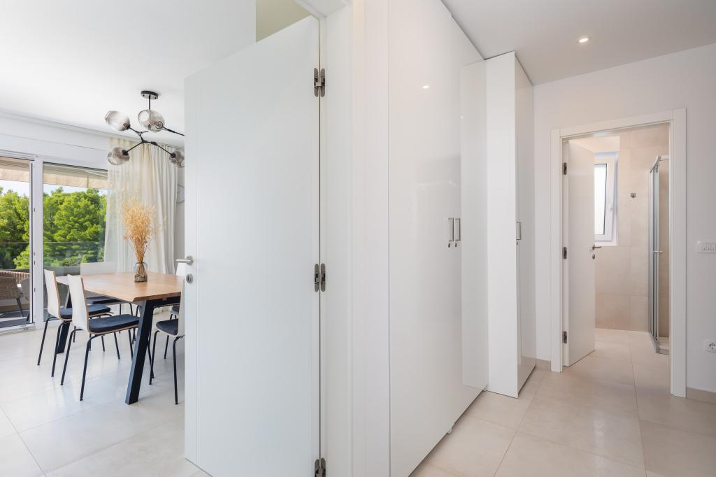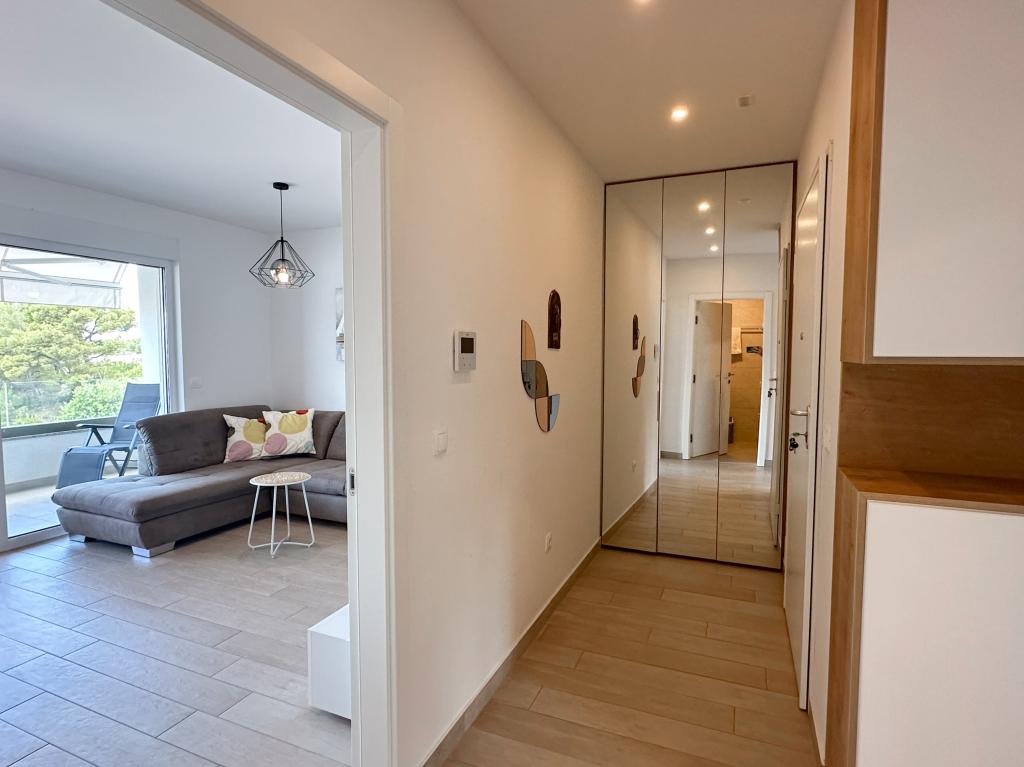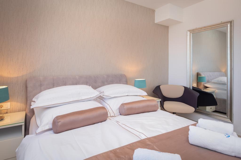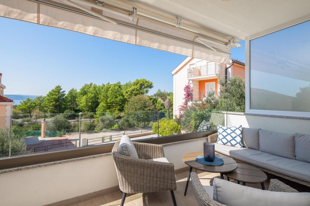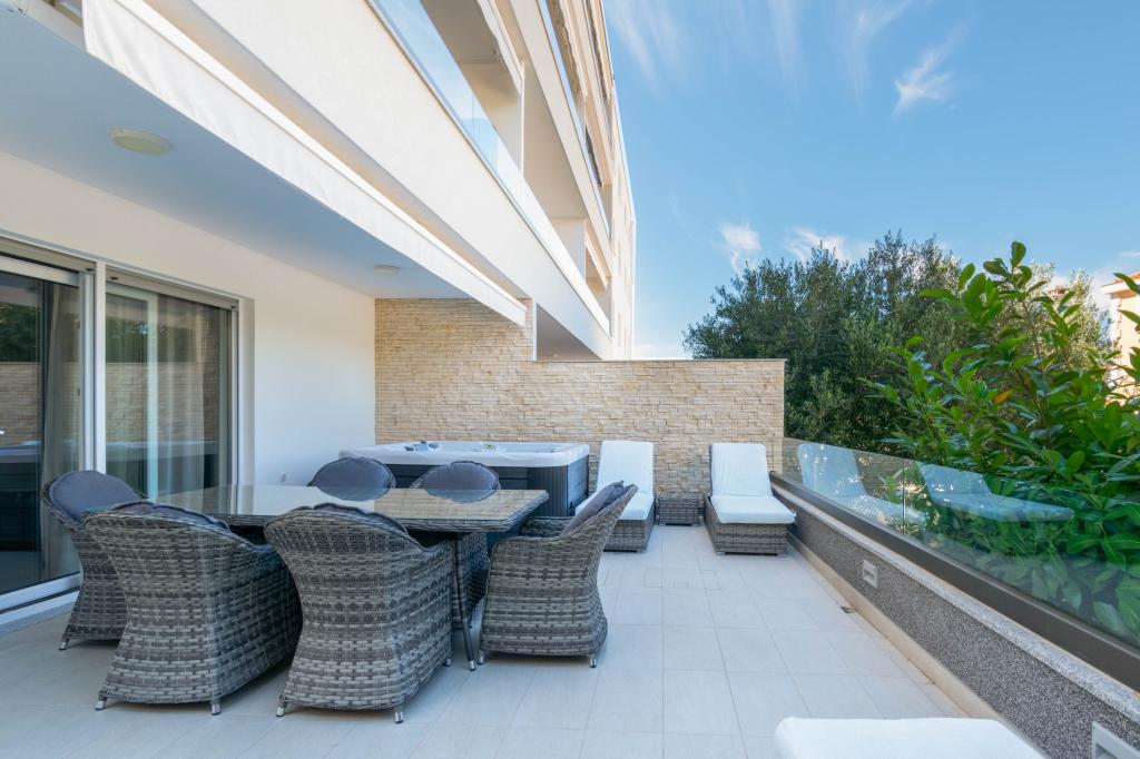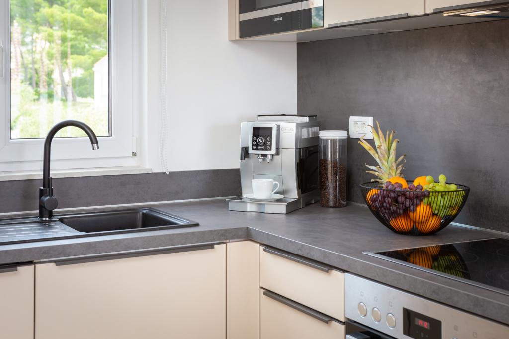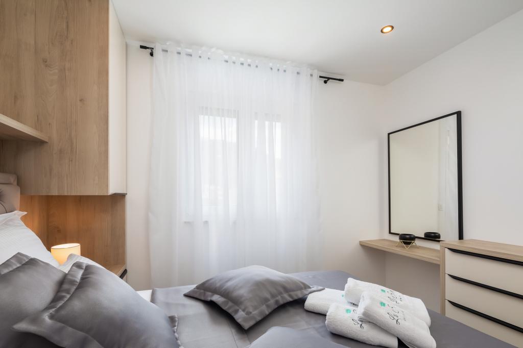 Apartman su opremljeni vrhunskim namještajem i uređajima. Apartman u prizemlju ima elektroničku tendu i dodatni vanjski tuš.
