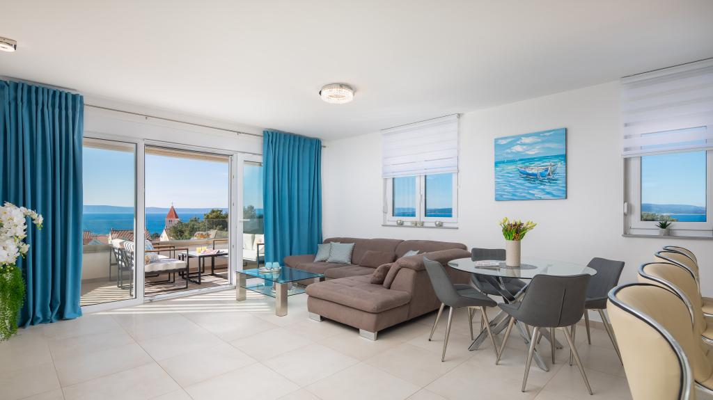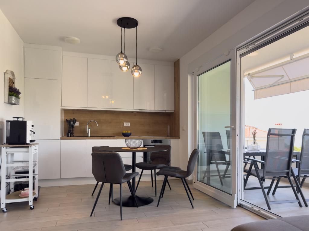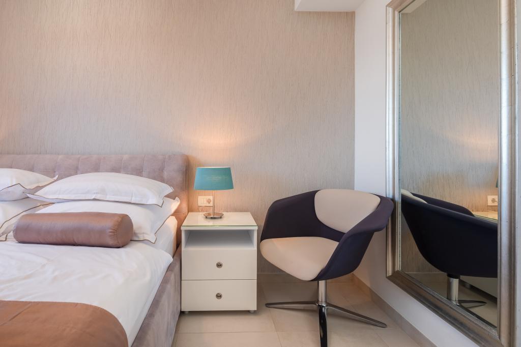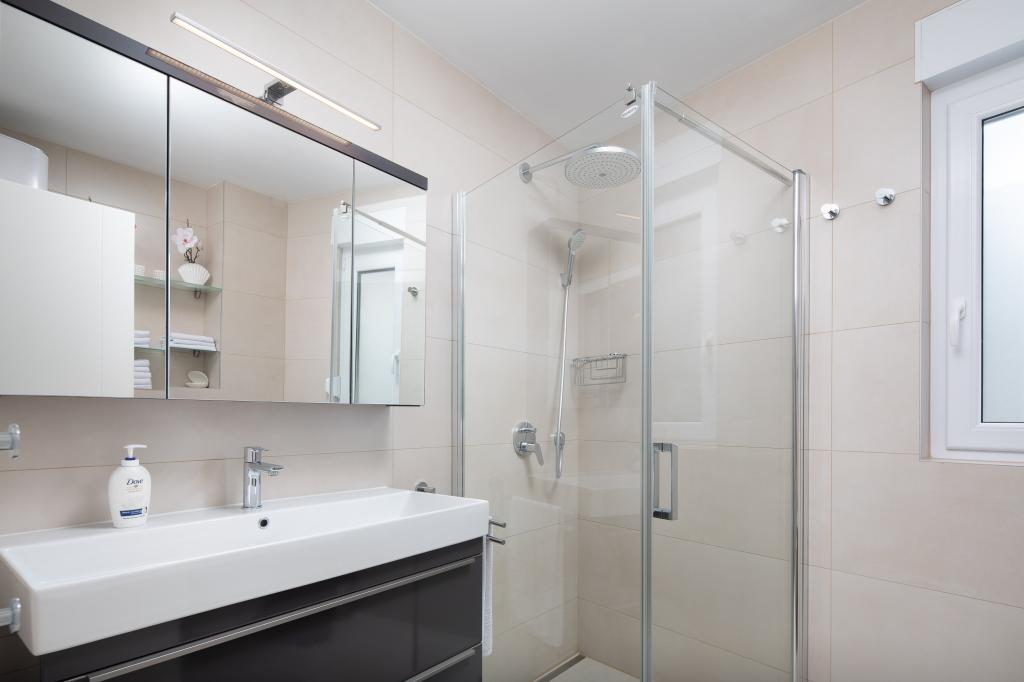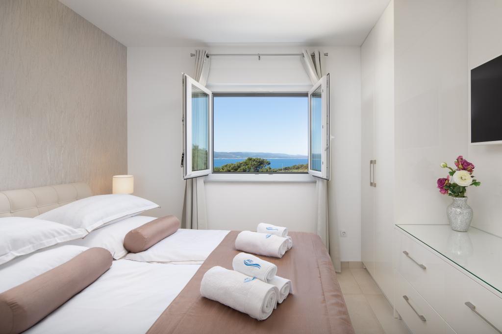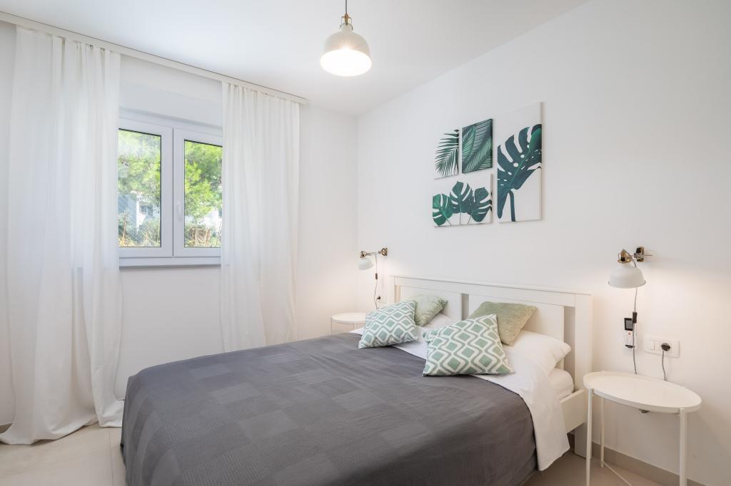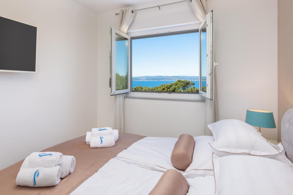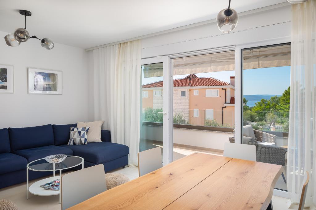 Apartman su opremljeni vrhunskim namještajem i uređajima. Apartman u prizemlju ima elektroničku tendu i dodatni vanjski tuš.