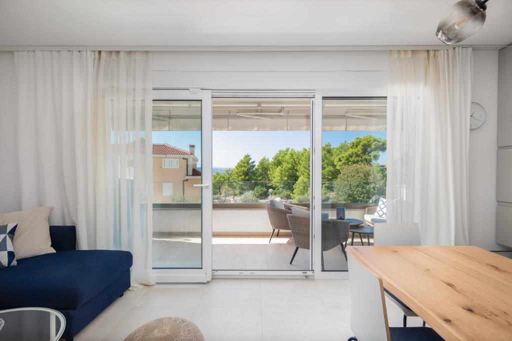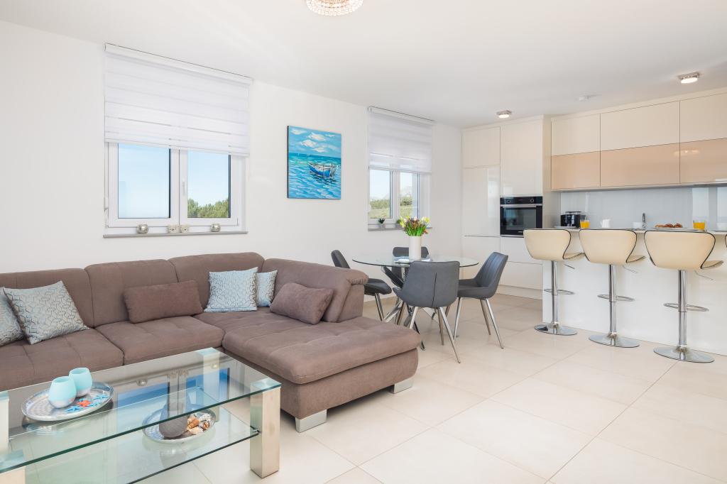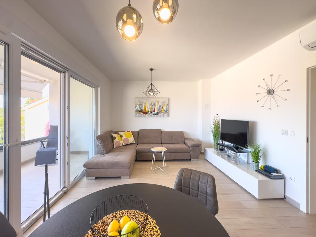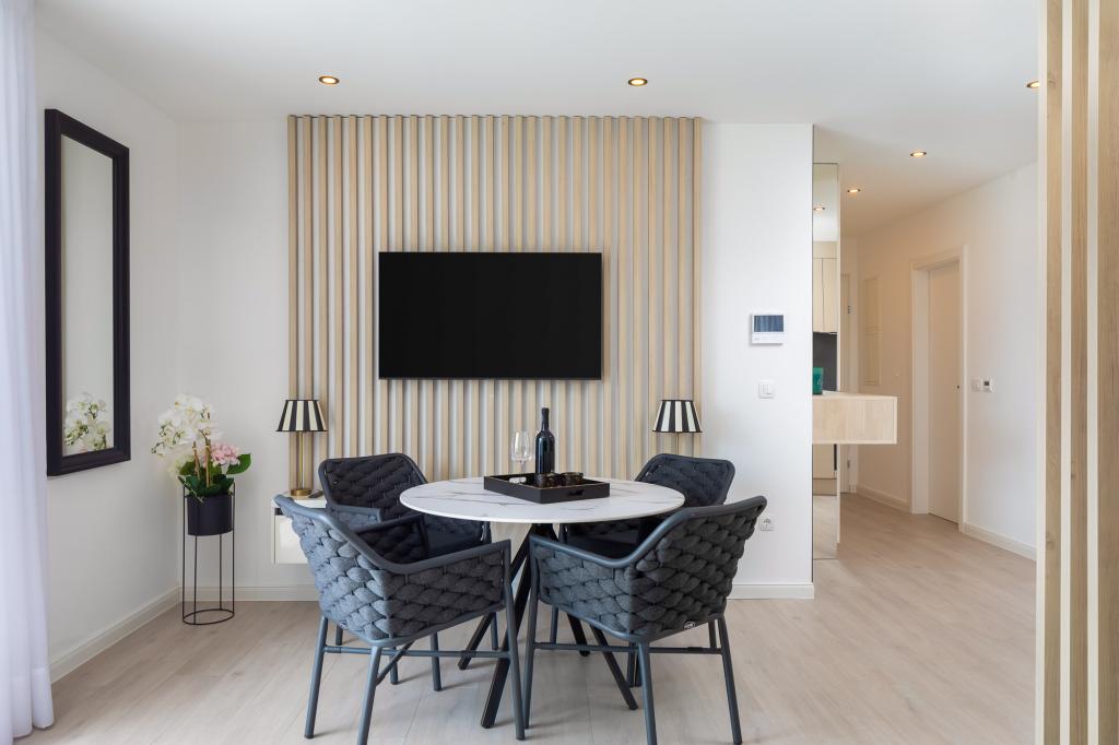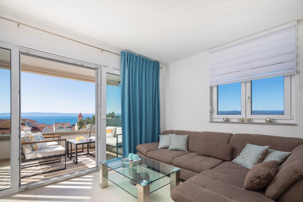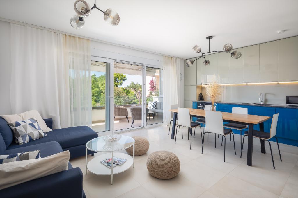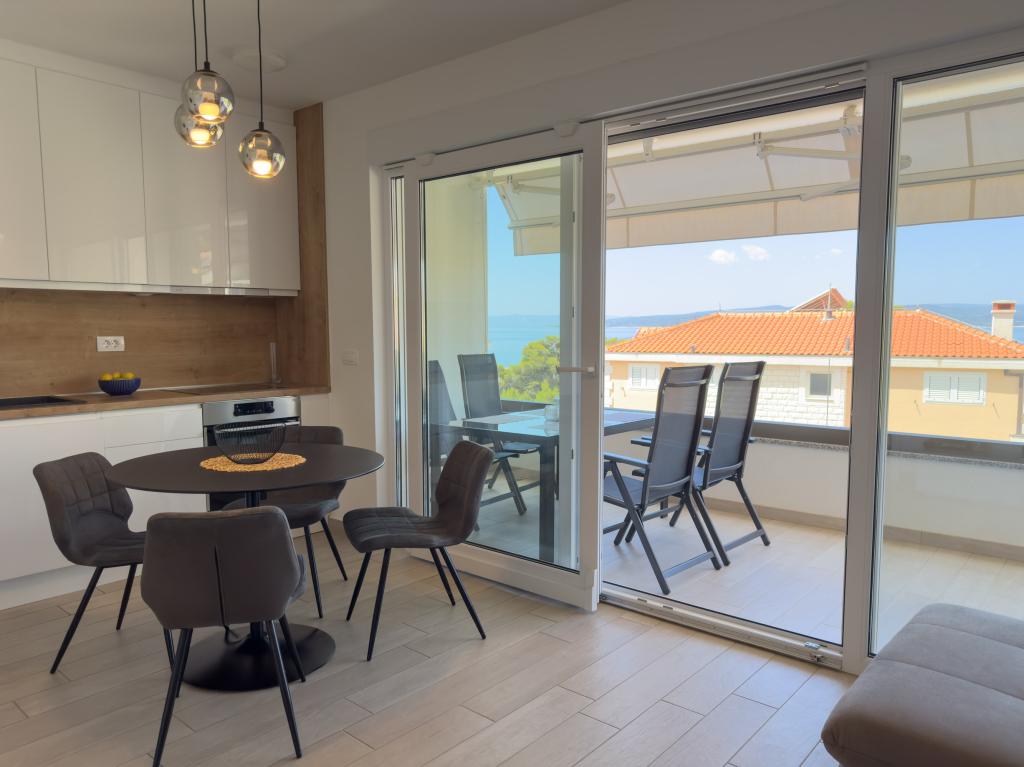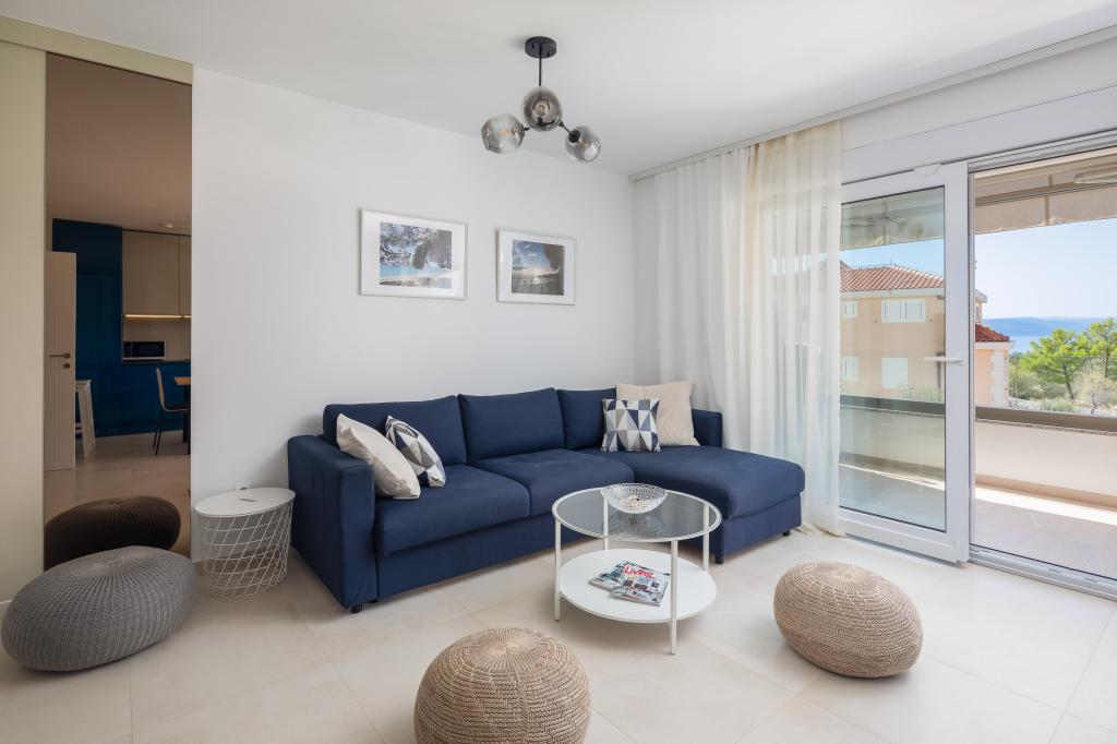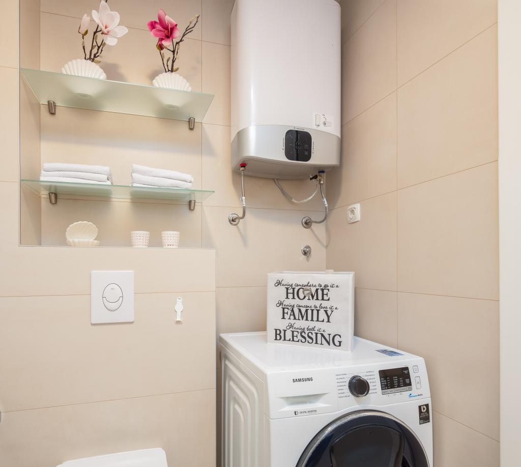 Apartman su opremljeni vrhunskim namještajem i uređajima. Apartman u prizemlju ima elektroničku tendu i dodatni vanjski tuš.