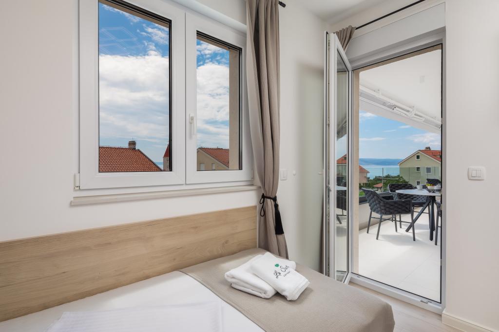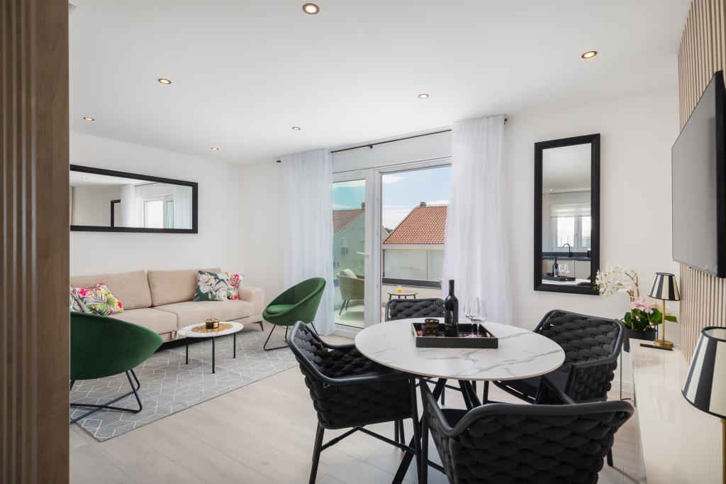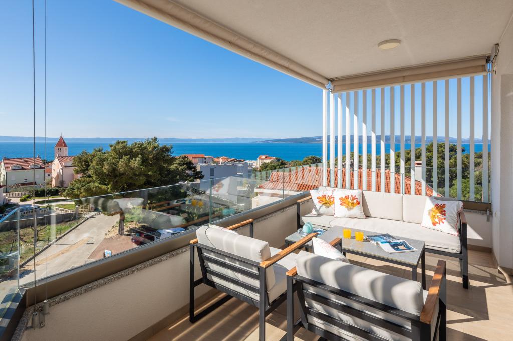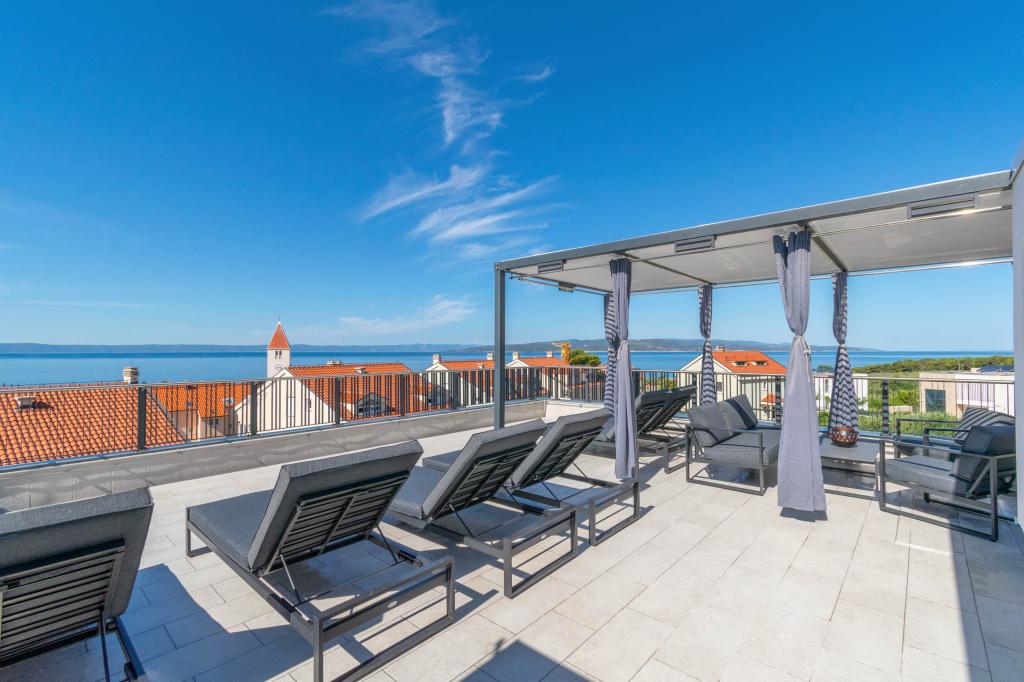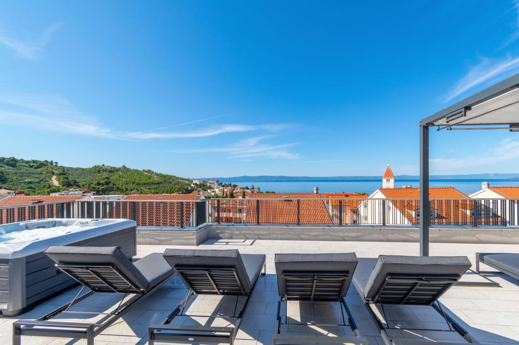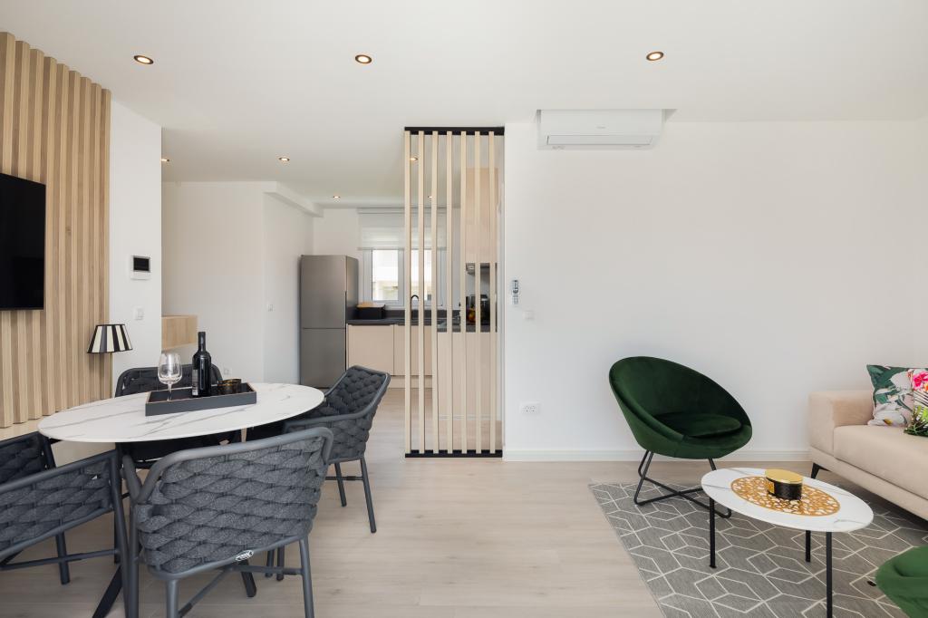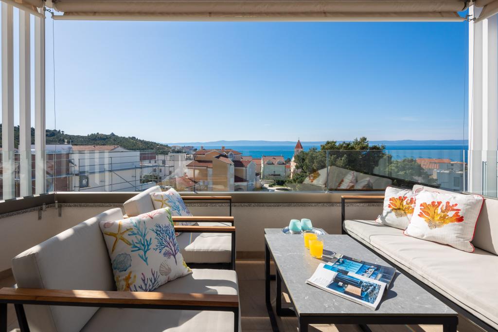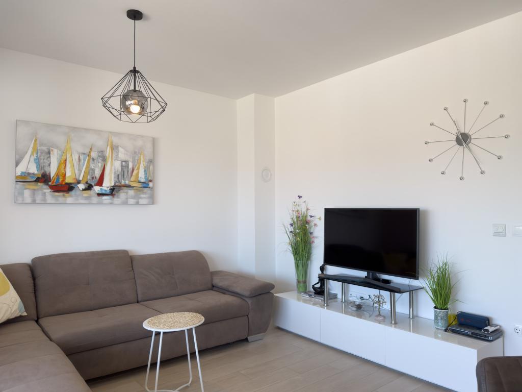 Apartman su opremljeni vrhunskim namještajem i uređajima. Apartman u prizemlju ima elektroničku tendu i dodatni vanjski tuš.